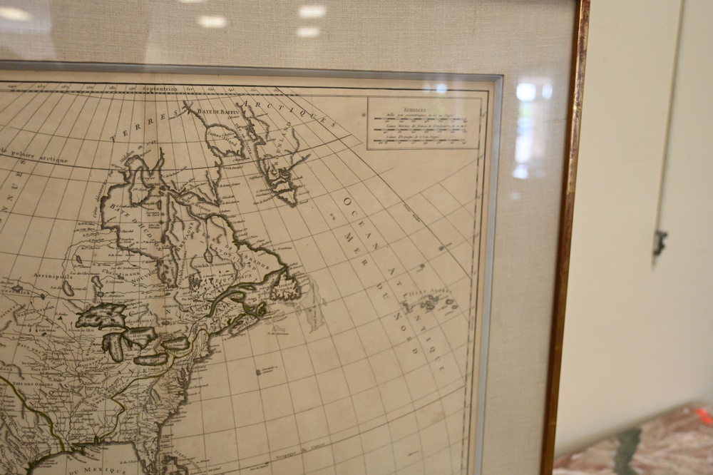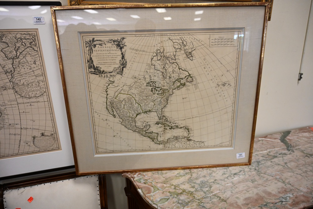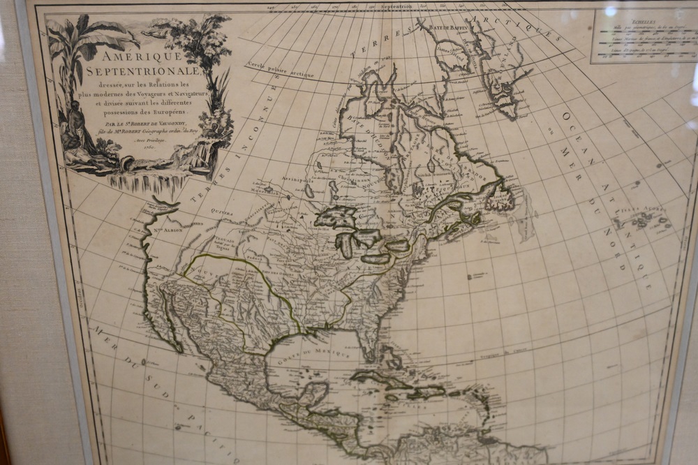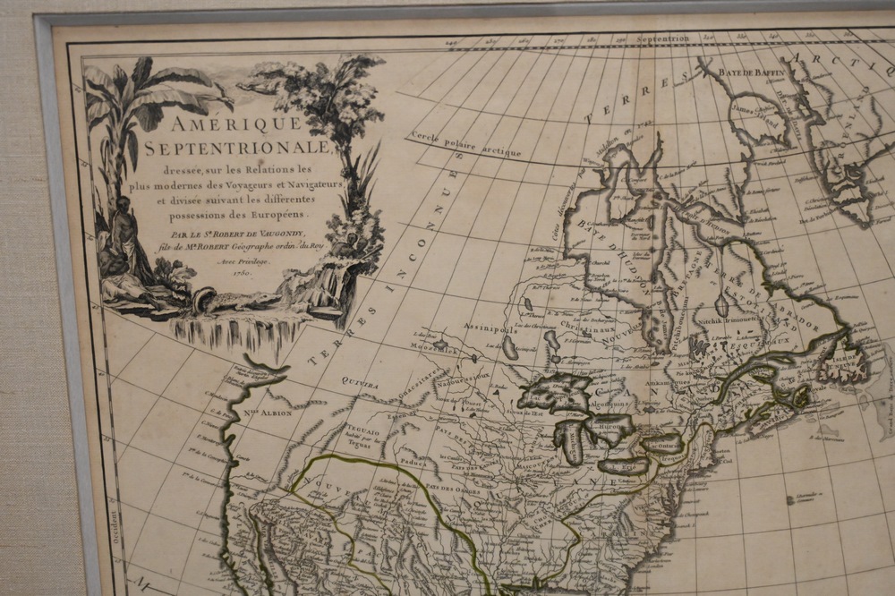 Lot 141: Robert de Vaugondy, “Amerique Septentrionale” engraving on paper with hand coloring of North America, circa 1750 or later, sight size 20″ x 24″.