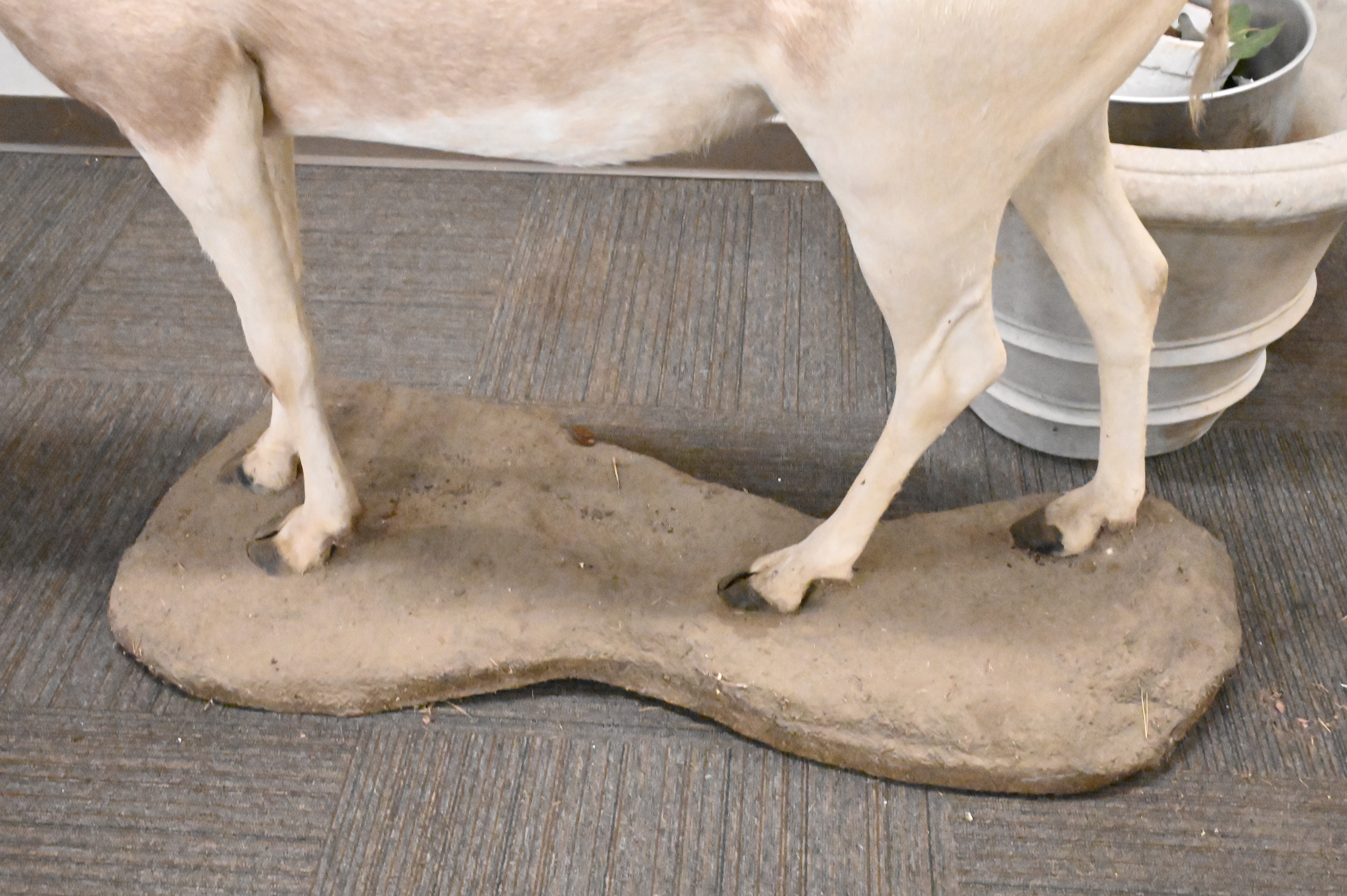 Full Body Addax (Antelope) Taxidermy, set on faux base, along with an extra pair of early antlers, native to the Sahara Desert, *This piece is endangered and can only be sold to state of Connecticut residents,approximate dimensions are a height of 54 inches, length 80 inches, width 24 inches.