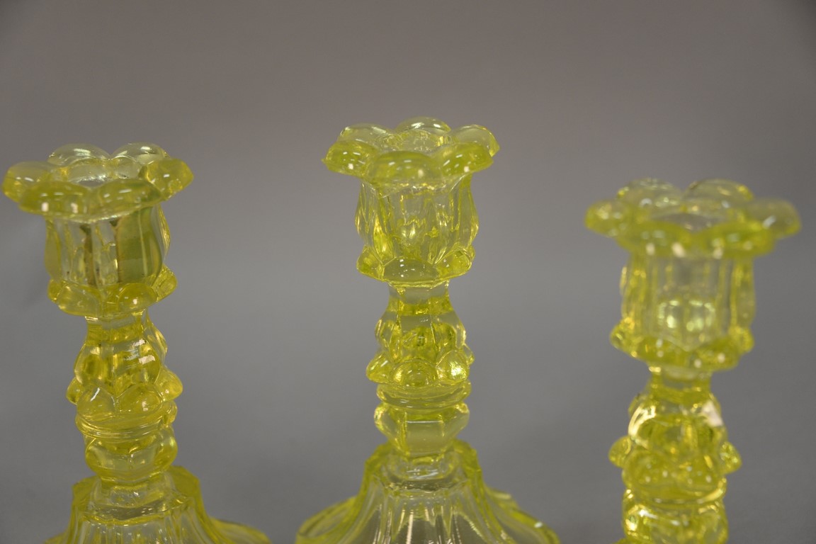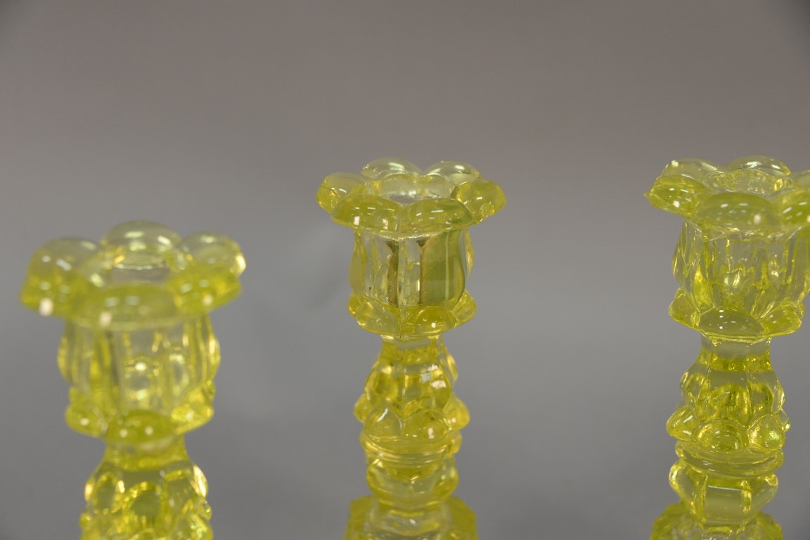 Set of four canary yellow sandwich glass candlesticks, 19th century. 7in. Provenance: Property from the Francis Du Pont Collection drawn from a home in Farmington, CT