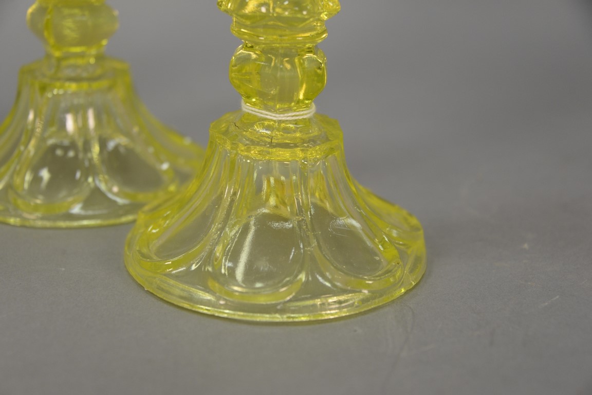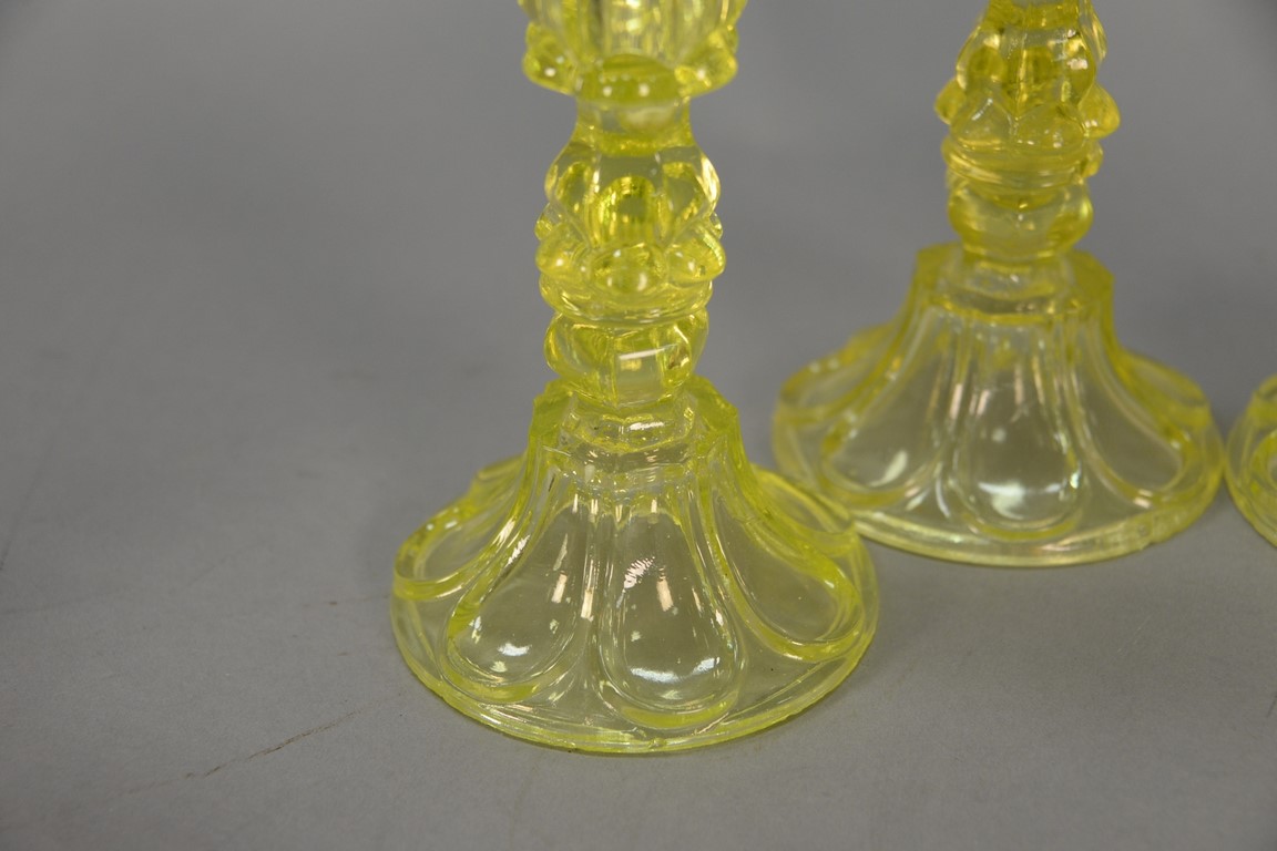 Lot 141: Set of four canary yellow sandwich glass candlesticks, 19th century. 7in. Provenance: Property from the Francis Du Pont Collection d…