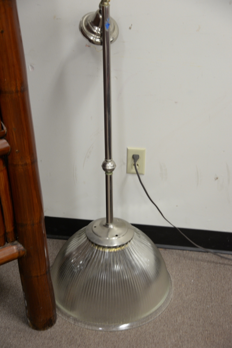 Lot 141: Seven lights including three aluminum industrial style, three stainless, and one glass with chrome ht. 42in..