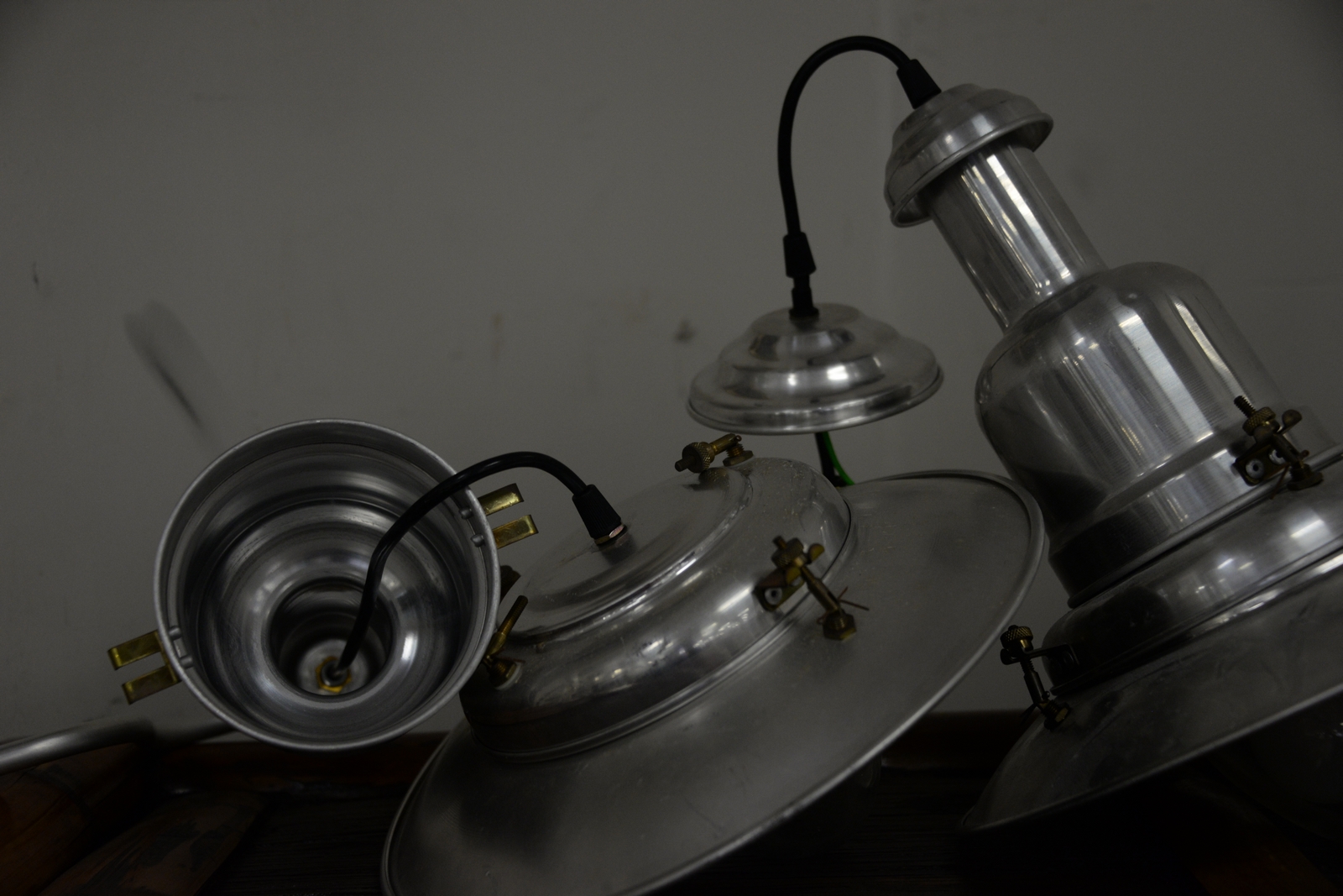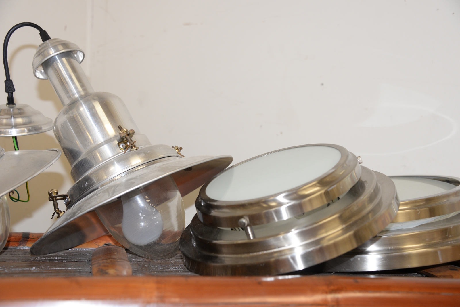 Seven lights including three aluminum industrial style, three stainless, and one glass with chrome ht. 42in..