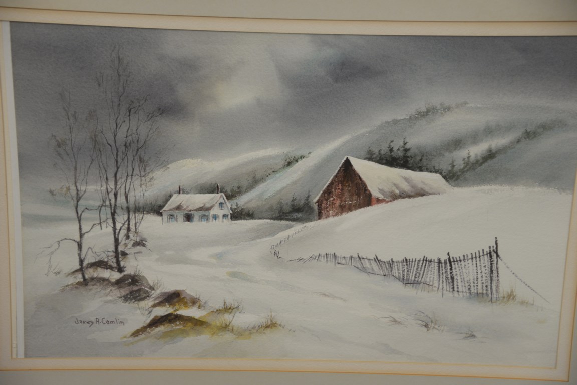 Lot 141: Two James Camlin 1918-1982 watercolor winter landscapes, signed lower right and lower left James A. Camlin, sight size 13 x 20.