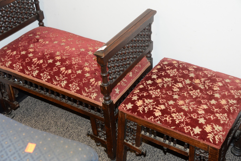 Two Pairs of Moorish Style Benches and Stools, (some missing spindles), height 17 and 24 inches, top 16″ x 16″ and 15″ x 26 3/4 inches.