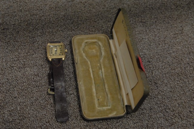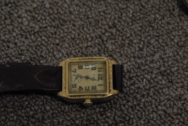 14 karat gold Elgin square man’s vintage wristwatch in original box.