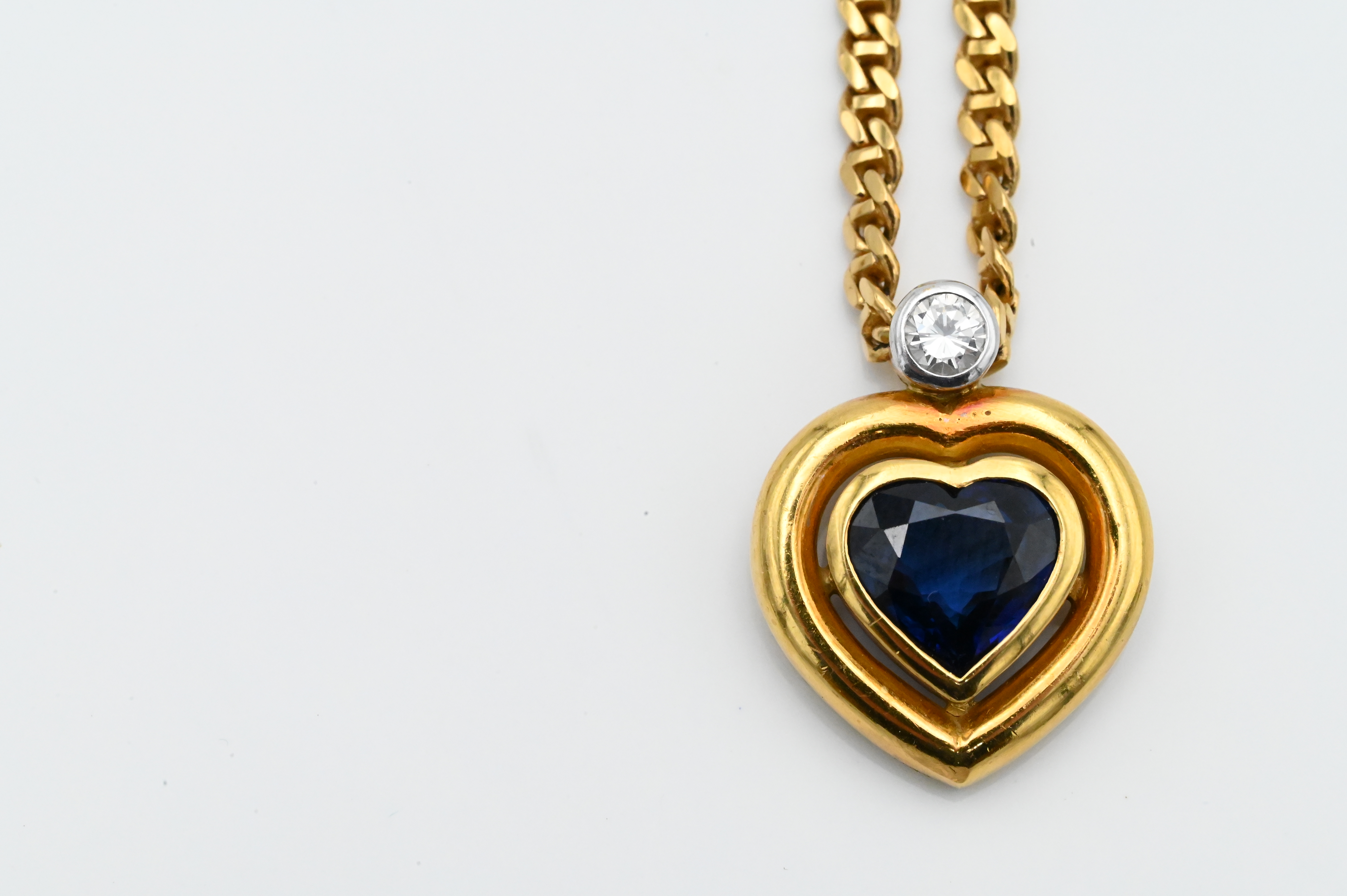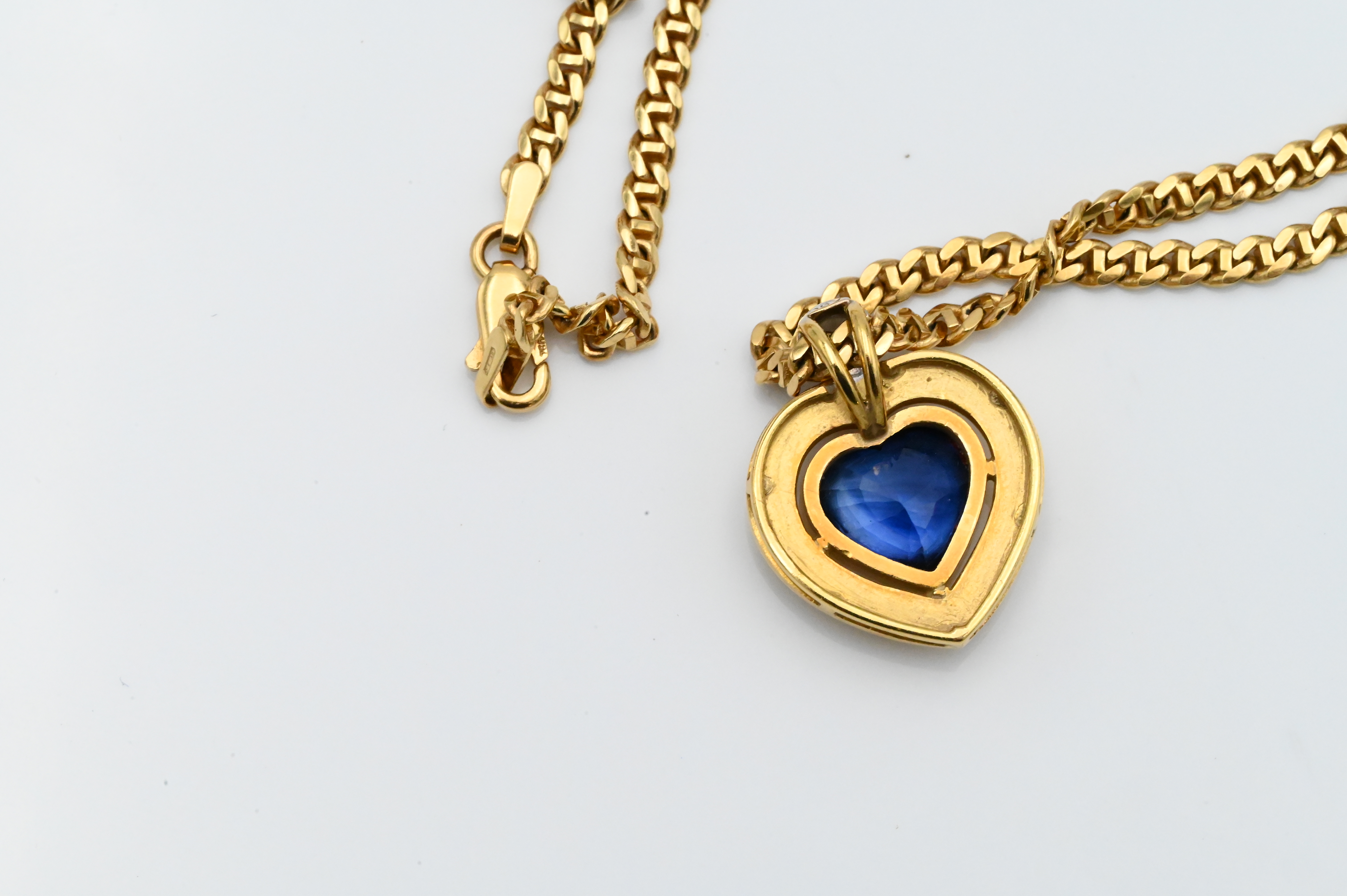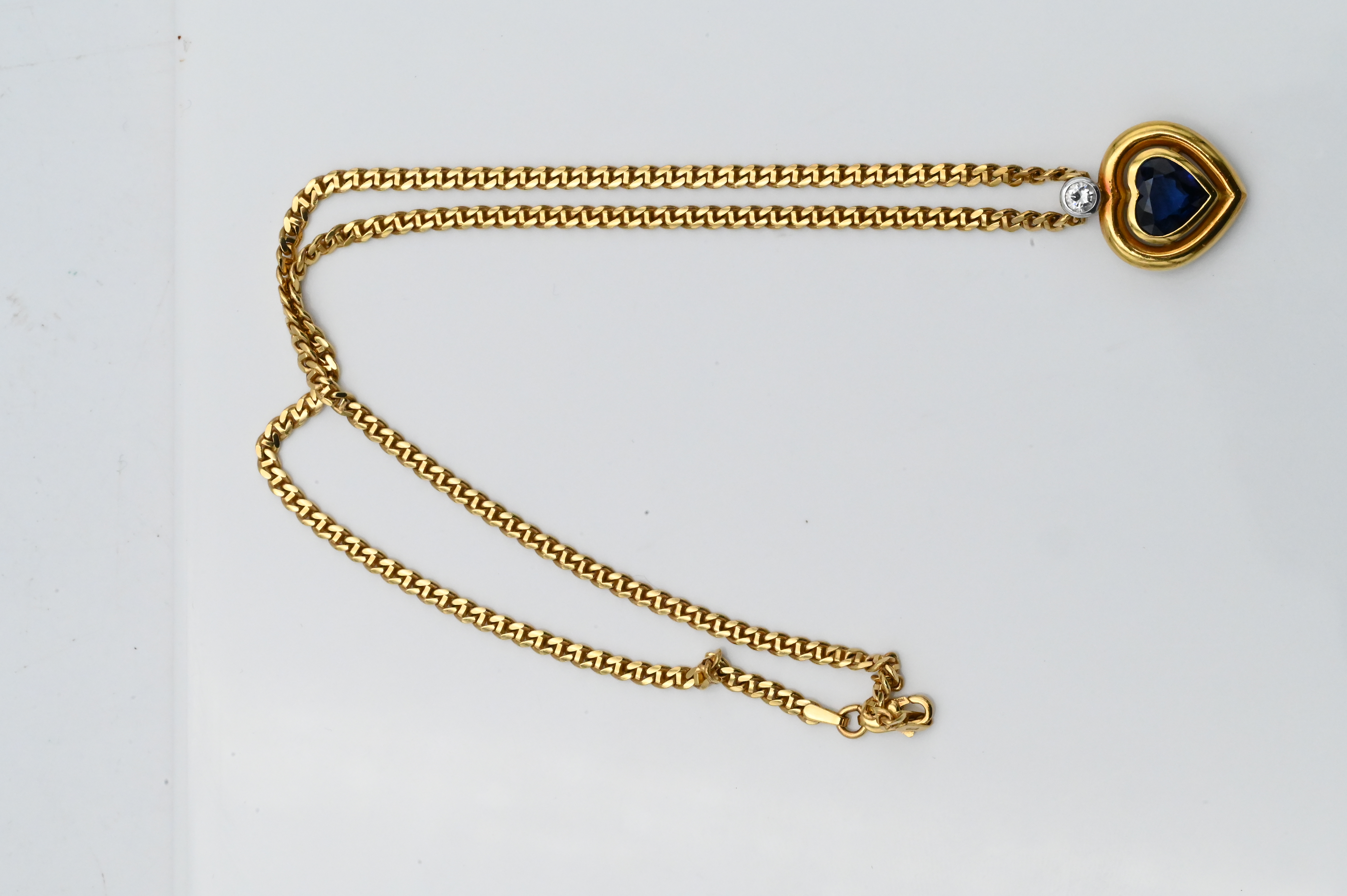 18 Karat Yellow Gold Chain and Heart Shaped Pendant, having heart shaped blue stone and small diamond, 22.2 grams.