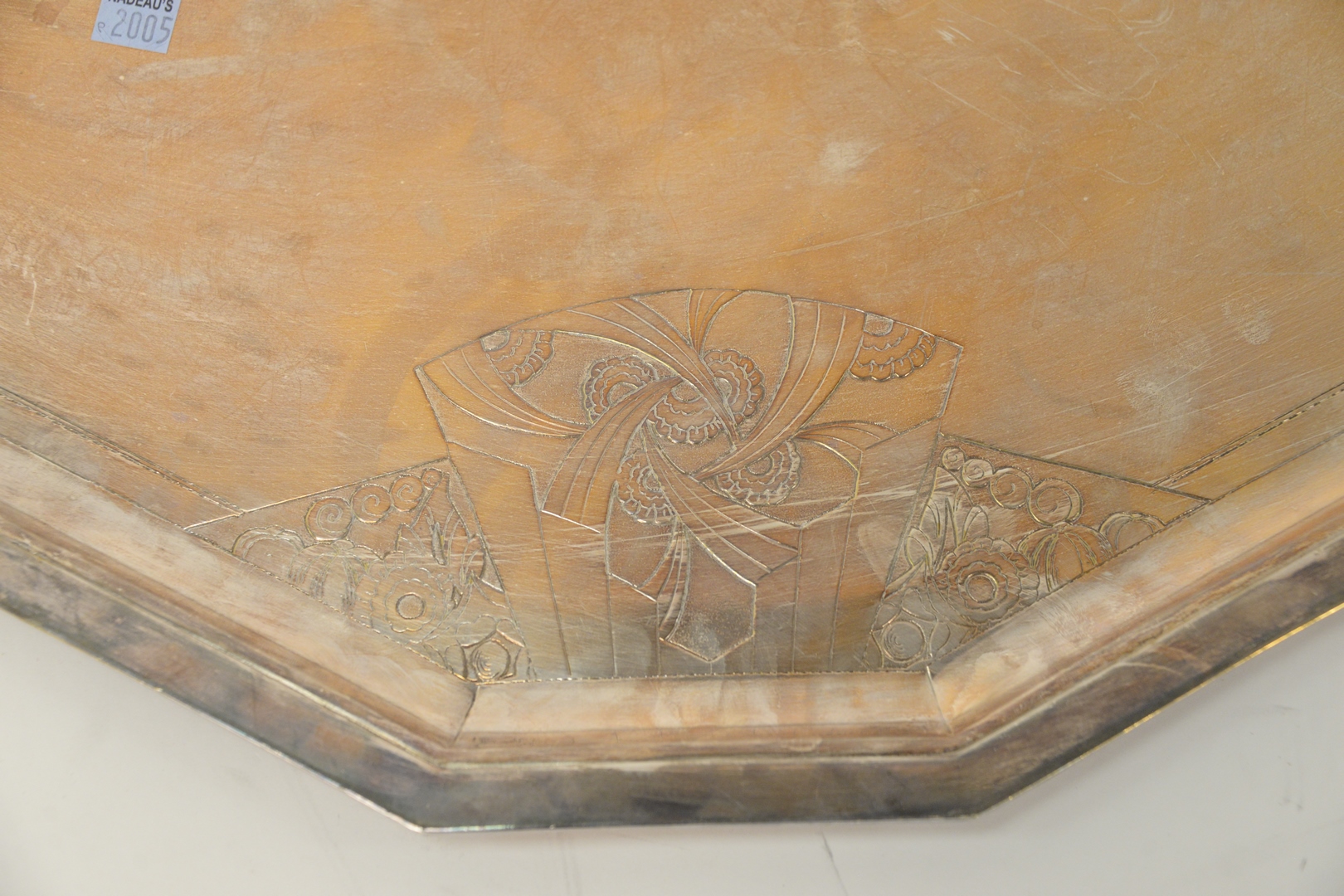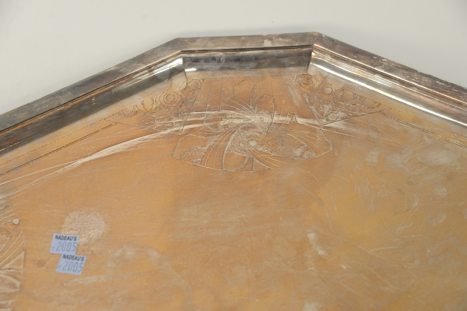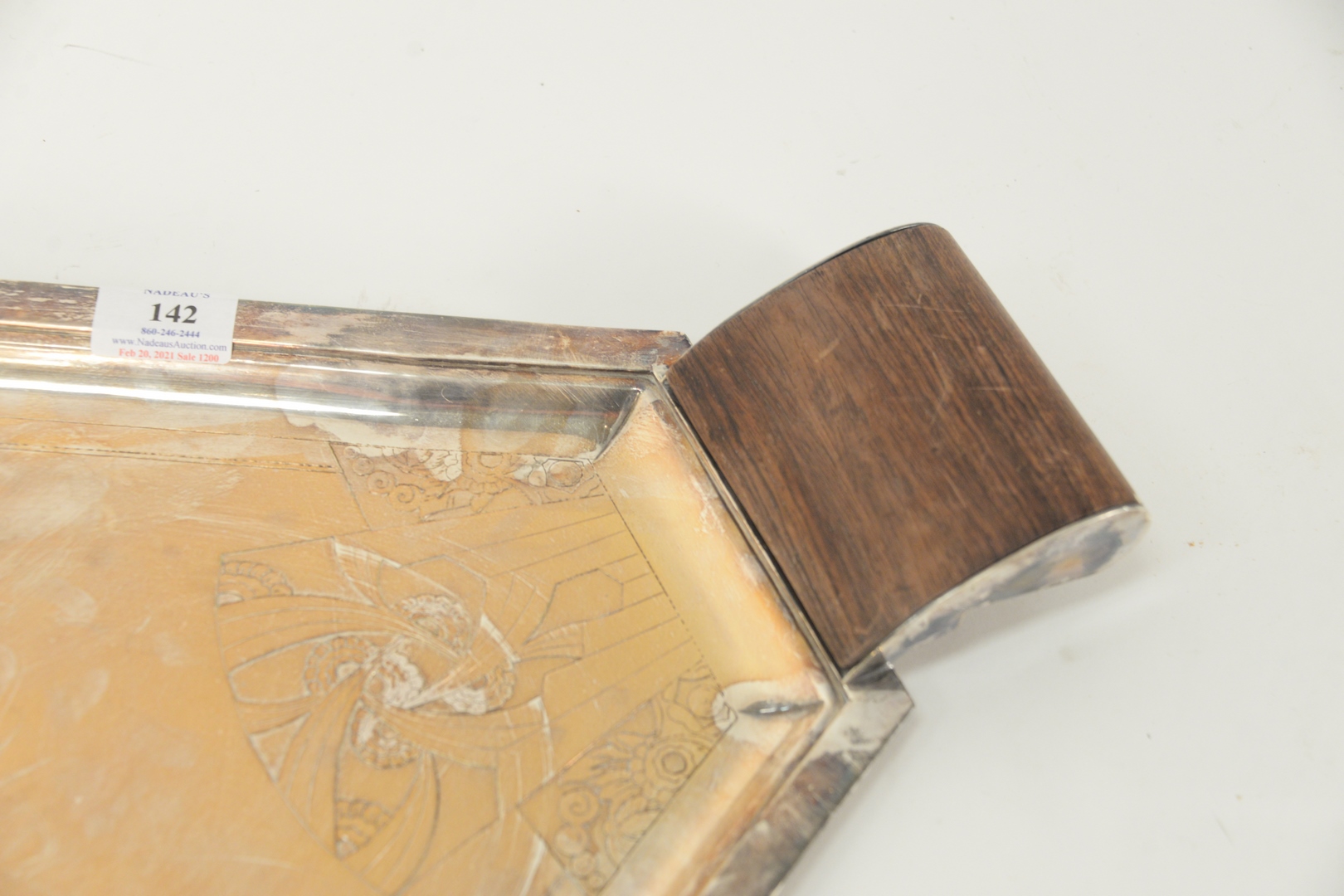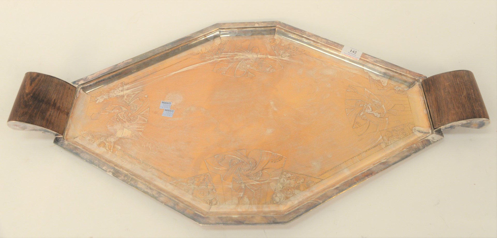 Art Nouveau Silver Plated Tray, with wood handle, width 32-/12 inches.