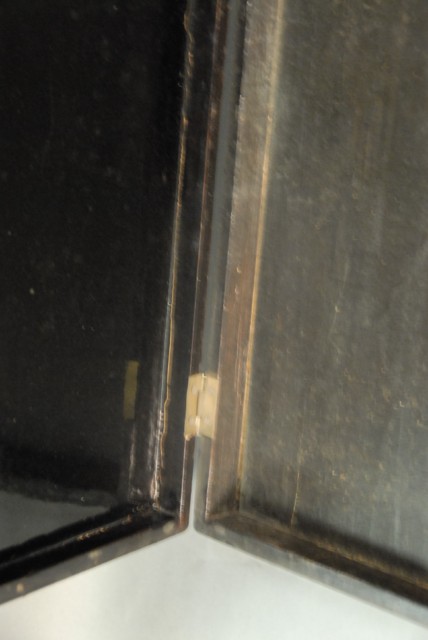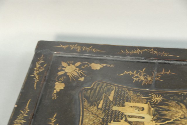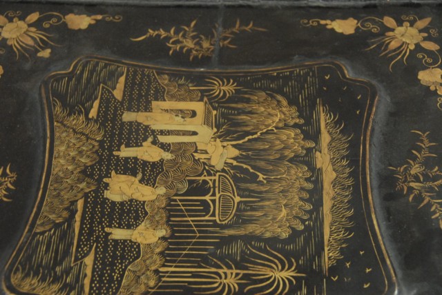 Black lacquered box with gold stenciled courtyard scene and scrolling flowers