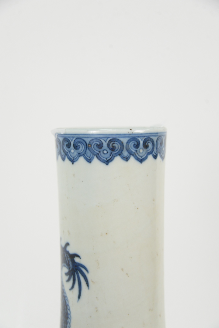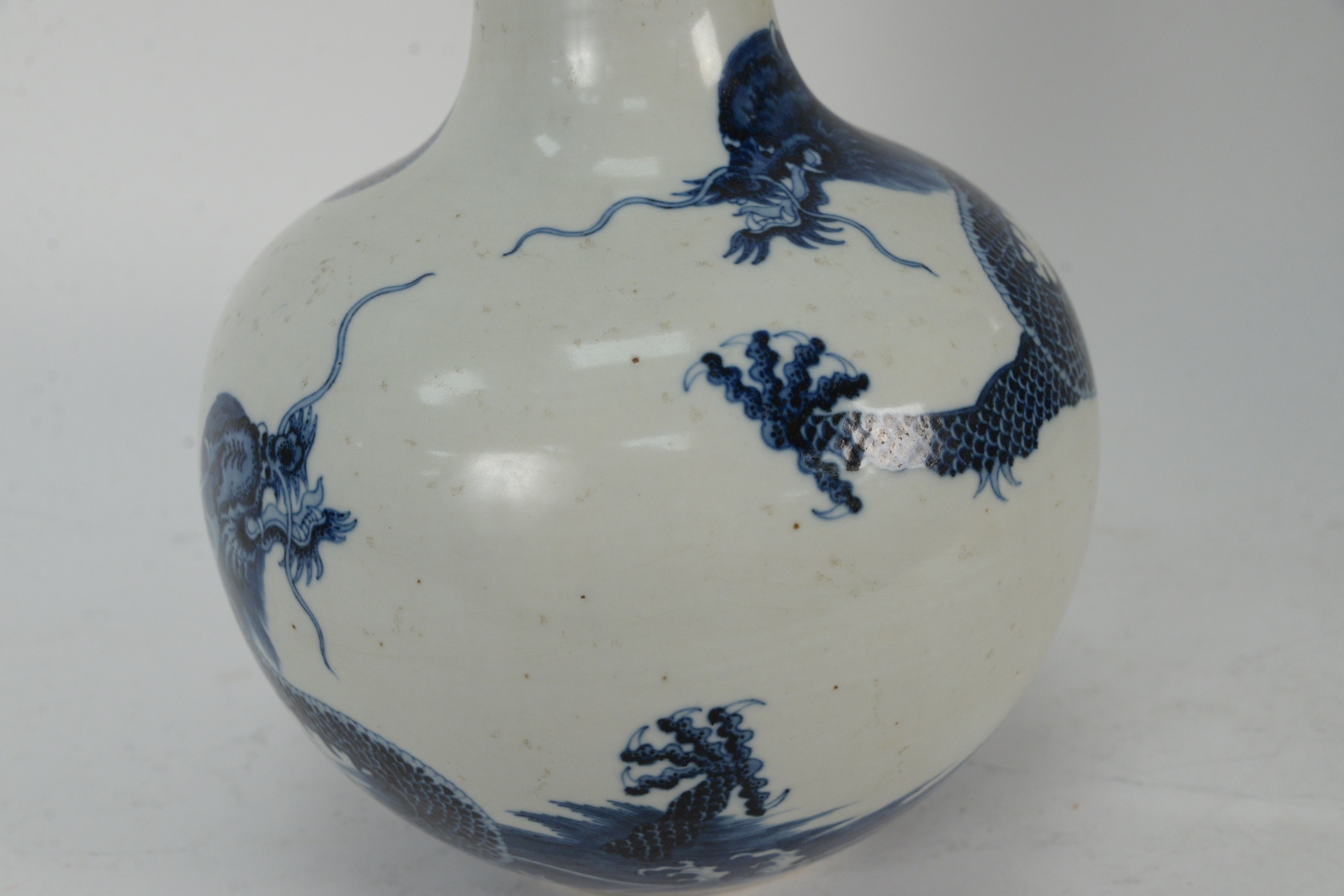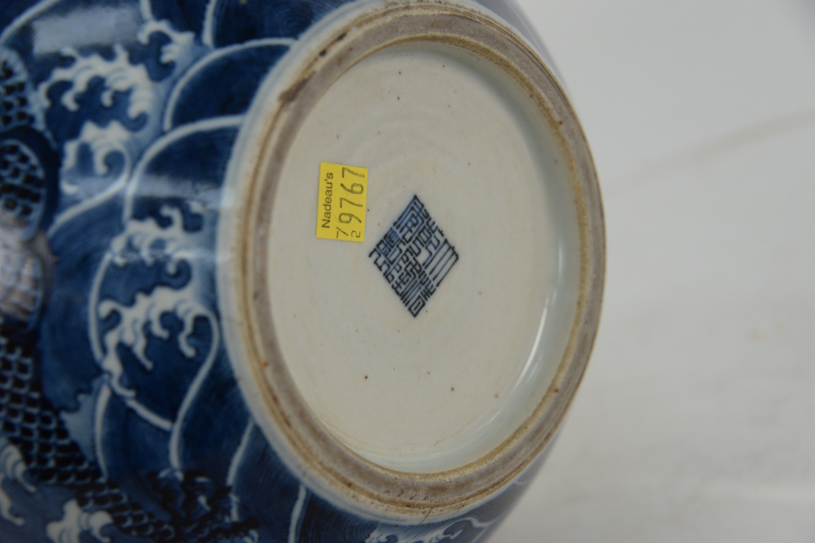 Lot 142: Chinese Blue and White Globular vase having five clawed dragon decoration with a 6 character Qianlong mark to the underside, 19th century, height 16 7/8 inches.