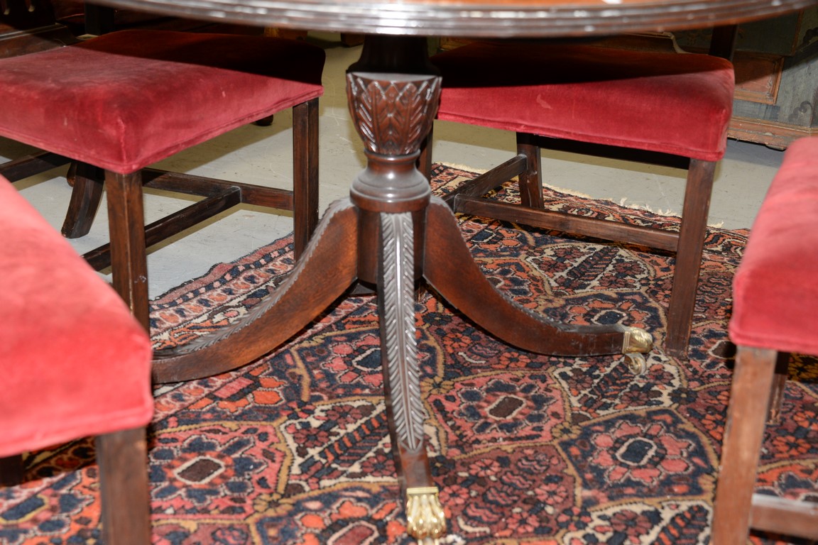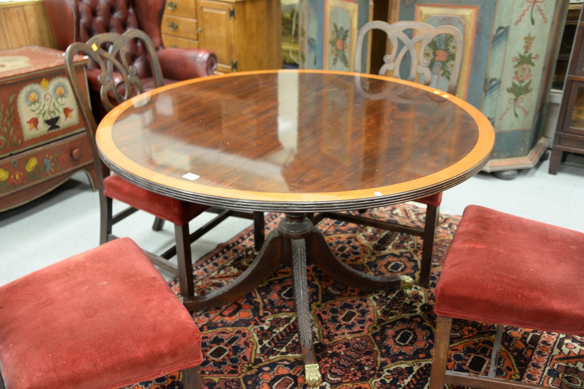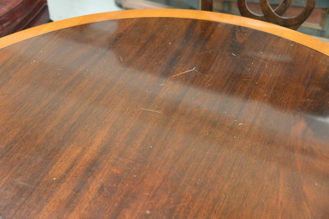 Custom mahogany round table with banded inlaid top. ht. 30 in. dia. 50 in.