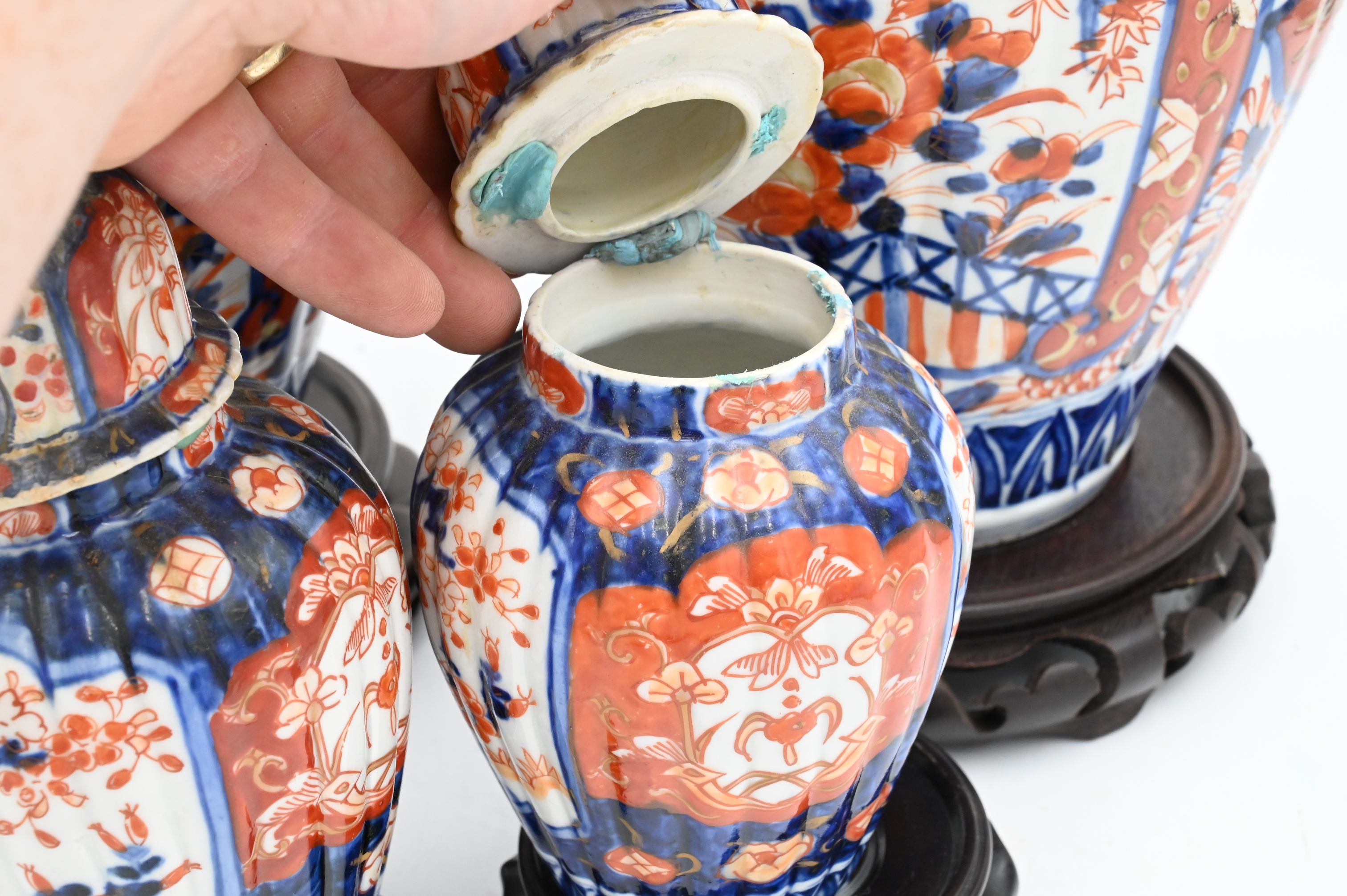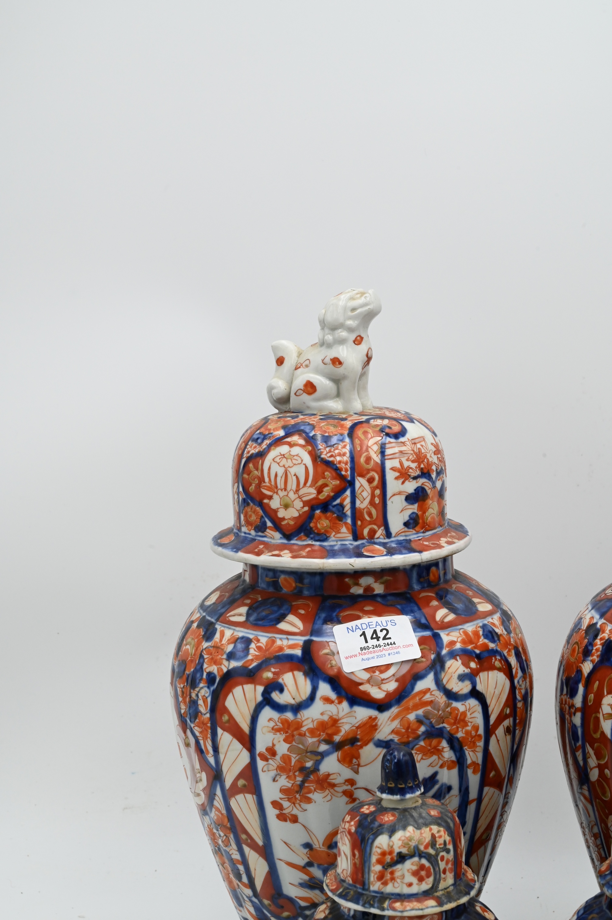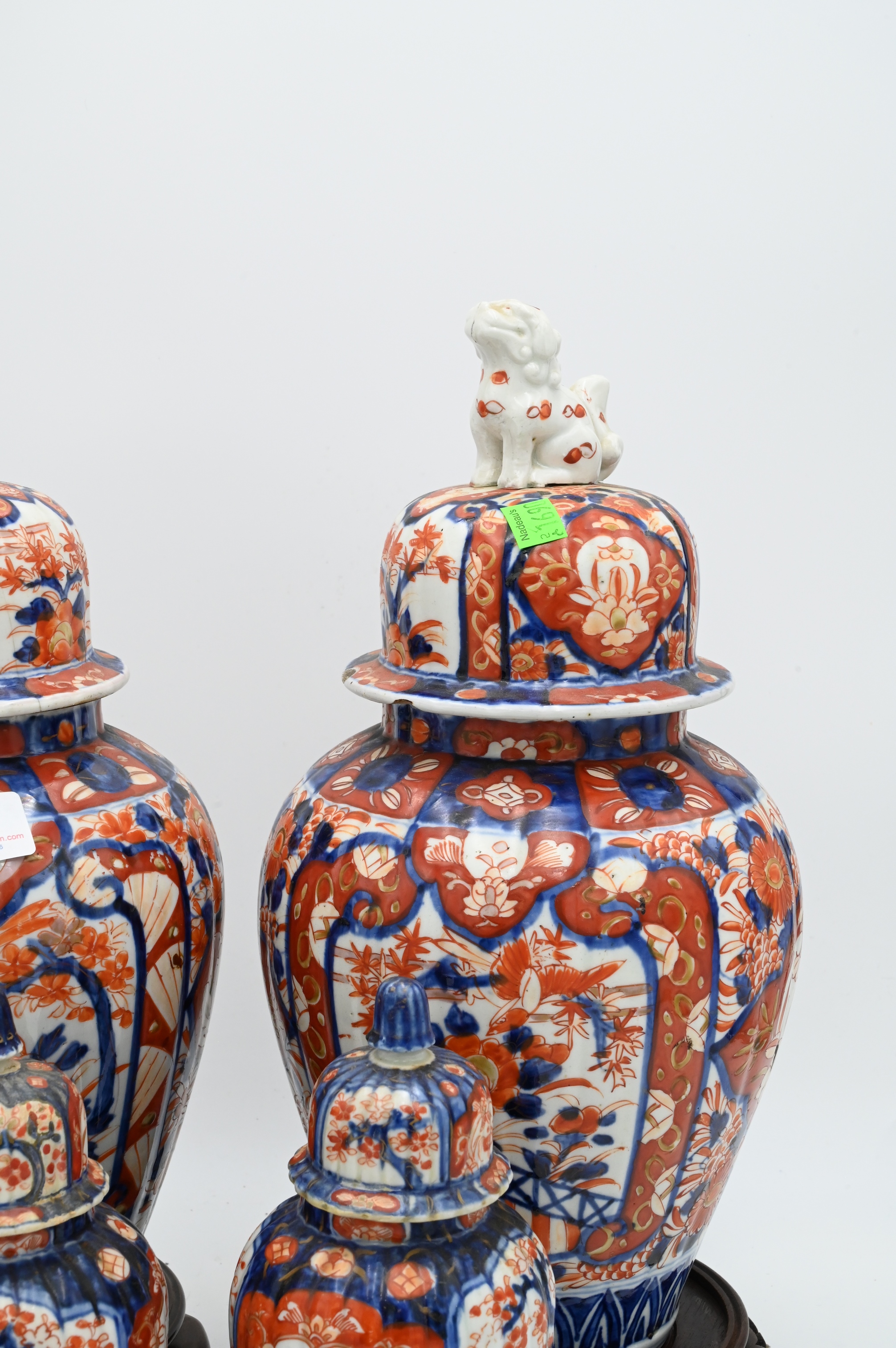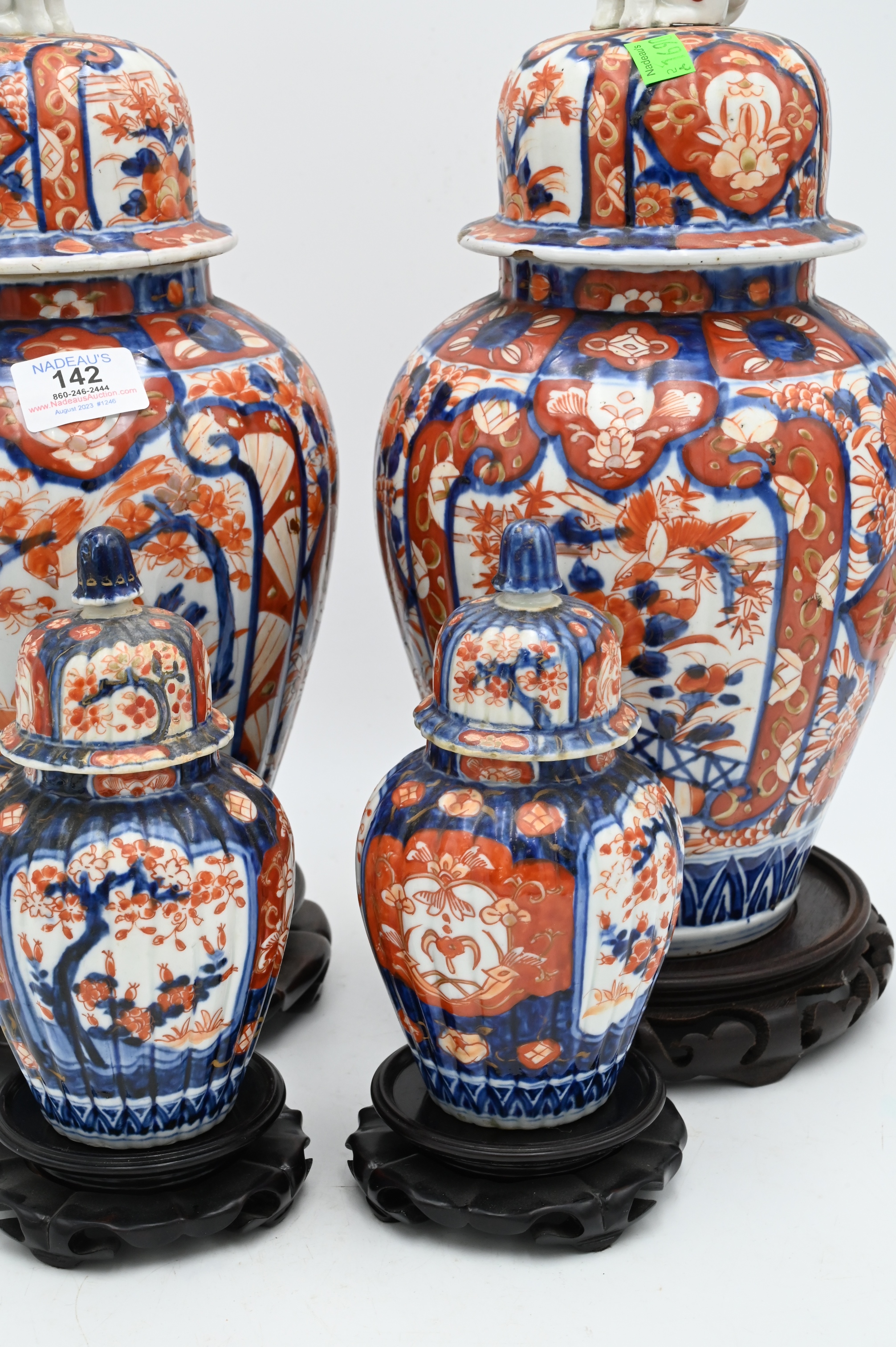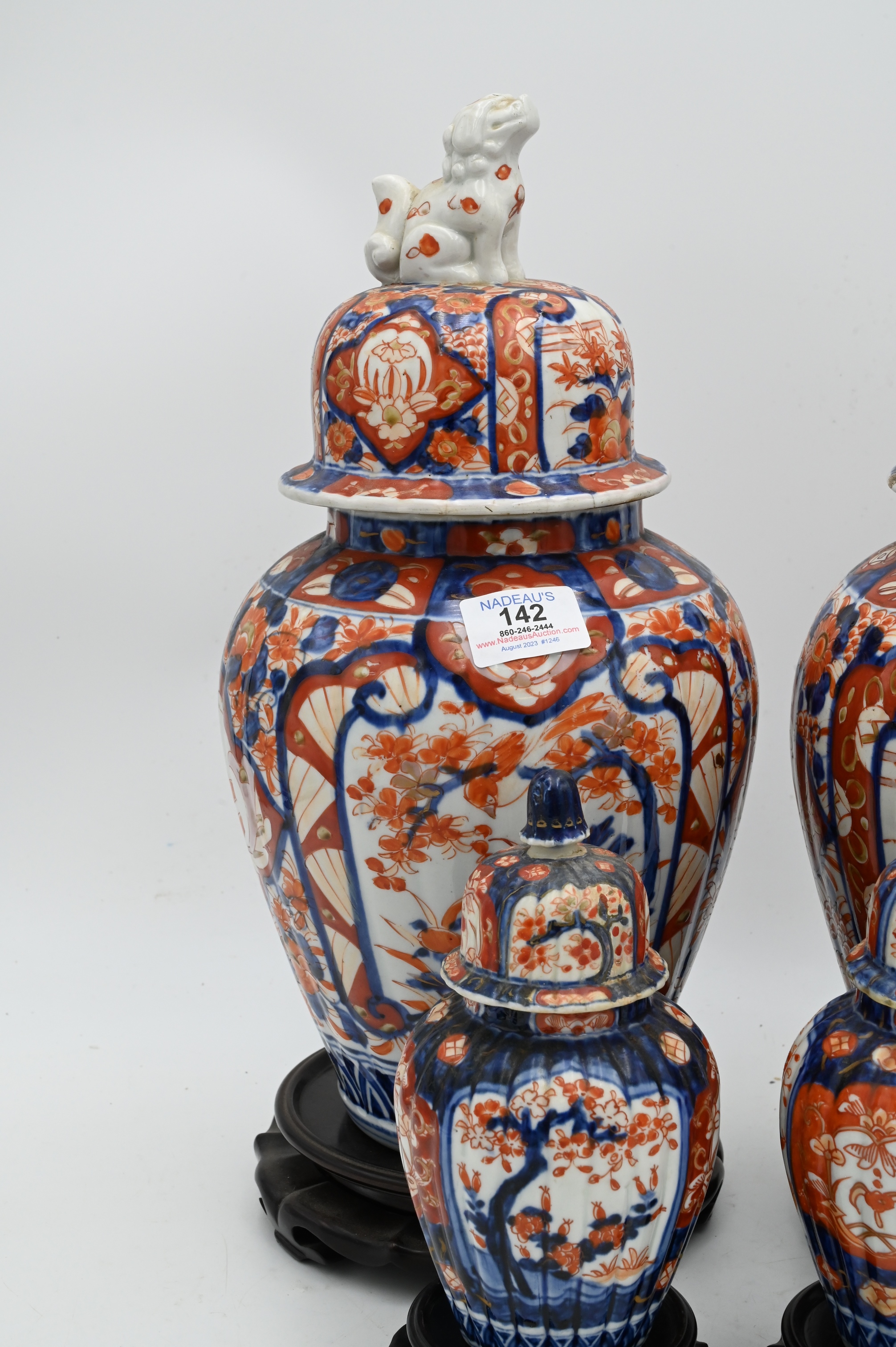 Four Piece Group of Japanese Imari, pair of large porcelain jars having foo dog finial on dome shaped cover (one jar has broken finial), over baluster form vases, painted with garden scenes, (iron red, blue, slight gold accents), 14 1/2 inches, diameter 78 inches, along with a pair of small jars with ribbed sides, one foo dog finial broken.