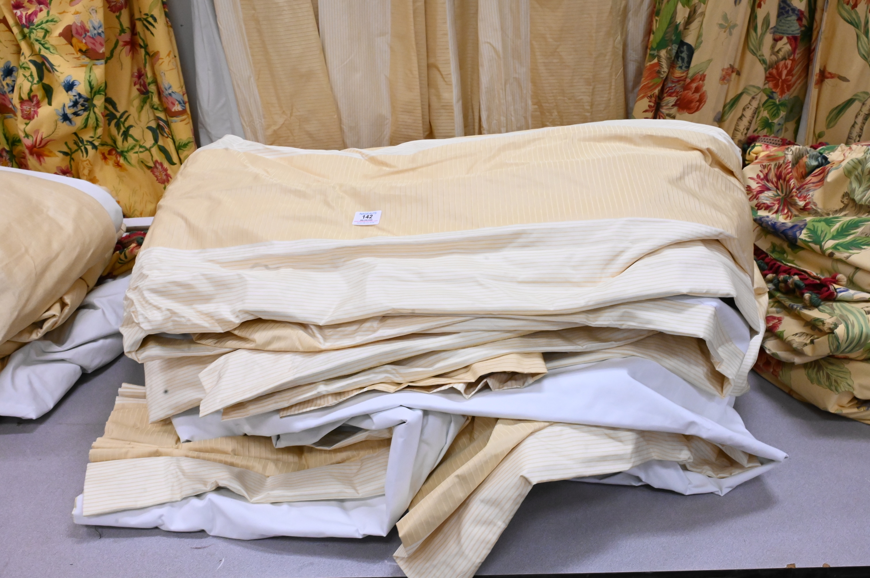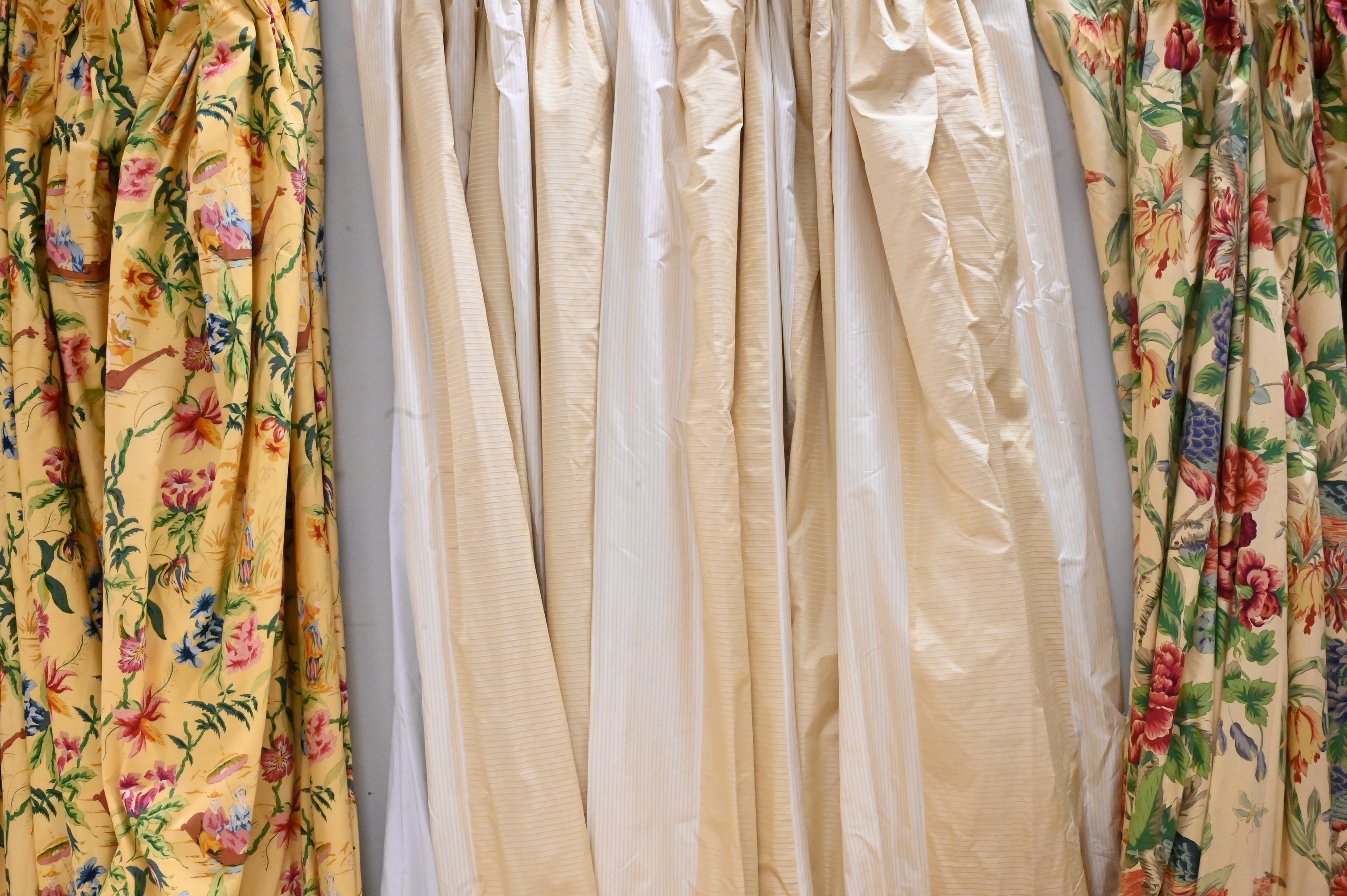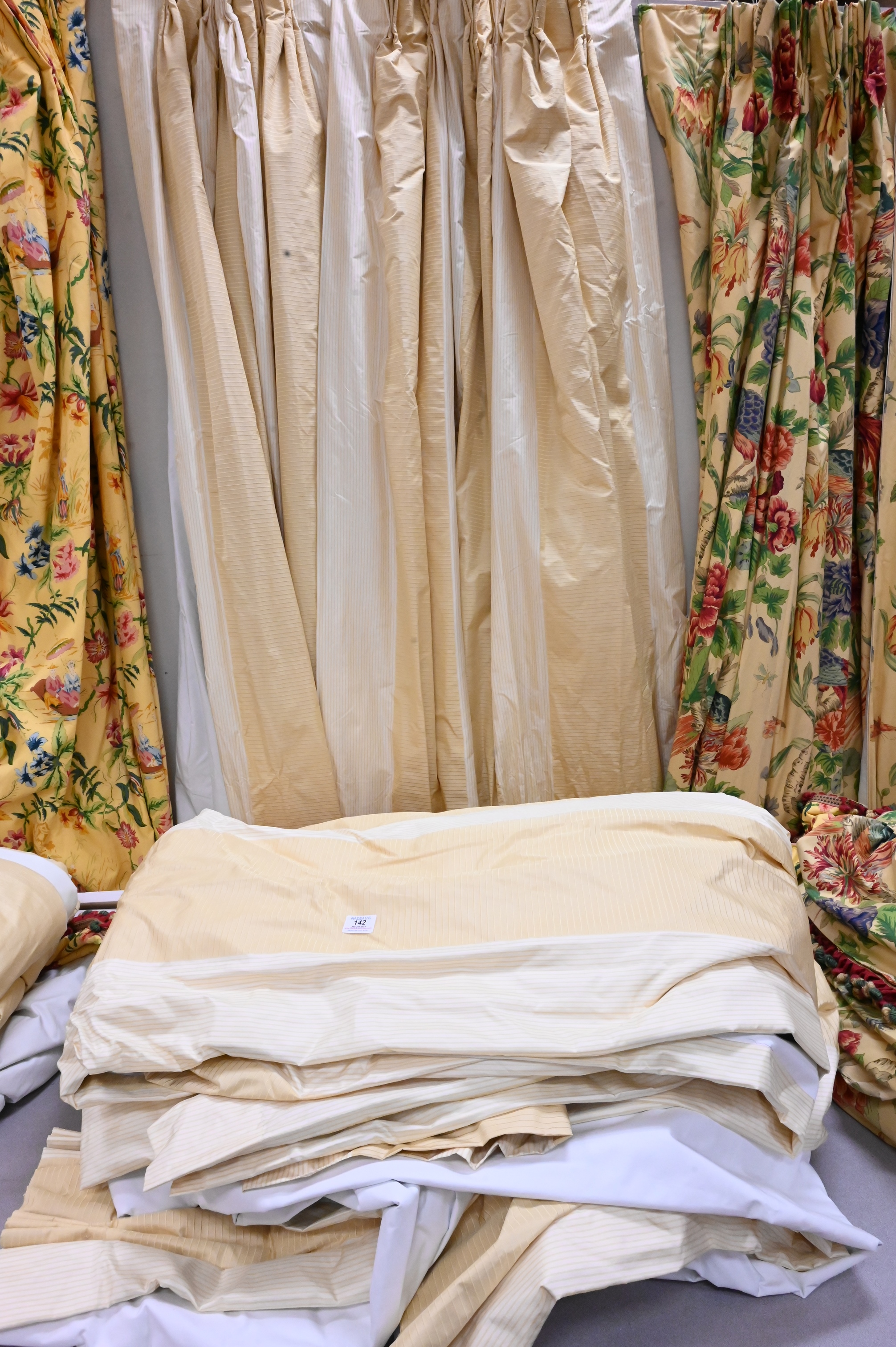 Set of Four Custom Window Curtains/Drapes by Shoemaker, in “silk stripe” pattern, approximately 115″ x 69″.
