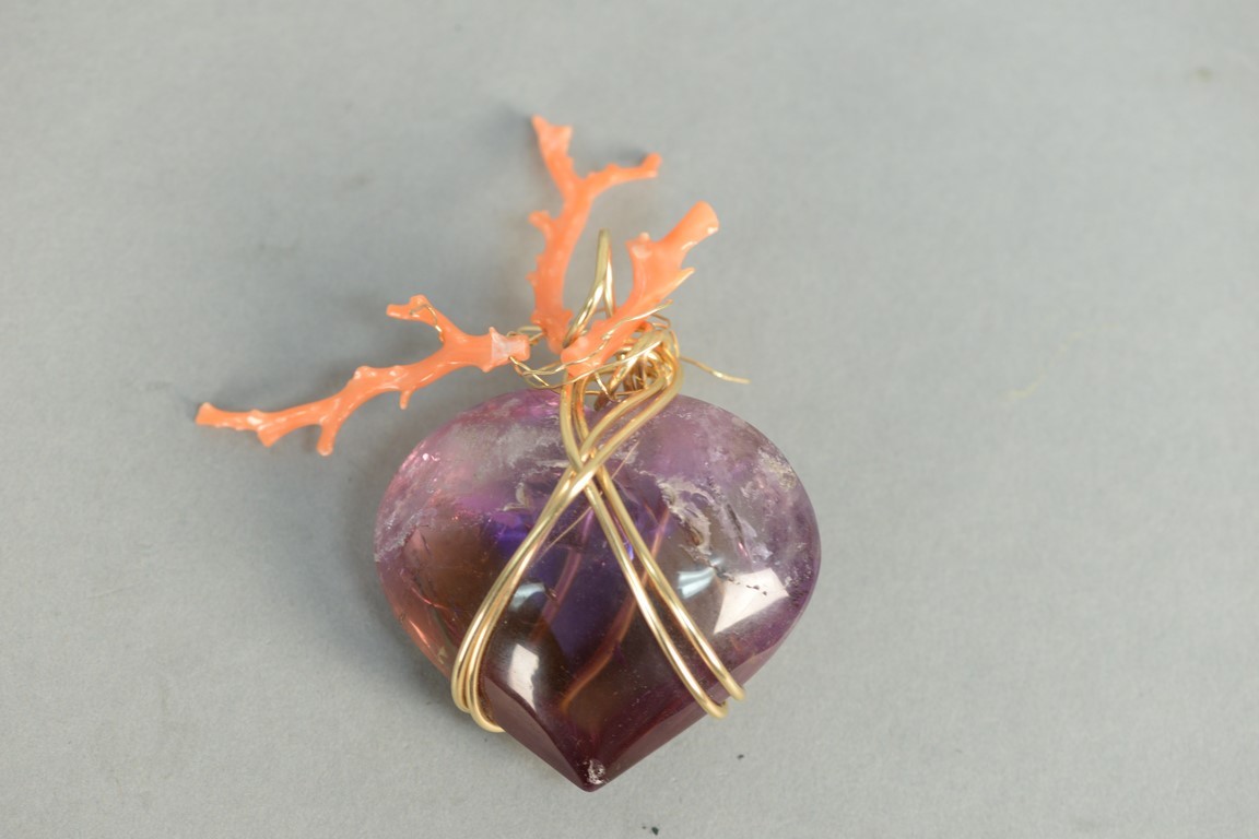 Lot 142: Gold Amethyst and coral large pendant by Kazuk, amethyst heart shaped pendant wrapped with gold wire and three pieces coral, Shima K…