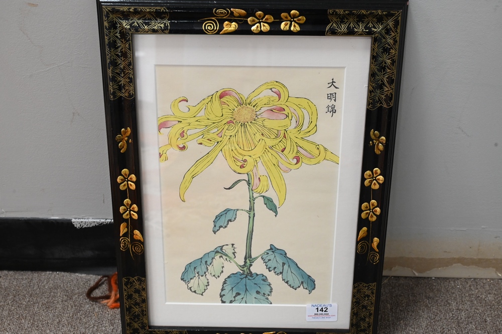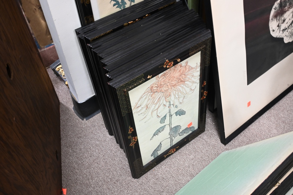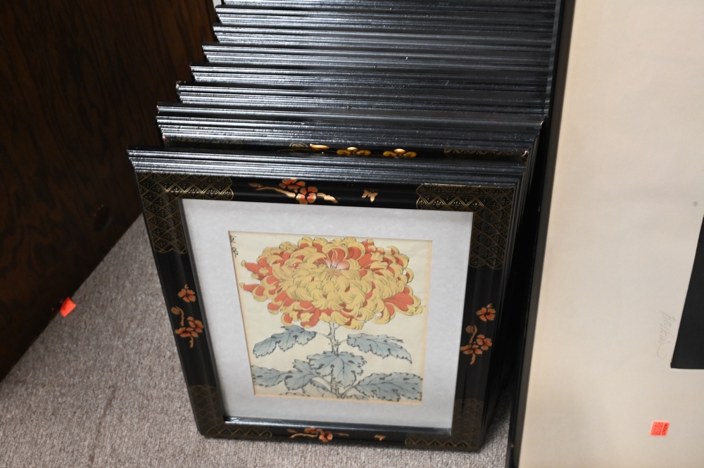 Lot 142: Group of 16 Chinese Flower Prints, all having black chinoiserie decorated frames with heavy gilt flowers, sight sizes 11.75″ x 7.75″.