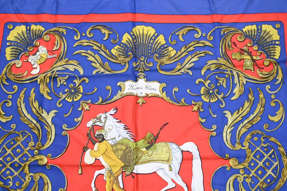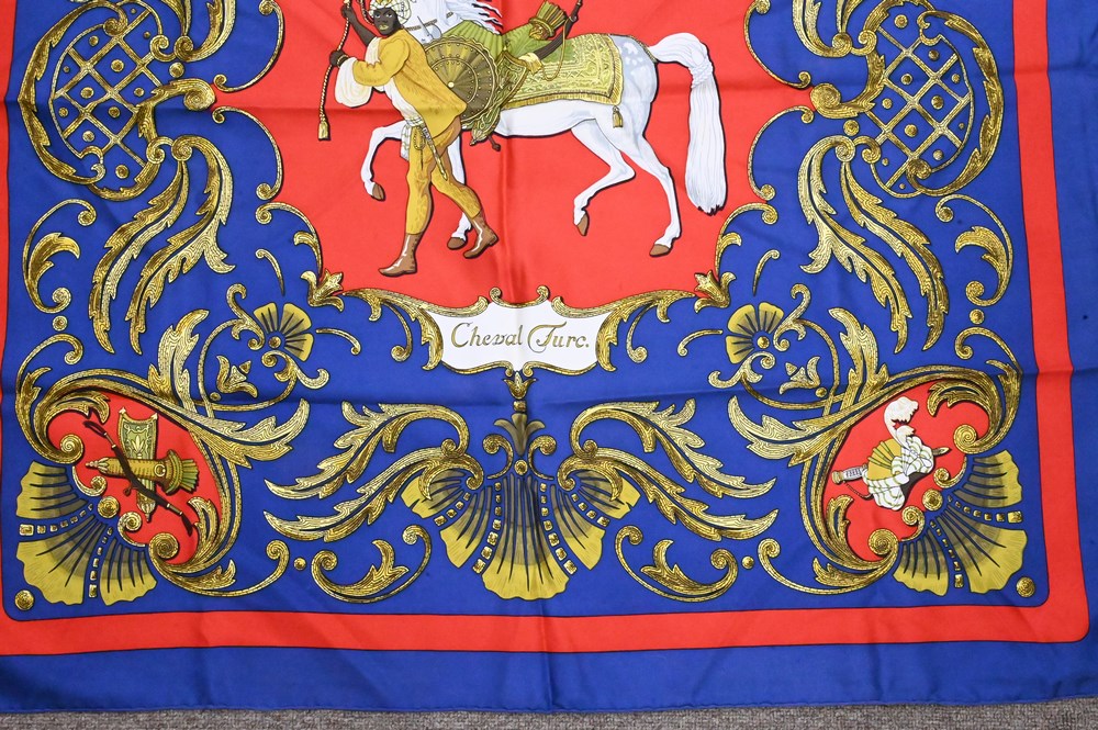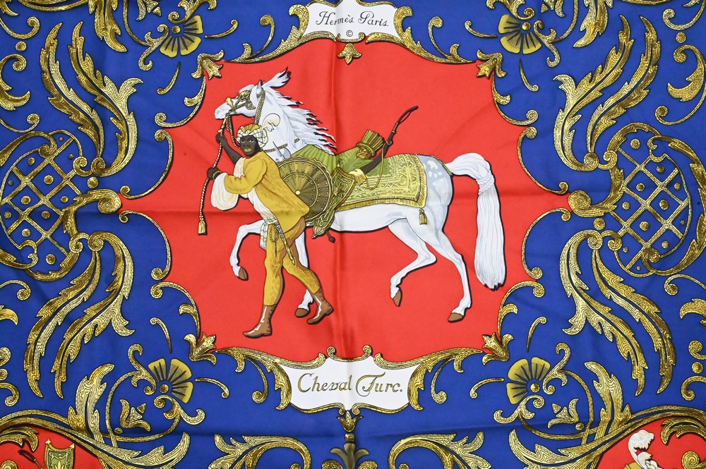 Lot 142: Hermes Paris “Cheval Furc” Silk Scarf, 33″ x 33″. Provenance: Collections of Norma Reilly, New Jersey.