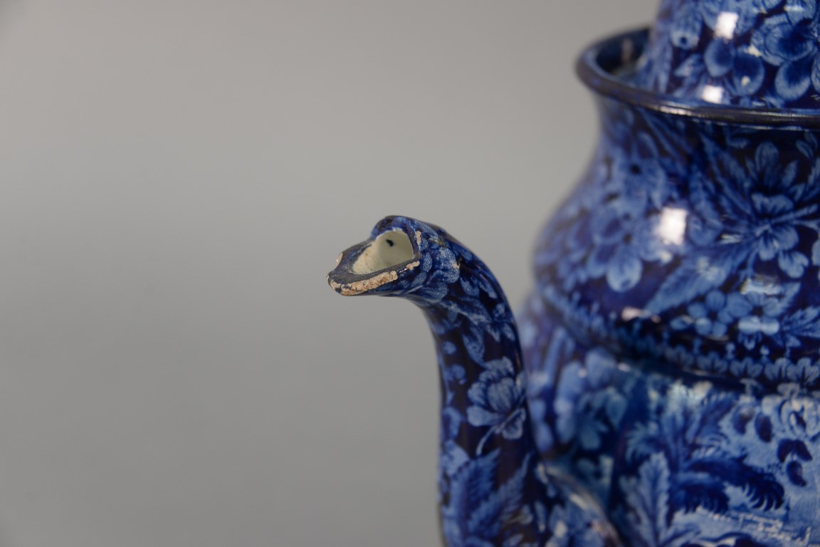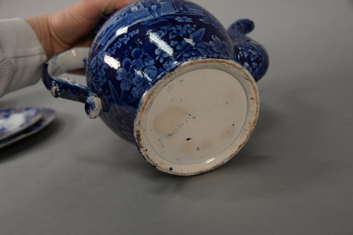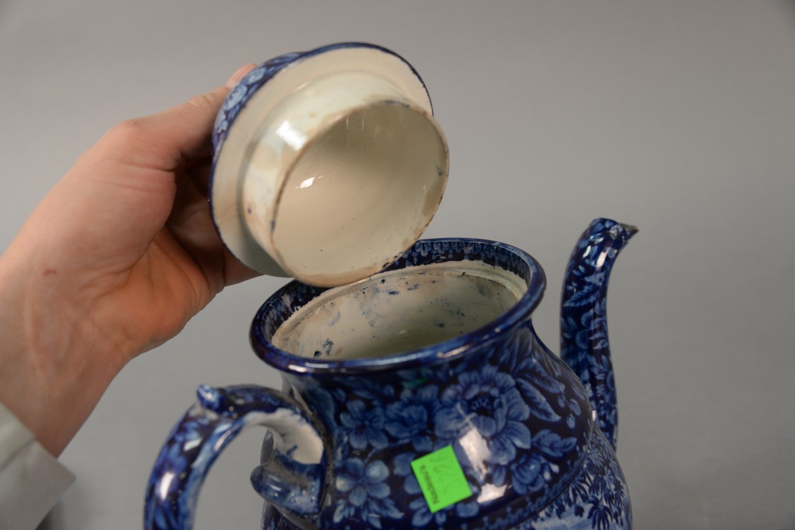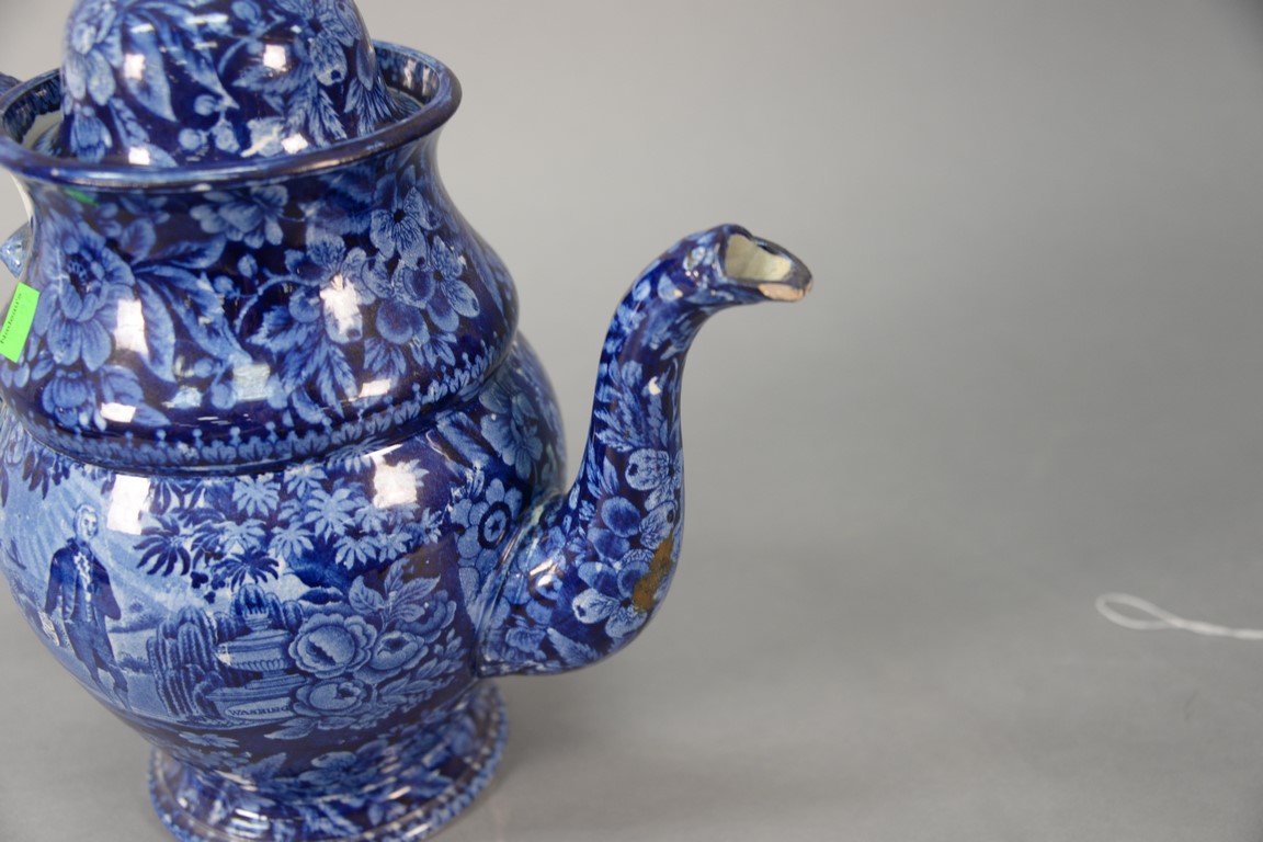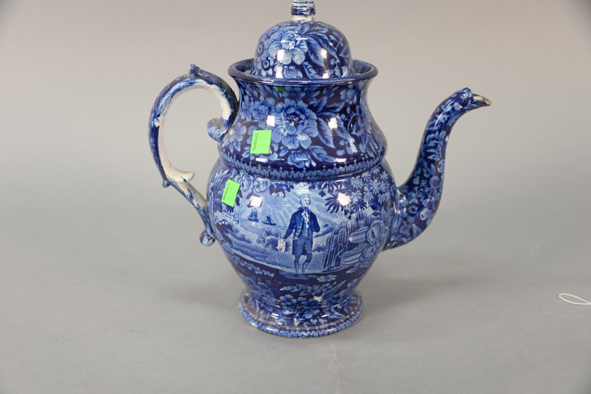 Lot 142: Historic Blue Staffordshire coffee pot depicting Washington tomb with ships in background. spout with edge chips, cover with hai…