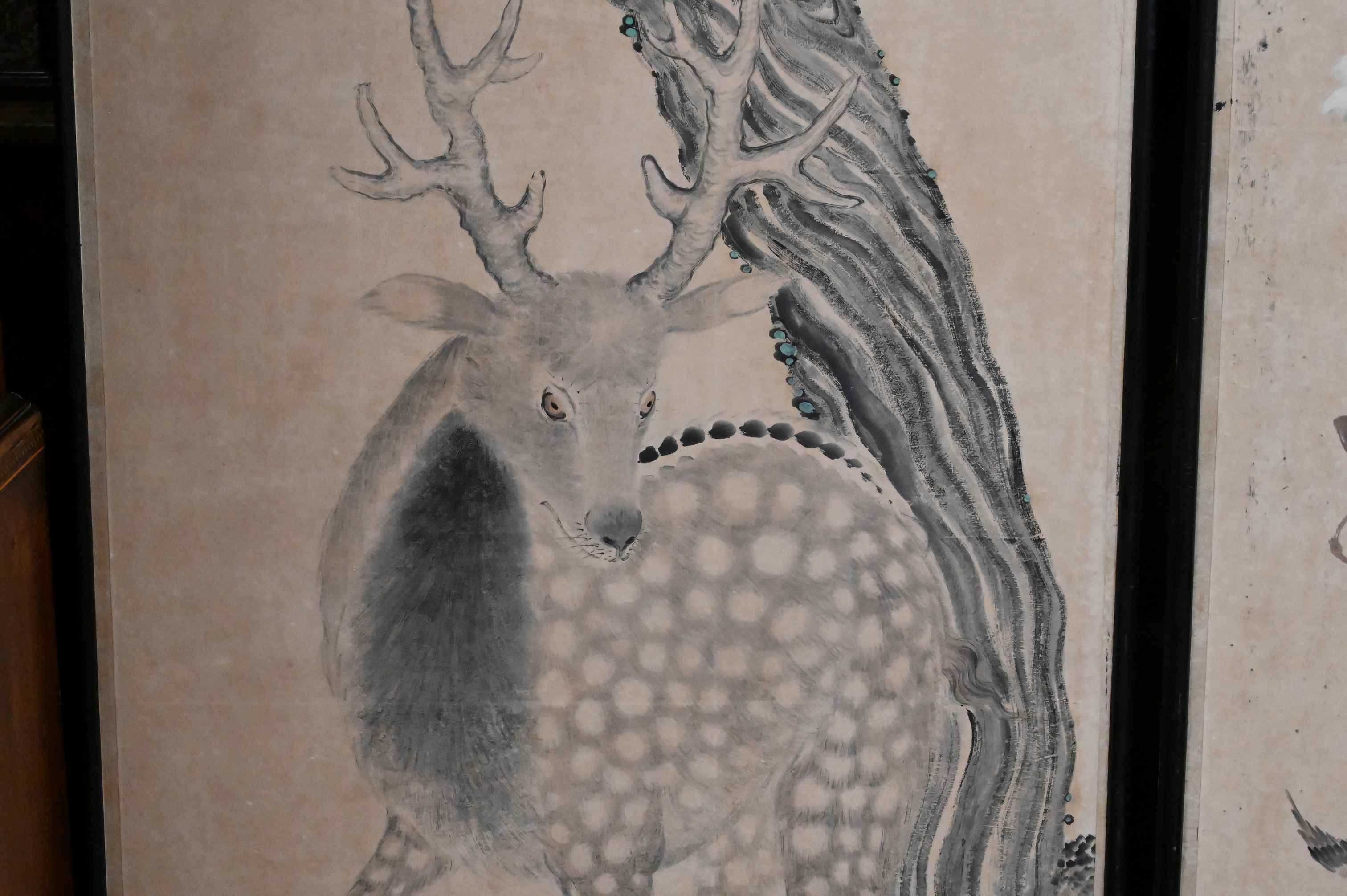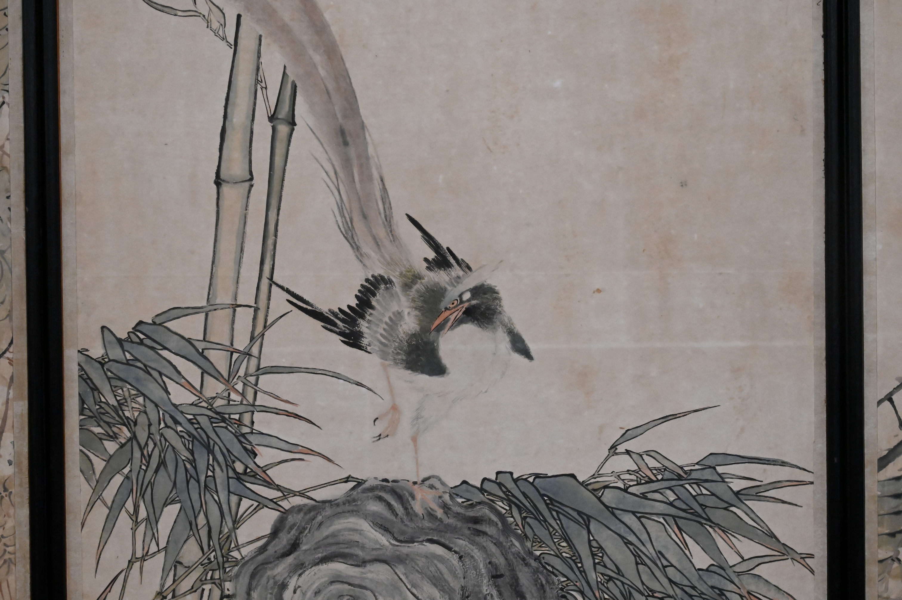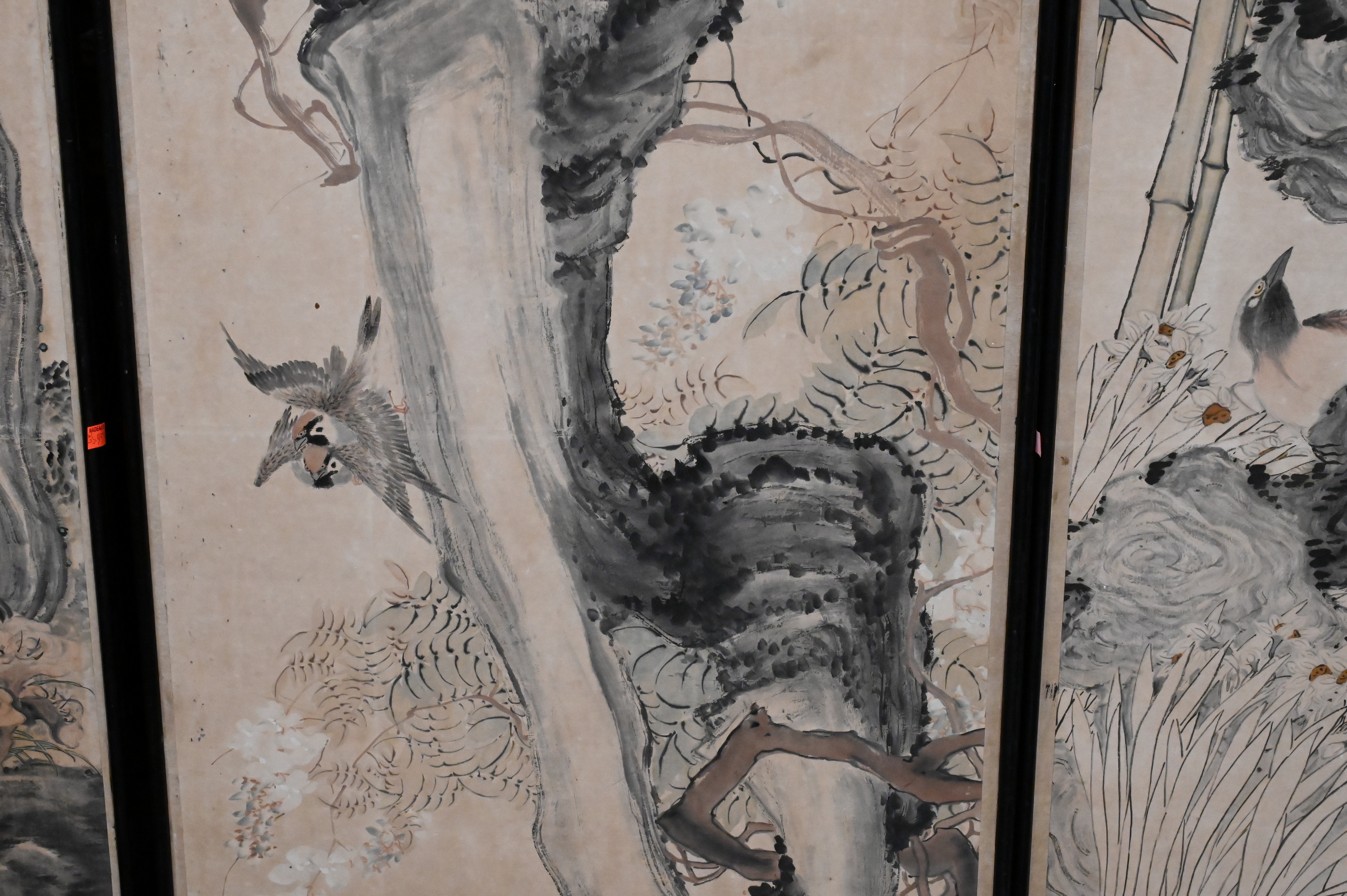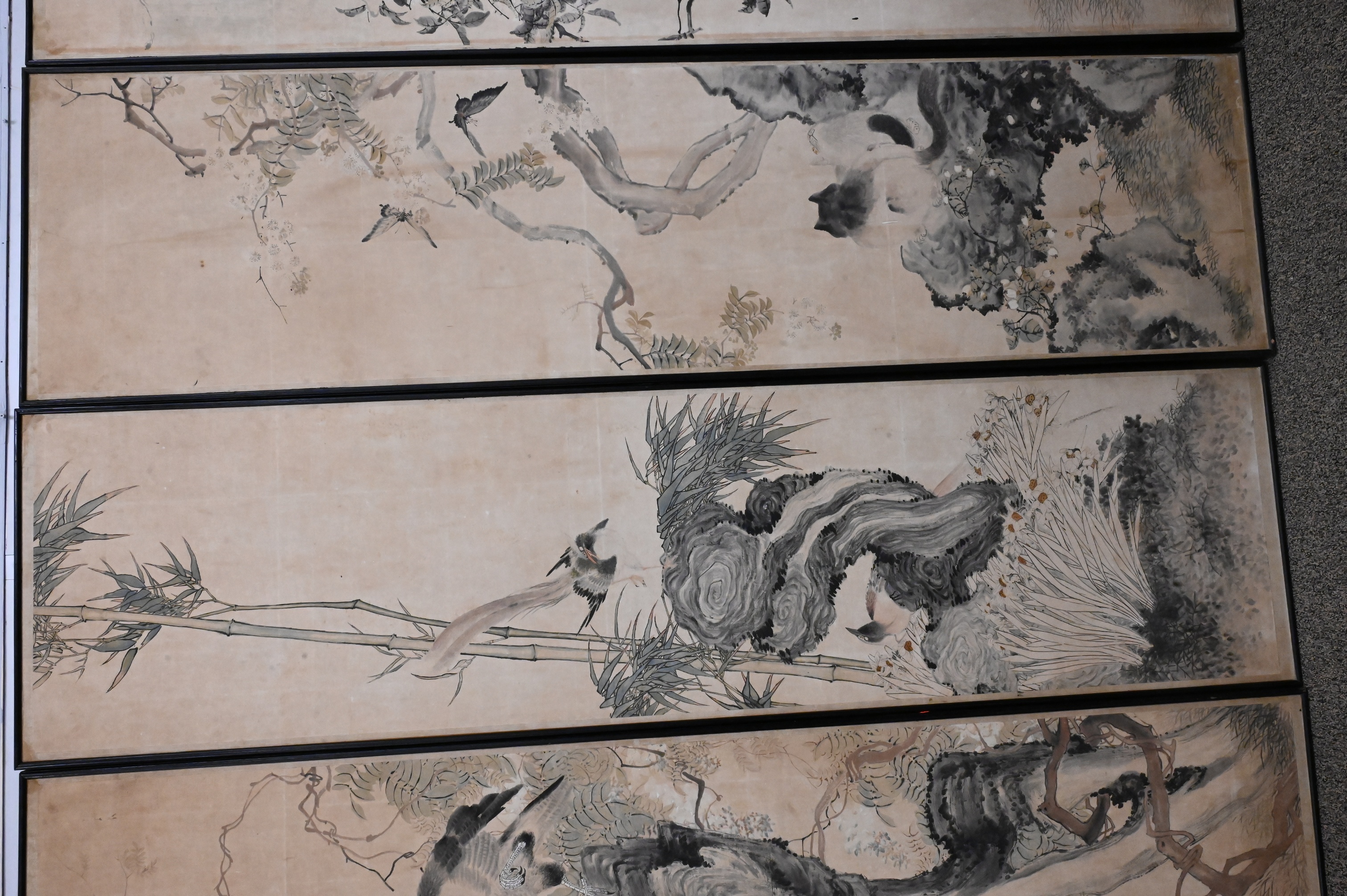a suite of six large vertical watercolor compositions on paper, each mounted to individual wood panels for hanging separately or as a continuous screen, paintings depict traditional Japanese subjects including birds in flight, bamboo, flowering branches, expressive old-growth trees, rocky outcrops, and small animals such as rabbits, executed in soft ink and wash with subtle tonal variations and delicate brushwork, Meiji period