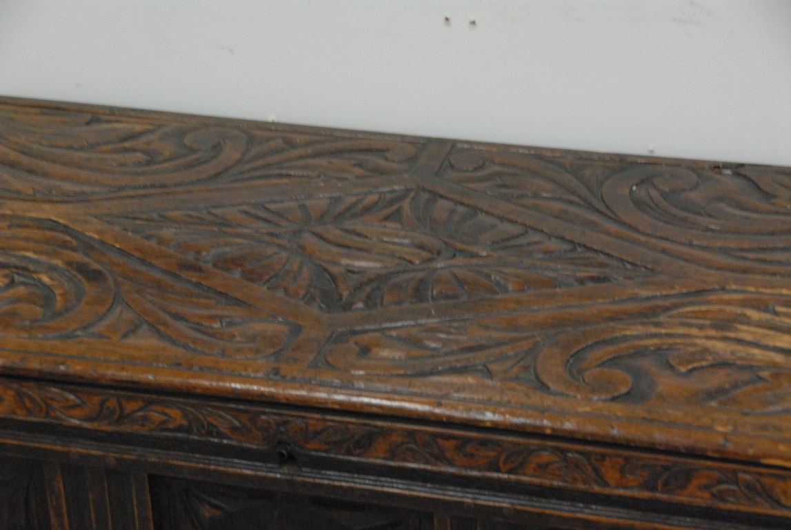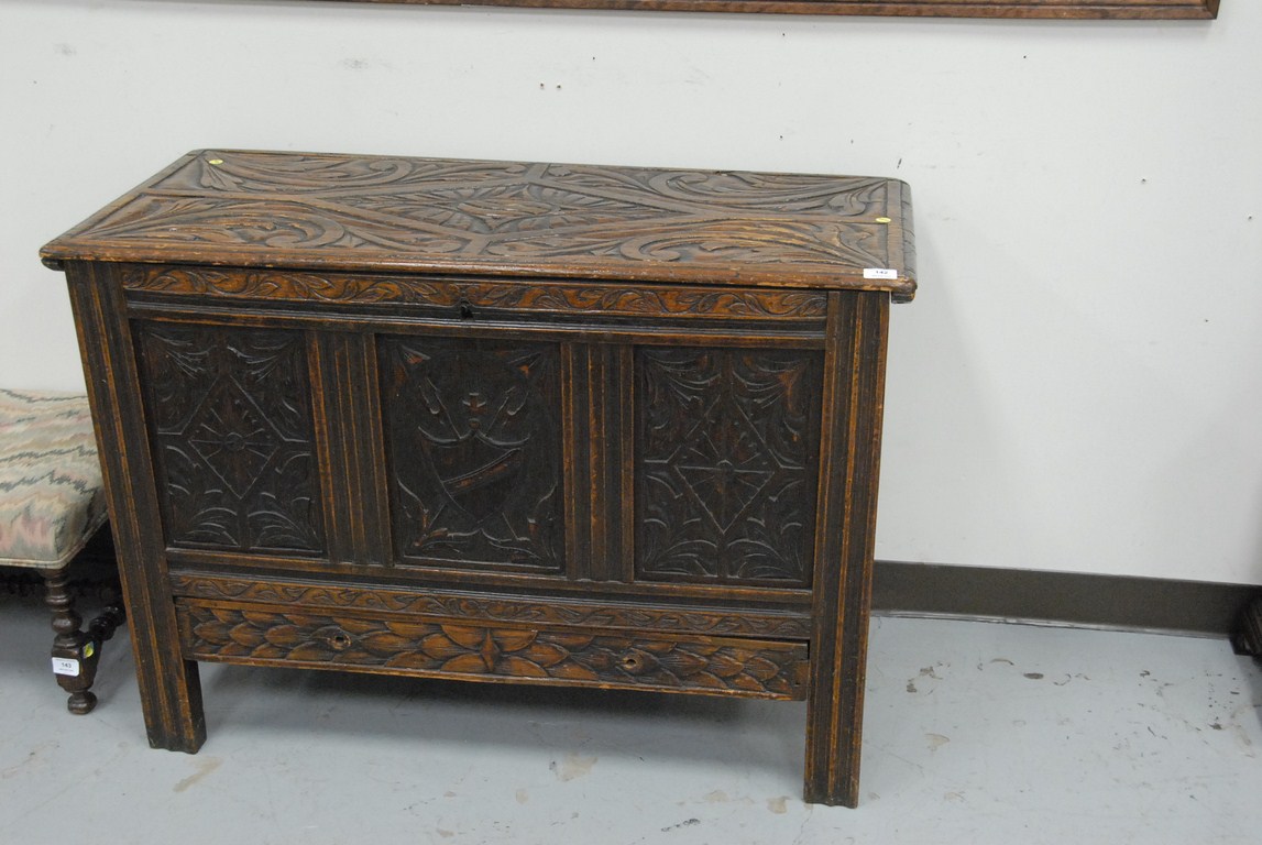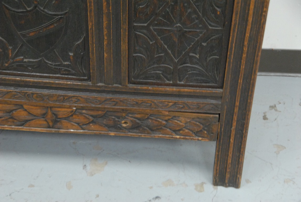 Lot 142: Oak Jacobean style lift top chest with carved top and panels. ht. 30in. wd. 42in. Provenance: Estate of Charles Archibald Goodwin…..