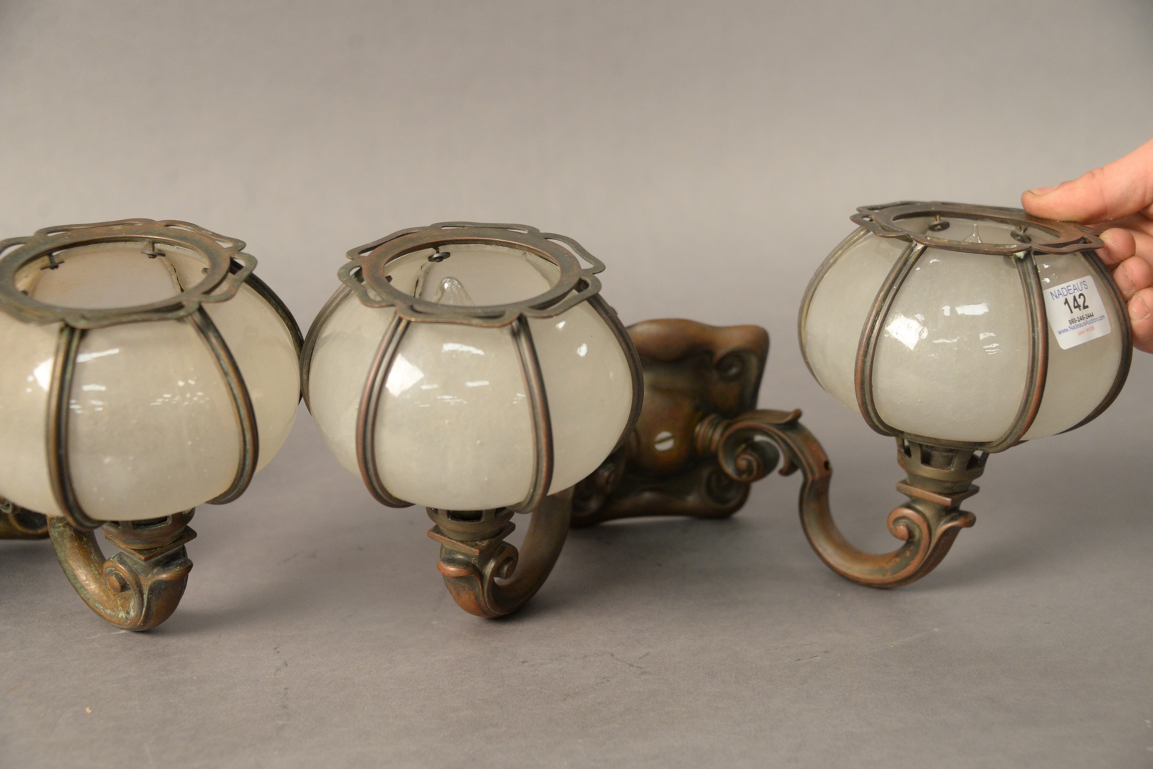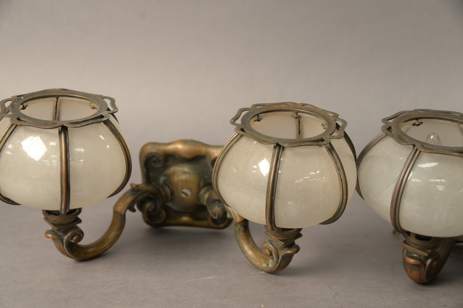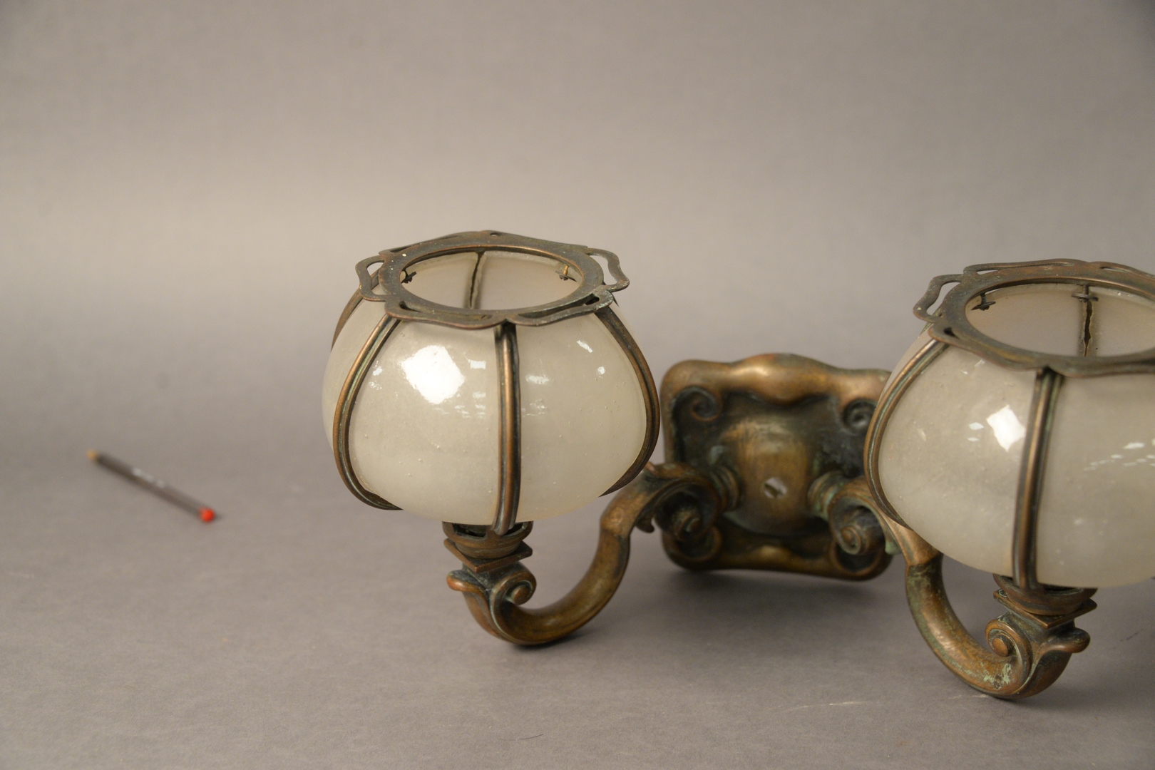 Lot 142: Pair of Art Nouveau Two Light Bronze Wall Sconces, possibly Handel, height 8 inches, width 14 inches.