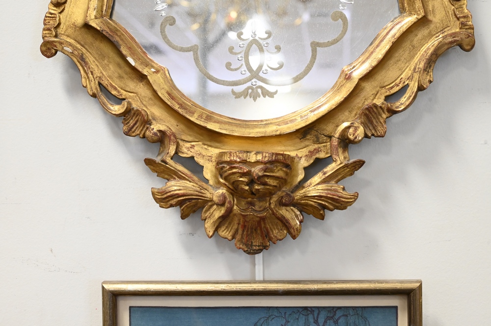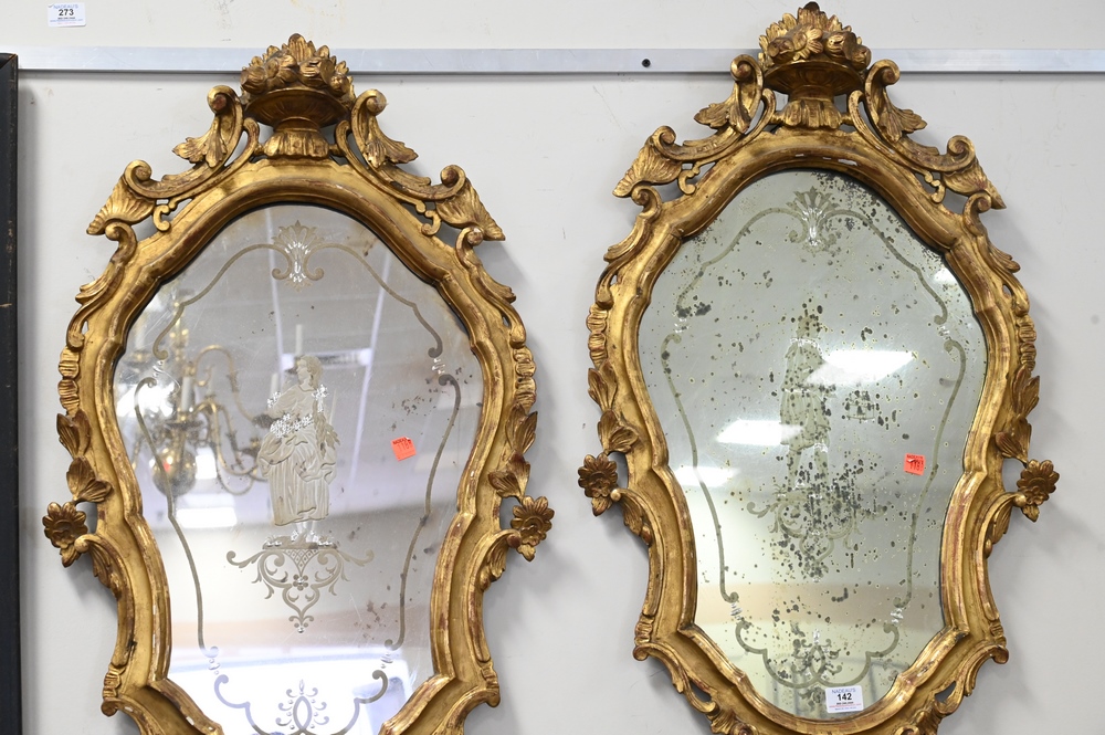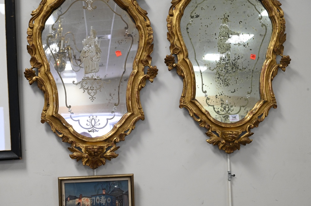 Pair of Gilt Venetian Style Mirrors, having etched figures, height 34 inches.