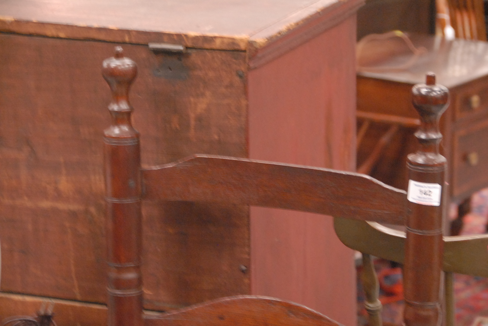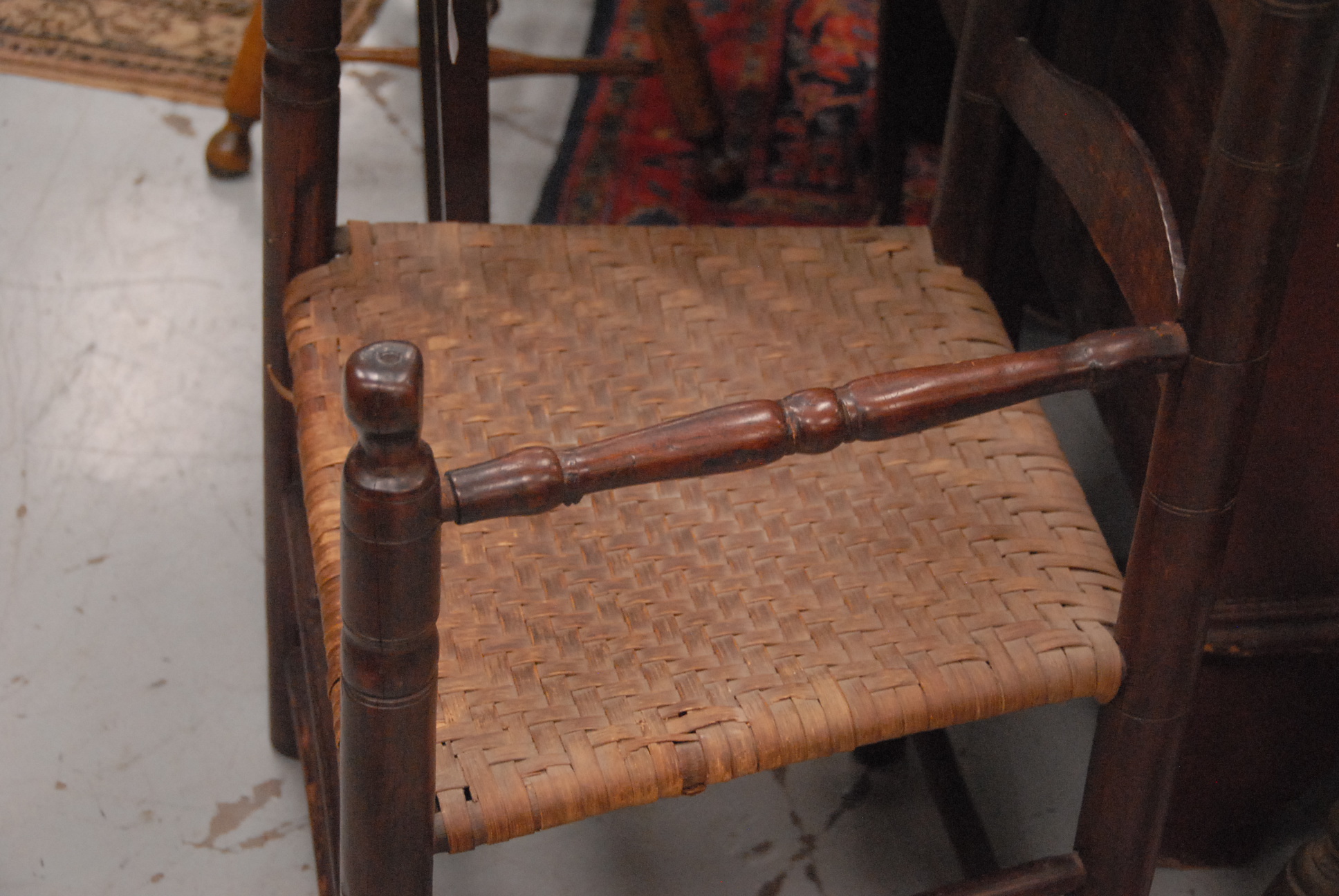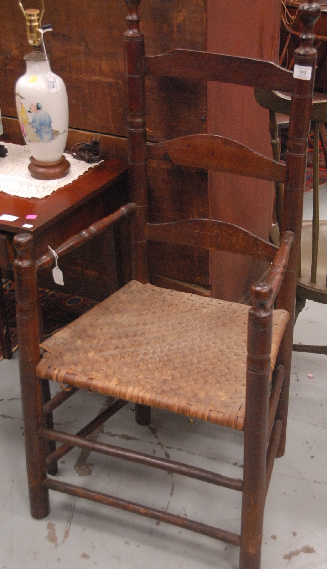 Lot 142: Primitive ladder back great chair with turned finials, three slat back, and turned hand rests on turned legs ended out, late 17th century. seat ht. 17 in. total ht. 45 1/4 in. Provenance: Property from the Estate of Elizabeth and Edw
