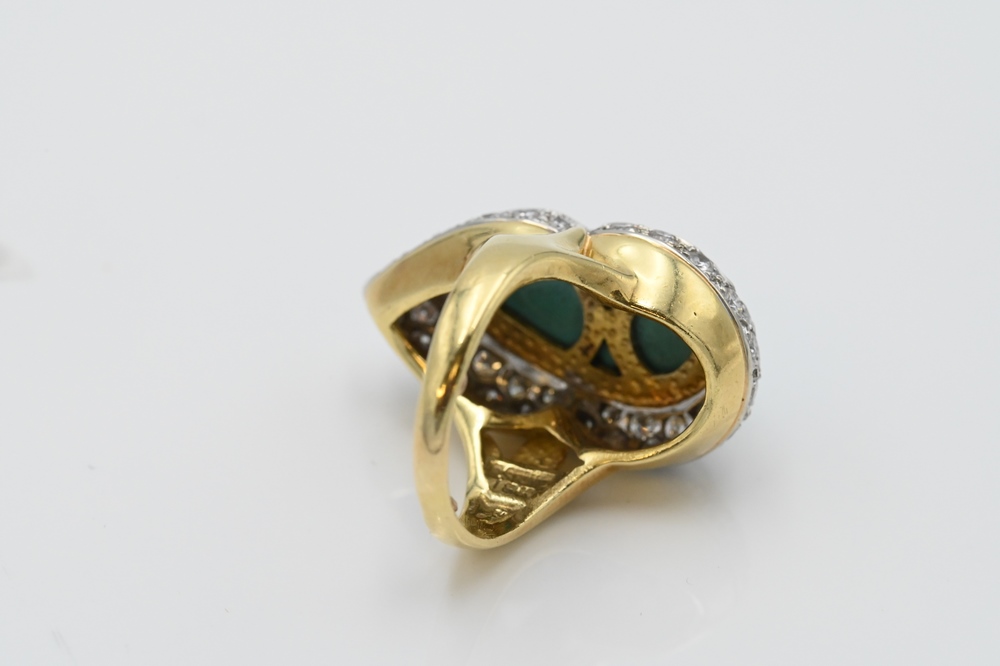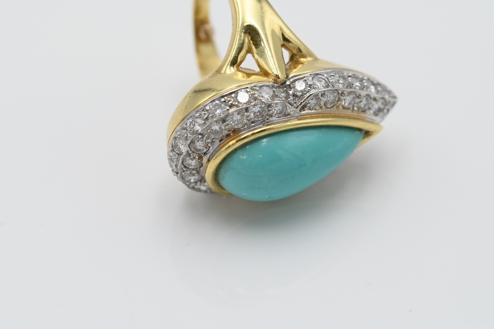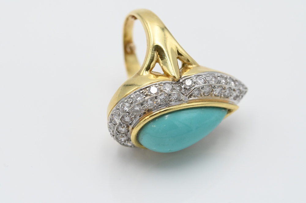 Lot 142: R. Stone 18 Karat Yellow Gold Ring, set with teardrop turquoise surrounded by two tiers of diamonds, size 5 3/4, 16.1 grams.