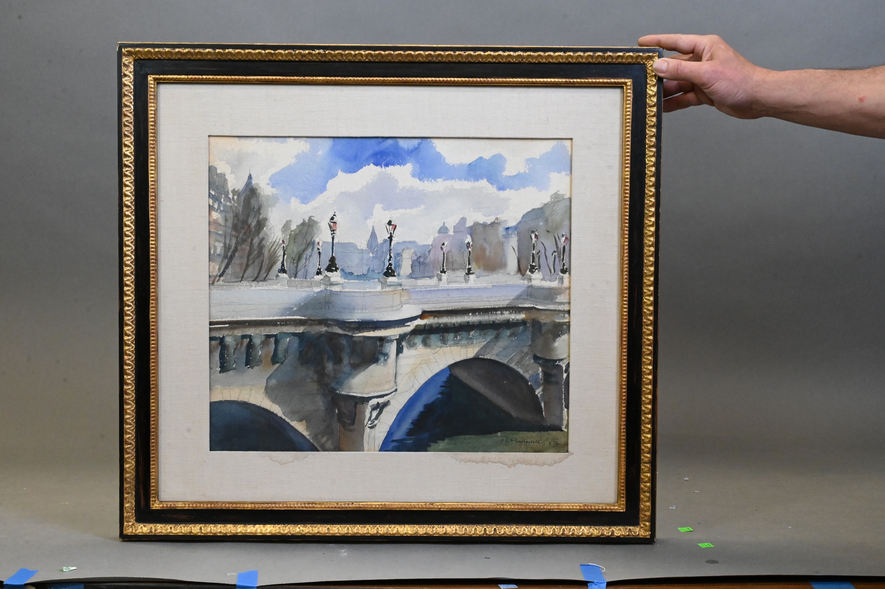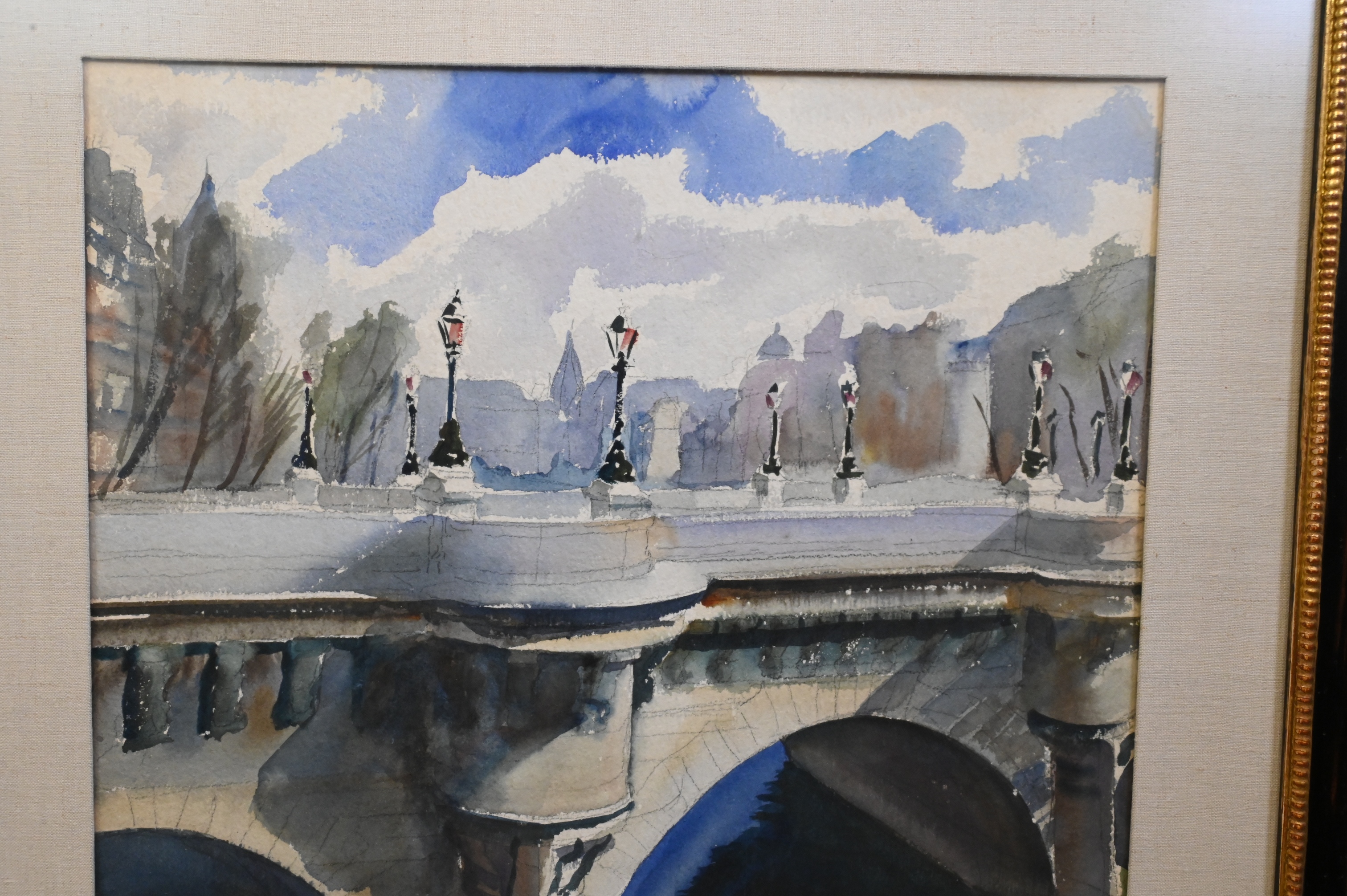 watercolor on paper depicting the Pont Neuf spanning the Seine with stylized Parisian skyline beyond, lined with lampposts and soft atmospheric washes of blue and gray tones