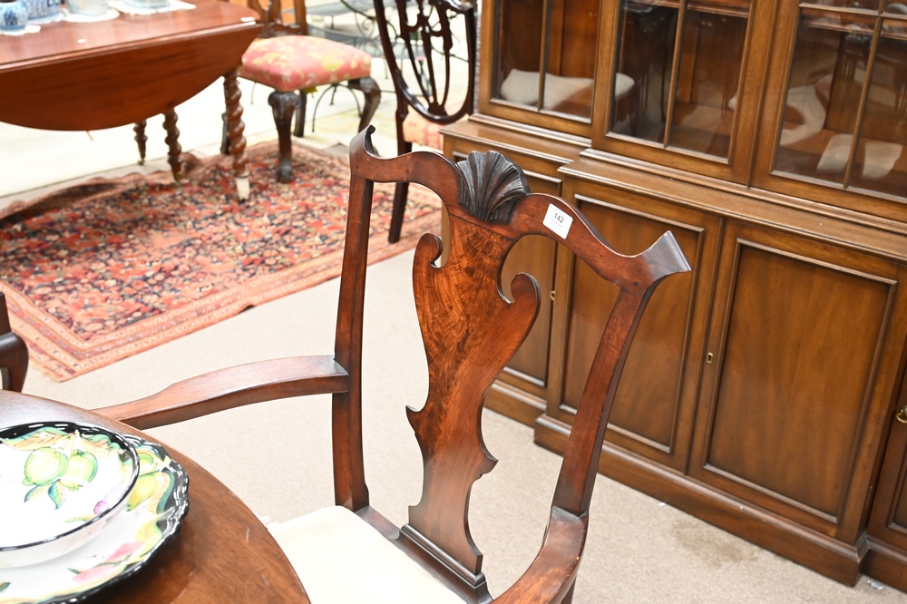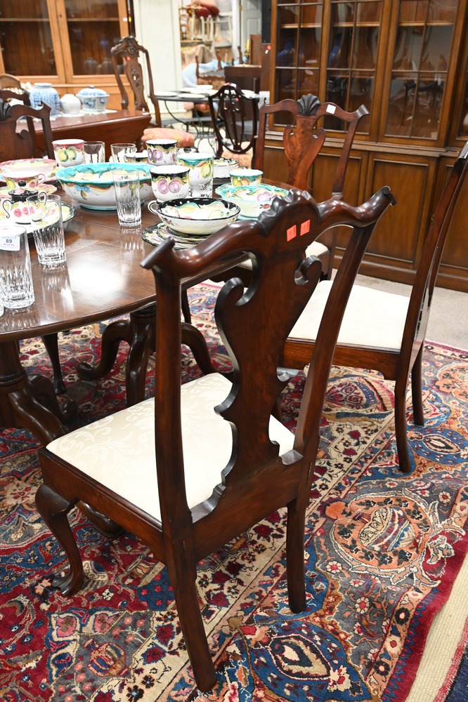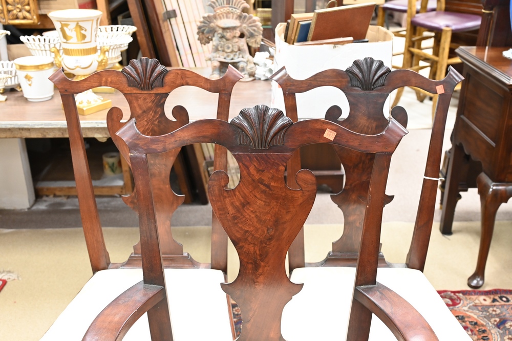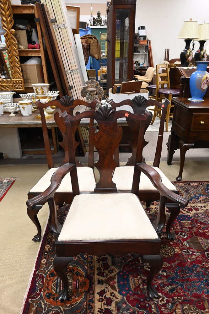 Lot 142: Set of Eight Walnut Pennsylvania Style Handmade Dining Chairs, having shell carved backs and trifed foot, all chairs are mortised and pinned, to include two armchairs and six side chairs, height 41 inches.