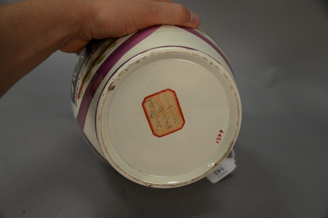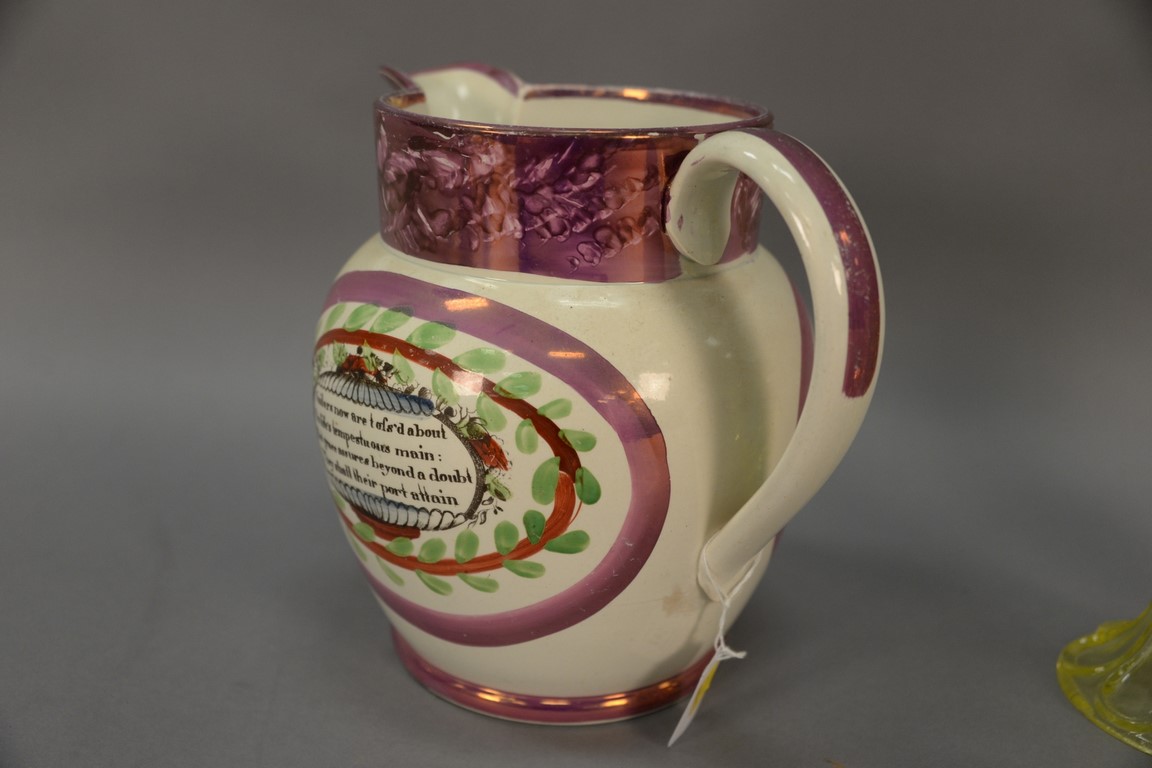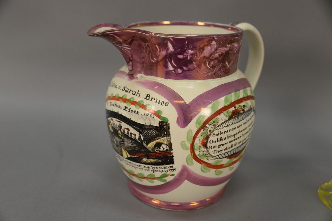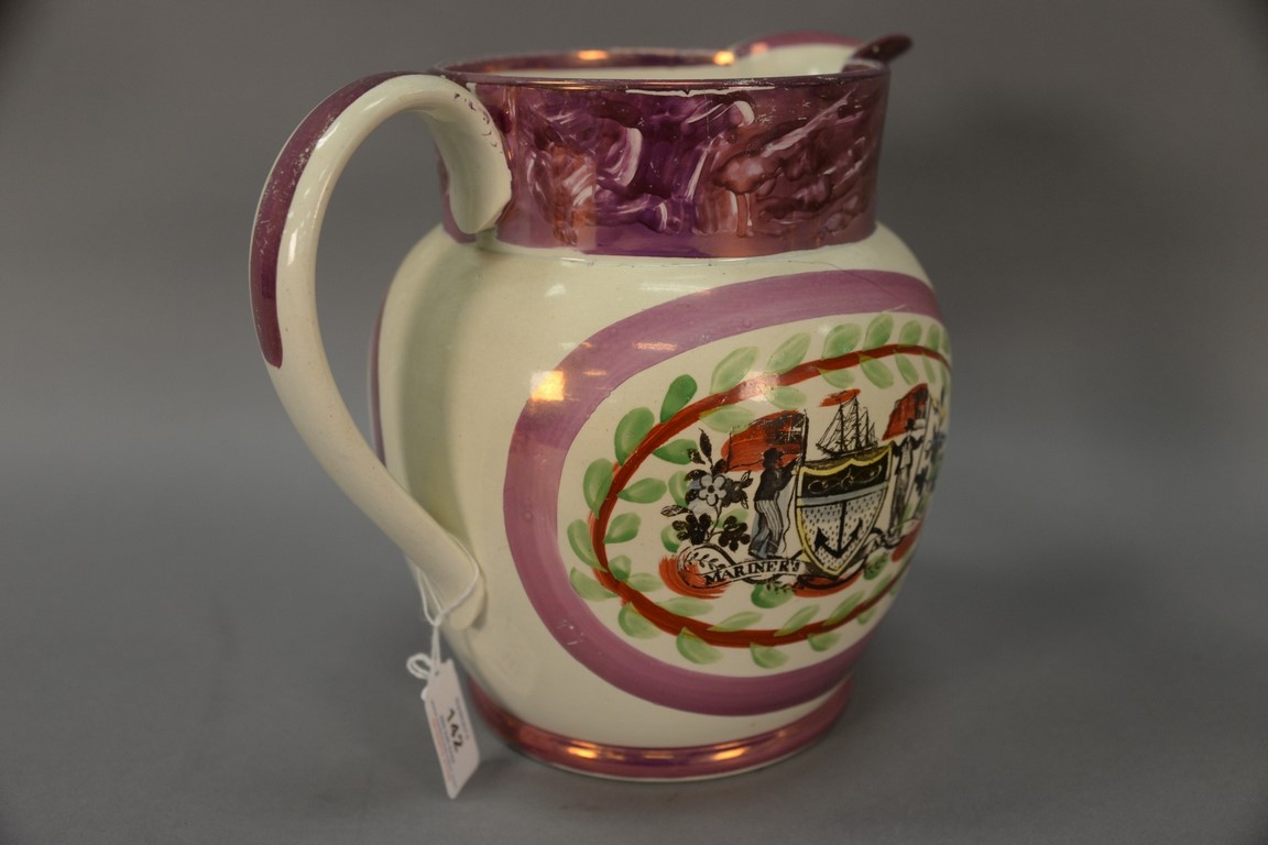 Lot 142: Sunderland copper luster pitcher, on front: William & Sara Bruce Dedham Essex 1831, depicting Sunderland Ironbridge Mariner’s Arms …