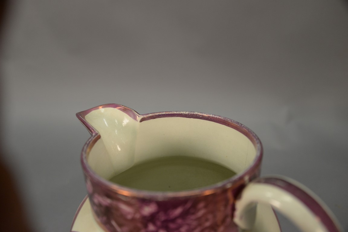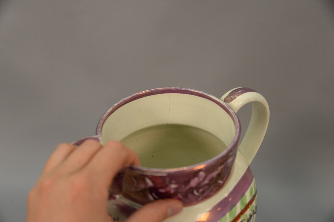 Sunderland copper luster pitcher, on front: William & Sara Bruce Dedham Essex 1831, depicting Sunderland Ironbridge Mariner’s Arms crack and repair. ht. 9 1/4in. Provenance: Property from the Francis Du Pont Collection drawn from a home in Farmington, CT