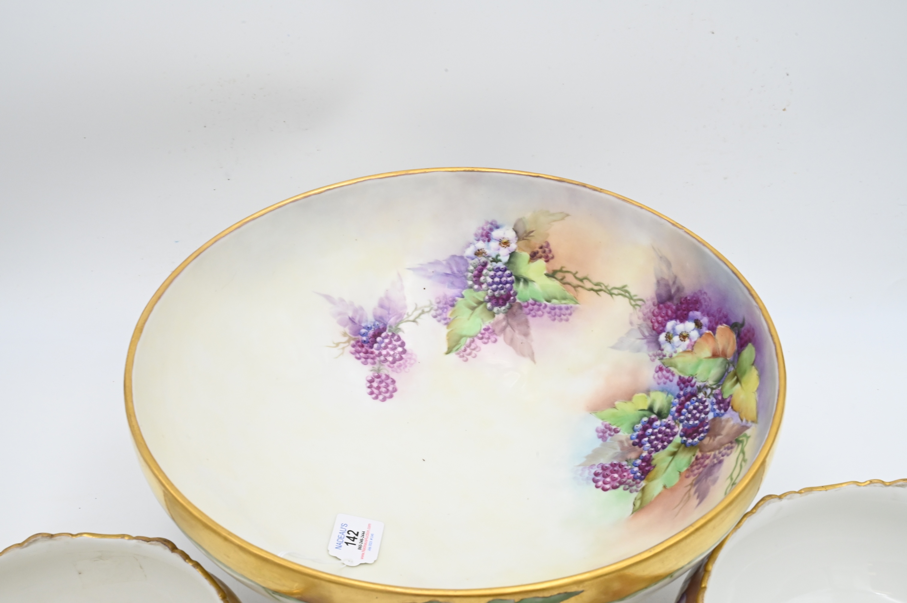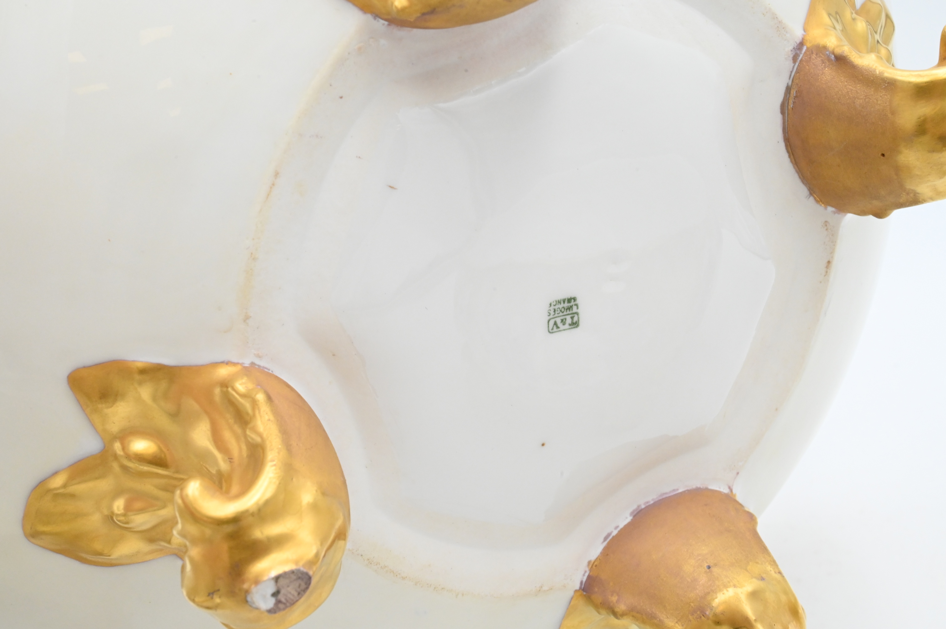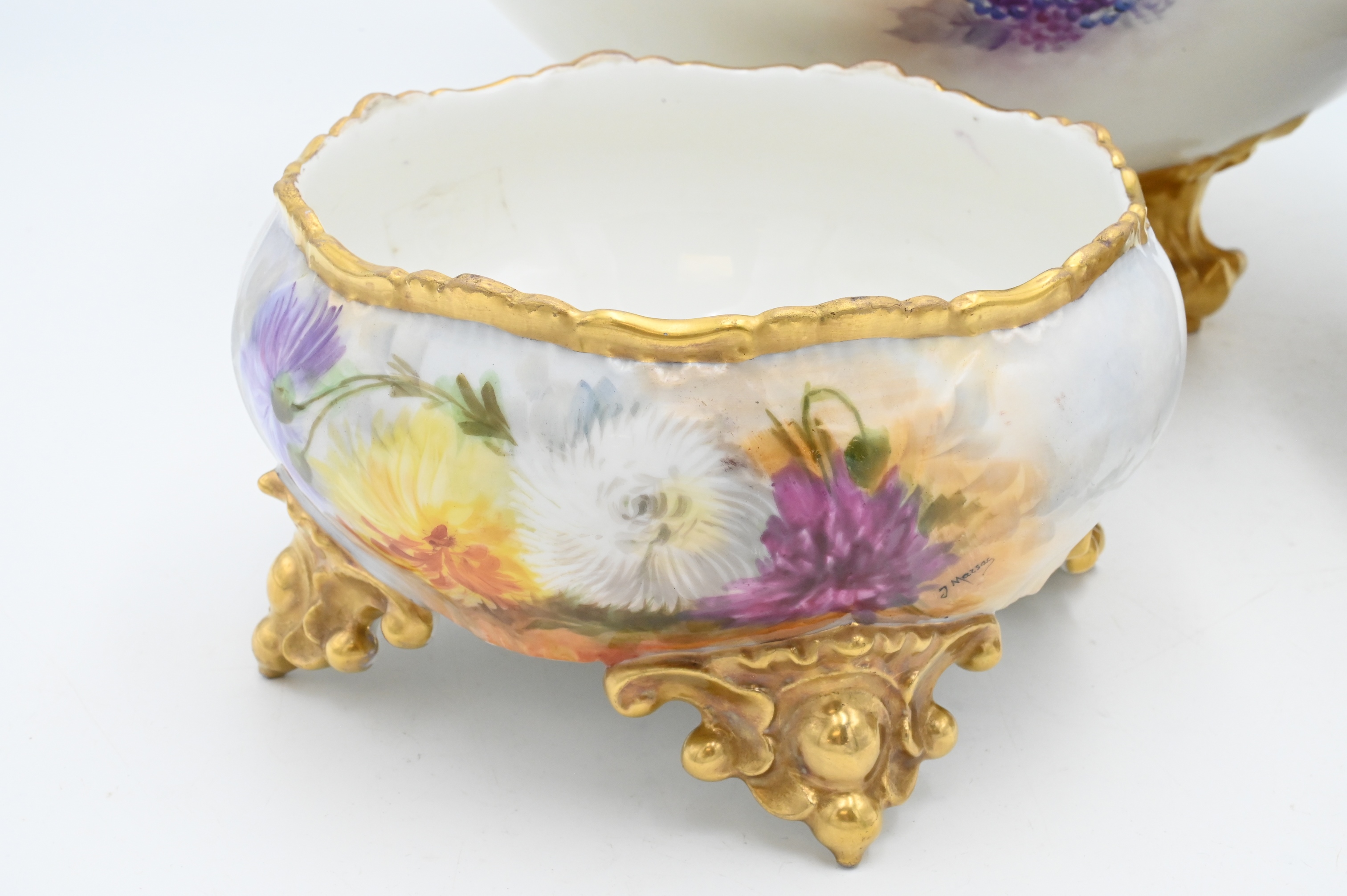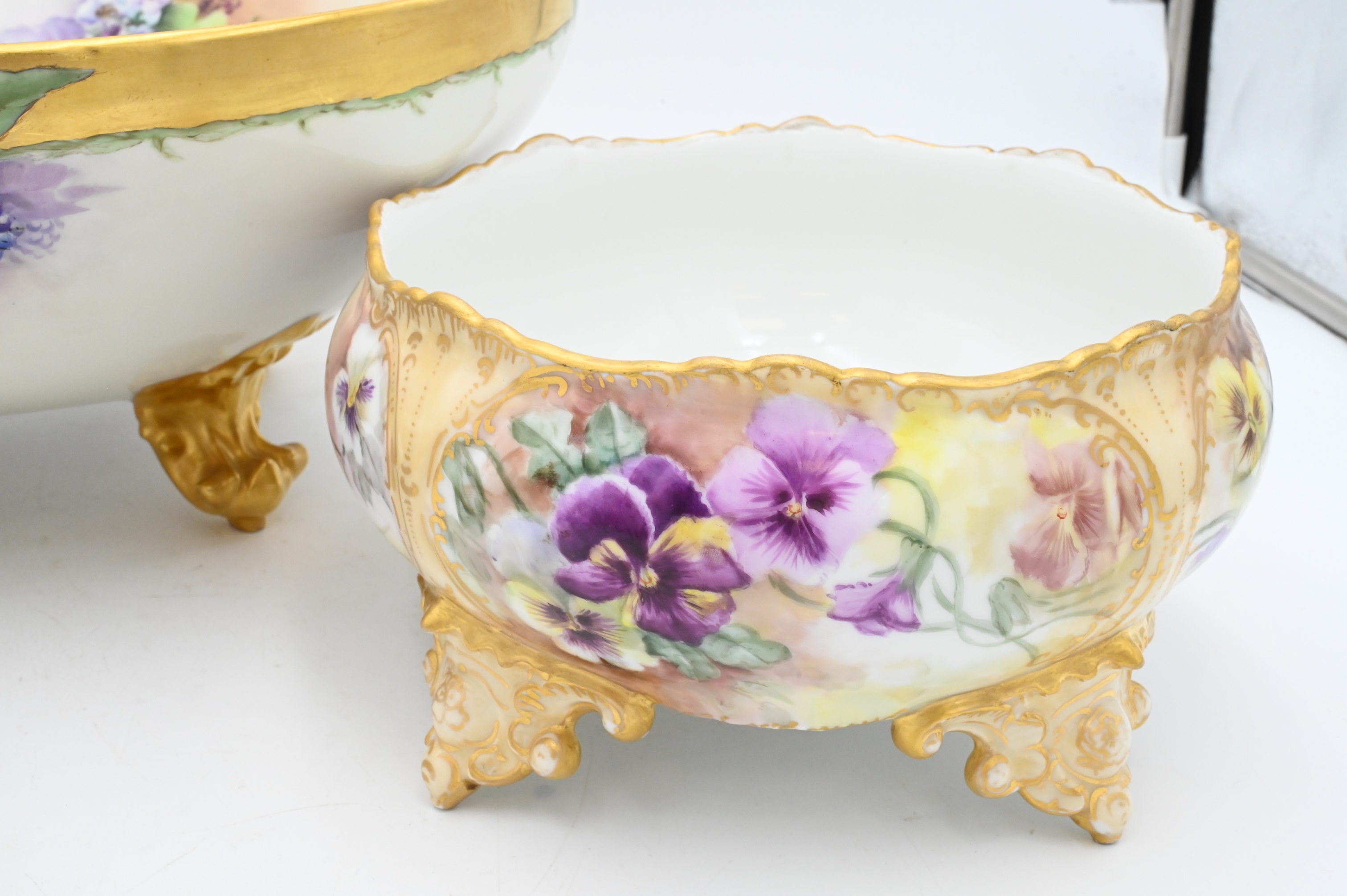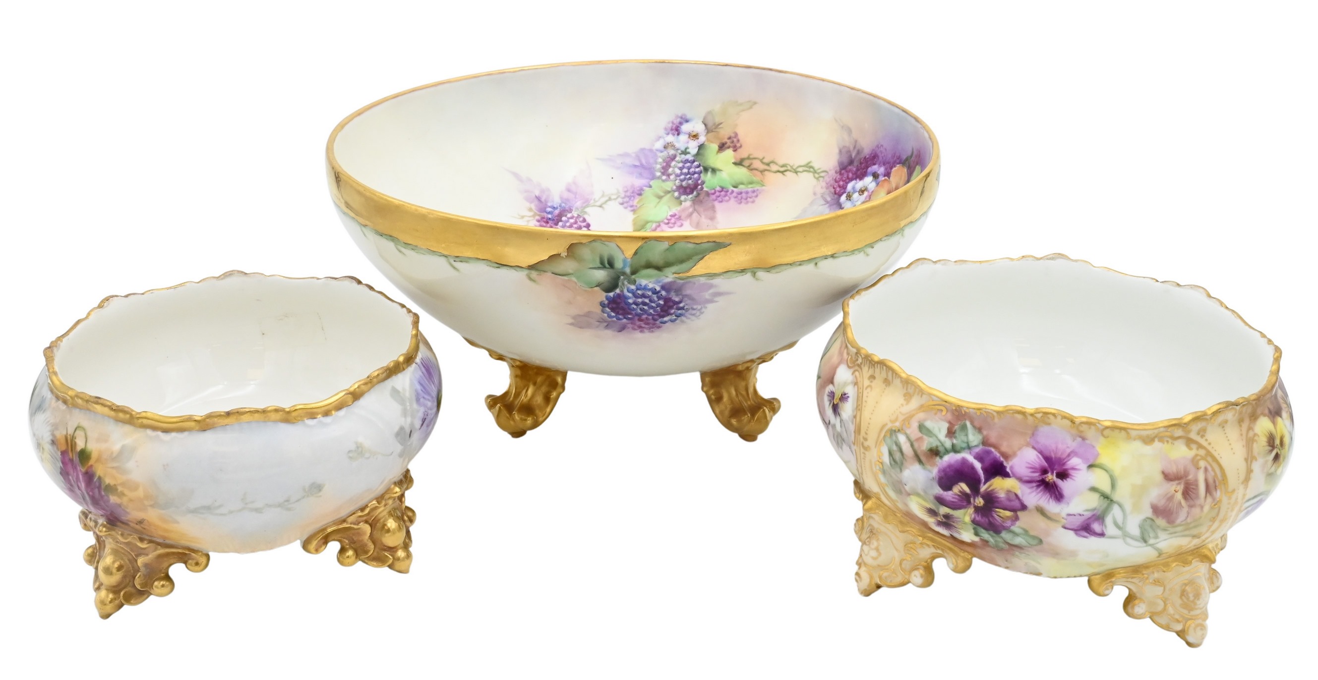 Three Piece Limoges France Hand Painted Porcelain Lot, to include large punch bowl with fruit and flowers set on gilt feet, along with two artist signed bowls with flower motif, each set on three gilt feet, punch bowl, height 6 1/2 inches, diameter 14 inches.