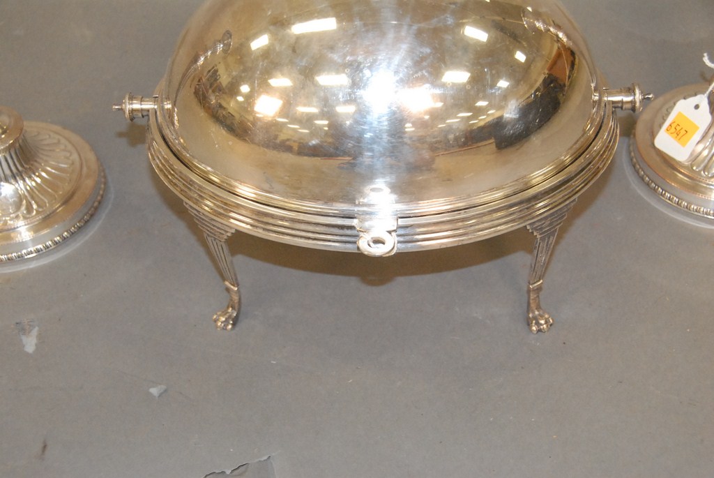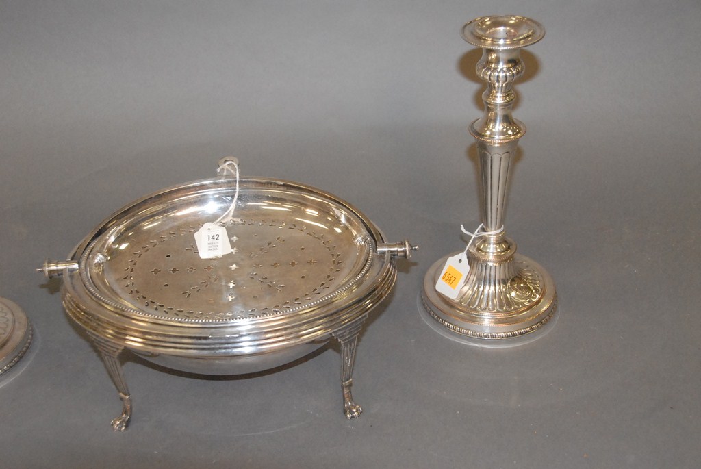 Three piece silverplated lot revolving tureen and silverplated pair of candlesticks.