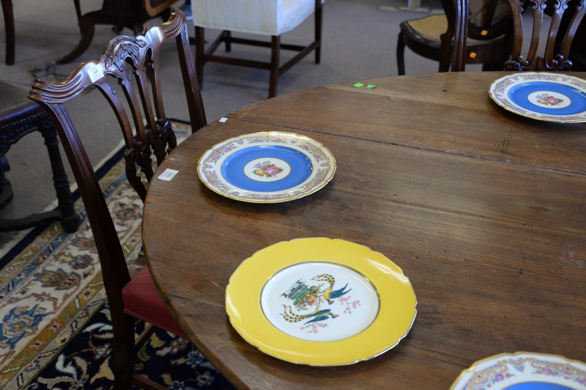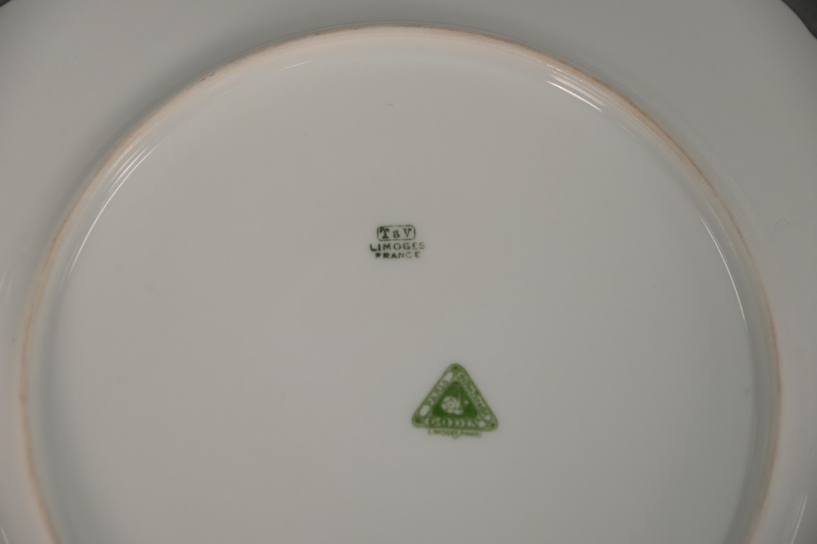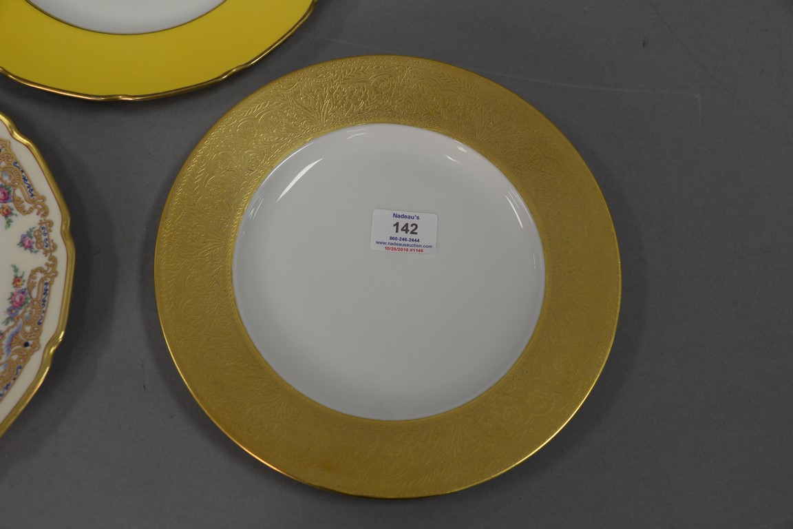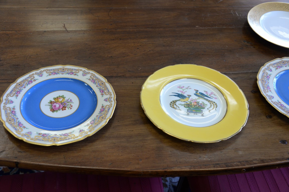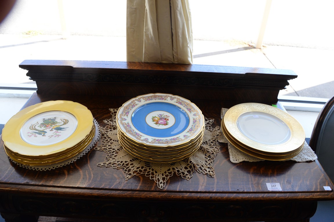 Three sets of porcelain plates including set of twelve LImoges dinner plates, set of eight Ovington Bro’s. plates and a group of six Bavaria dinner plates with heavy gilt border. dia. 10 1/4in.