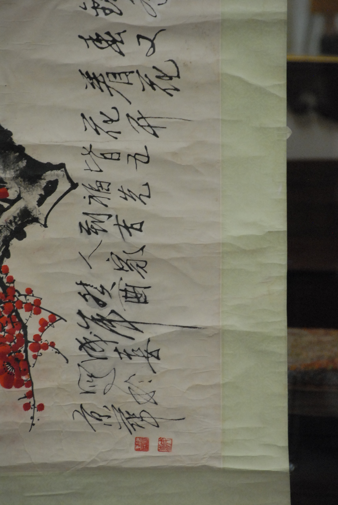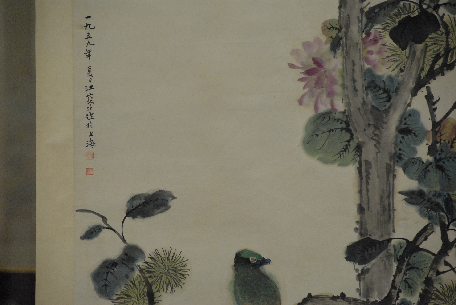 Two oriental scrolls, watercolor with bird on branch and horizontal blossoming apple tree.