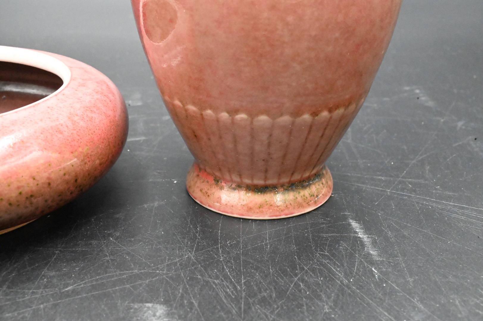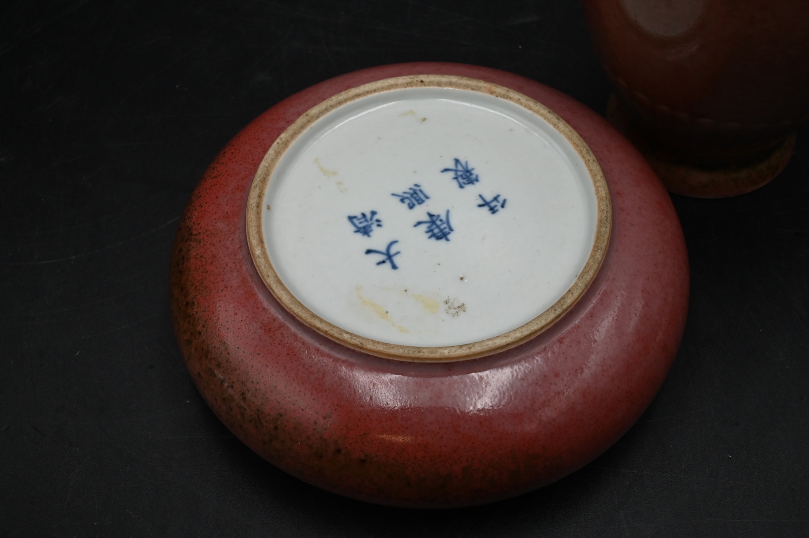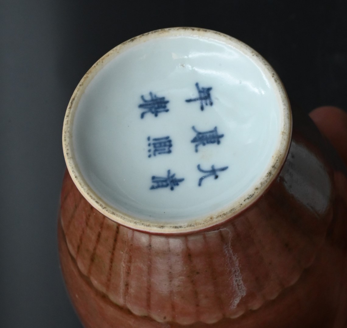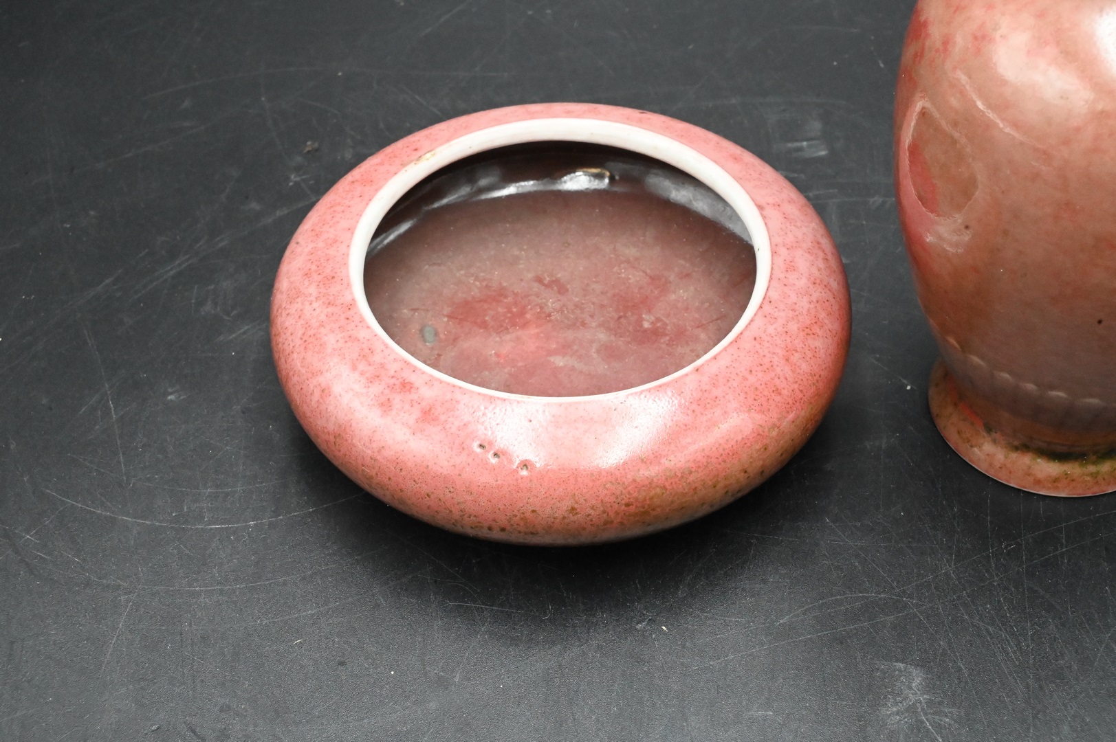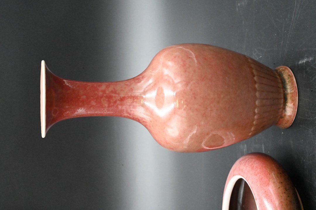 Two Peachbloom Articles for the Scholar’s Table, both are examples of the Eight Precious Shapes, to include a long-neck flower vase (huaping) with inverted petal decoration on lower body, no marking on base, height 8 inches, along with a compressed globular brush washer with inverted mouth rim and a spurious six-character Kangxi regnal mark on the base, diameter 5 inches.