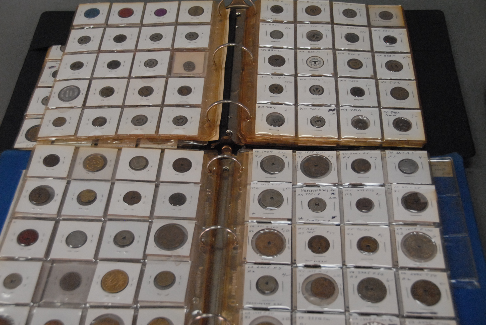 Lot 142B: Two large binders full of tokens and other transportation tokens to include states of West Virginia, Kentucky, Tennessee, Virginia, …