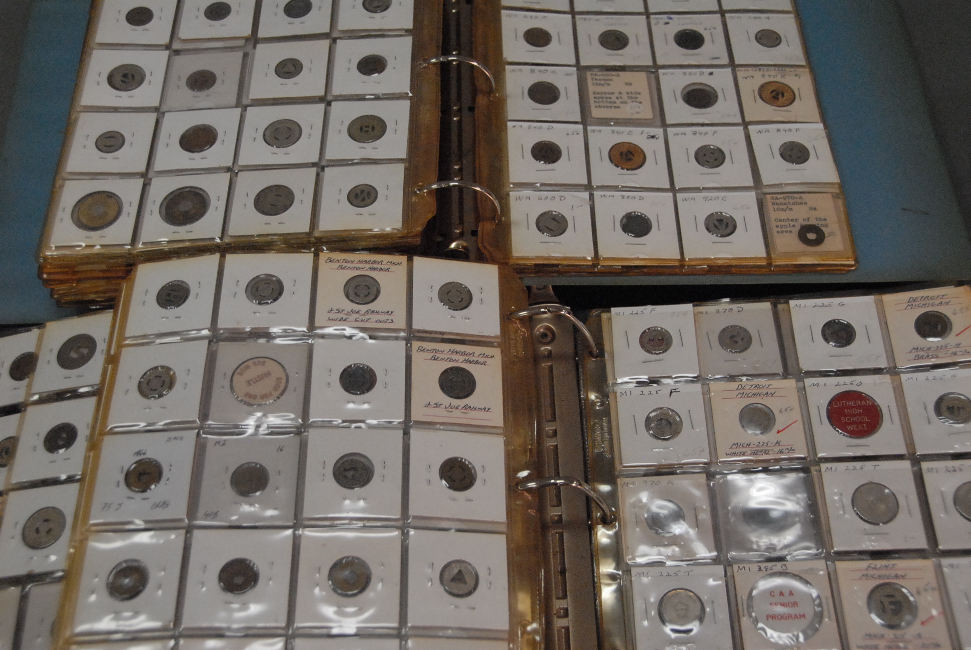 Two large binders full of tokens and other transportation tokens from states between Minnesota all states through to West Virginia and D.C.