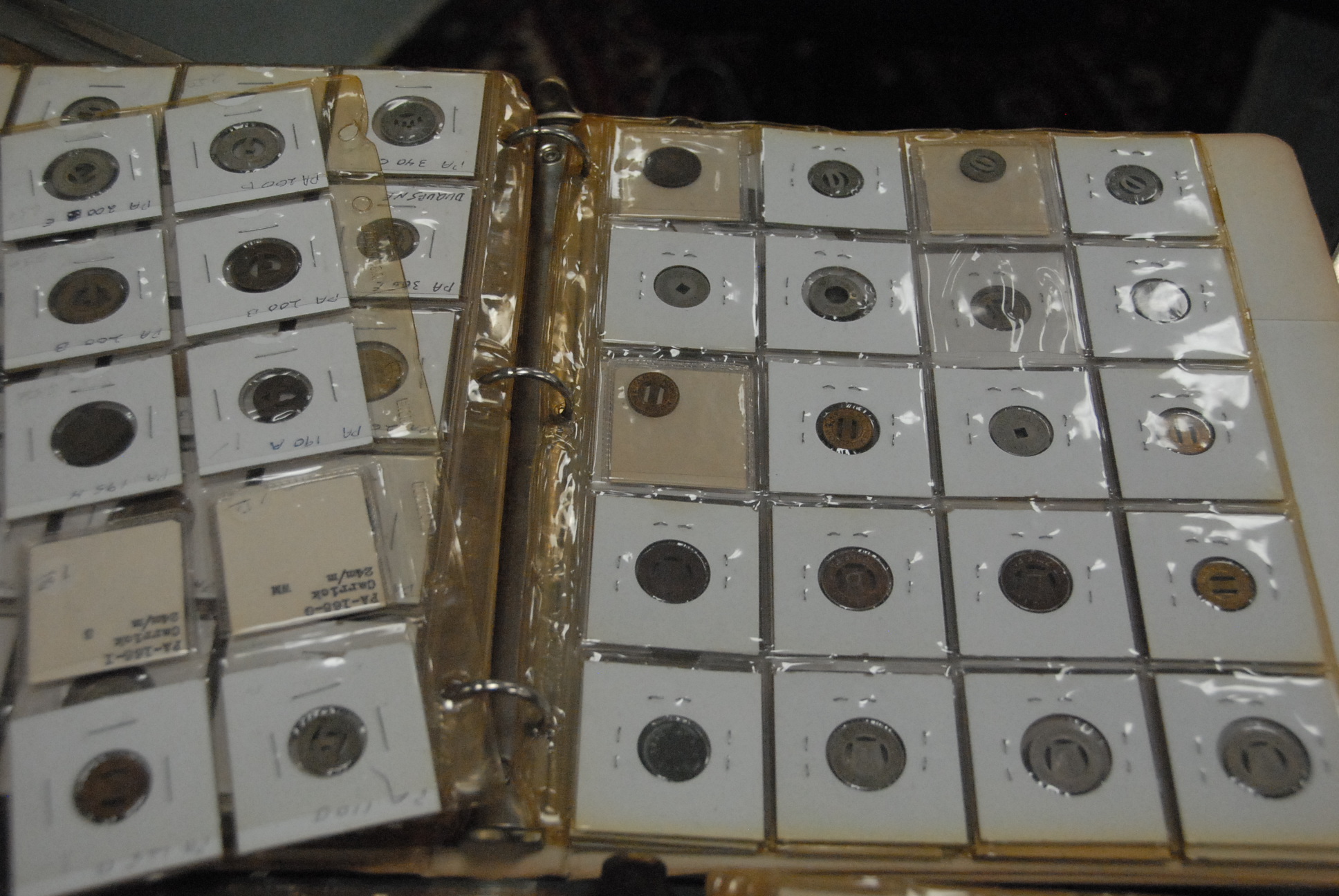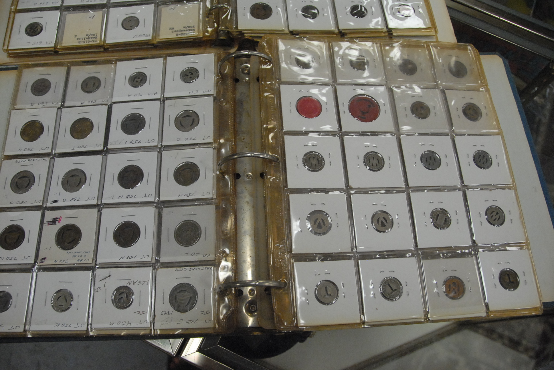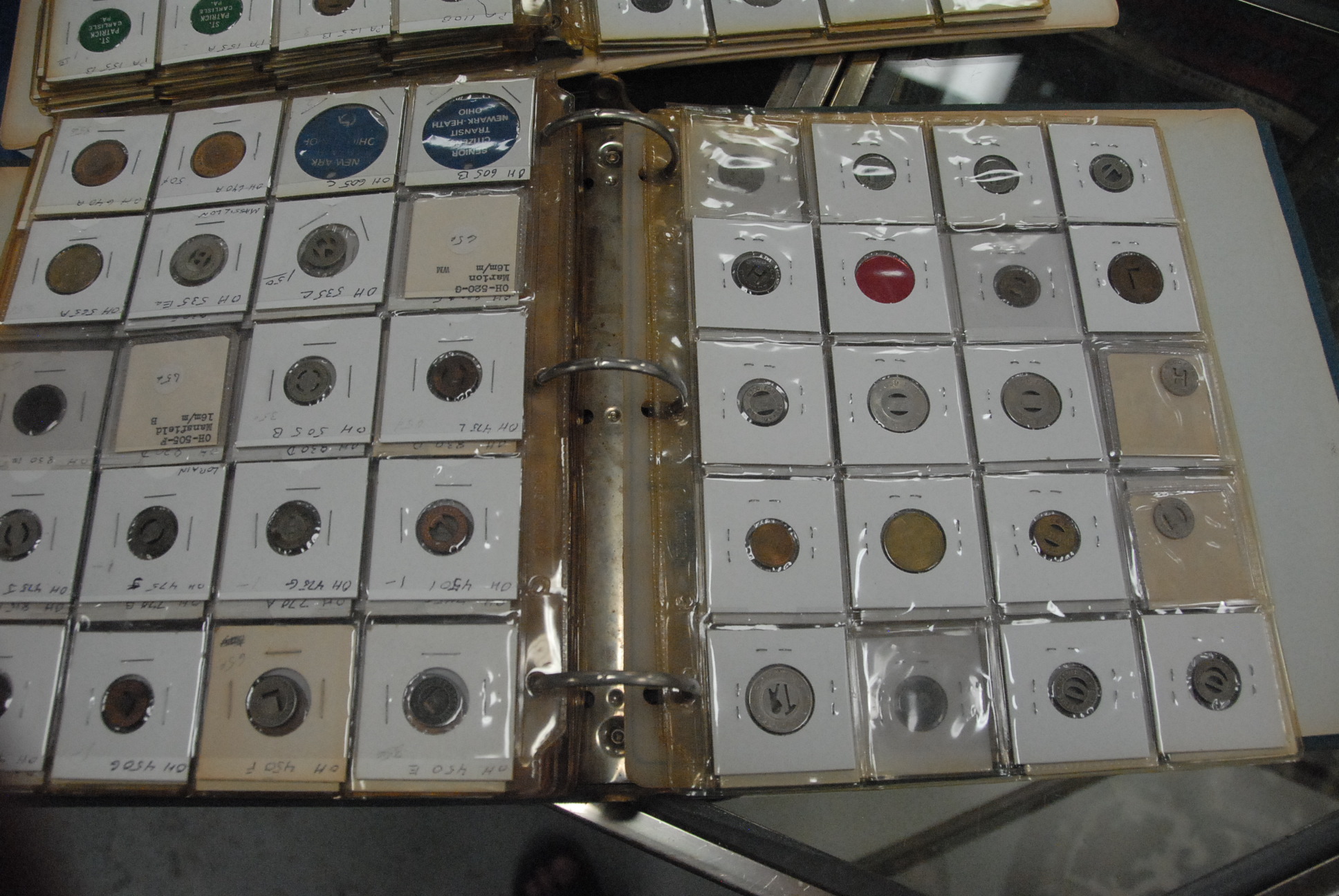 Two large binders full of tokens and other transportation tokens from Tennesee, Pennsylvania, Rhode Island, Texas, South Carolina.