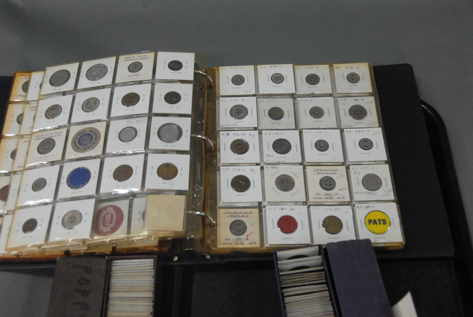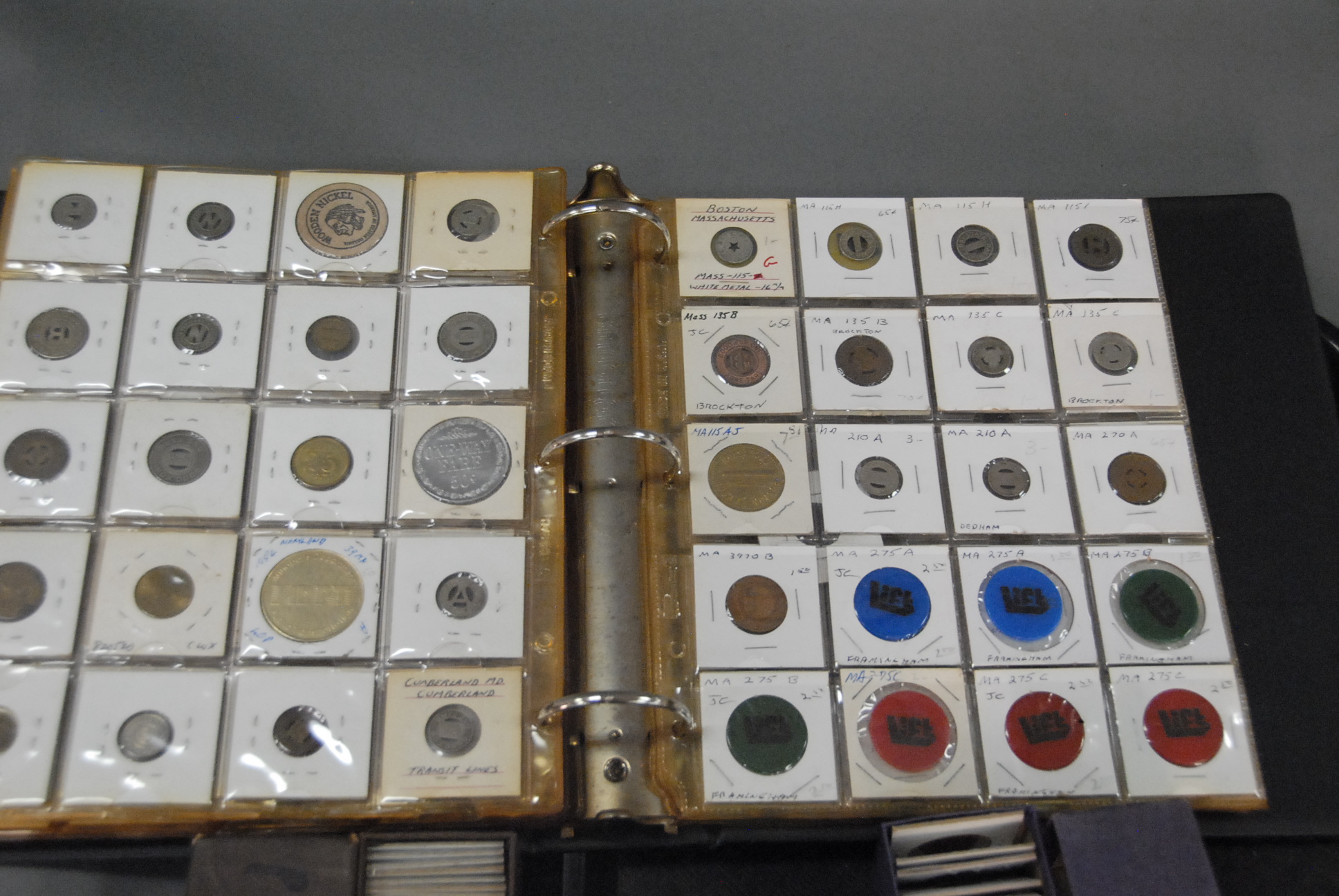 Lot 142H: Large binder with two boxes of various states’ tokens and other transportation tokens including Florida, Illinios, Kentucky, Massach…