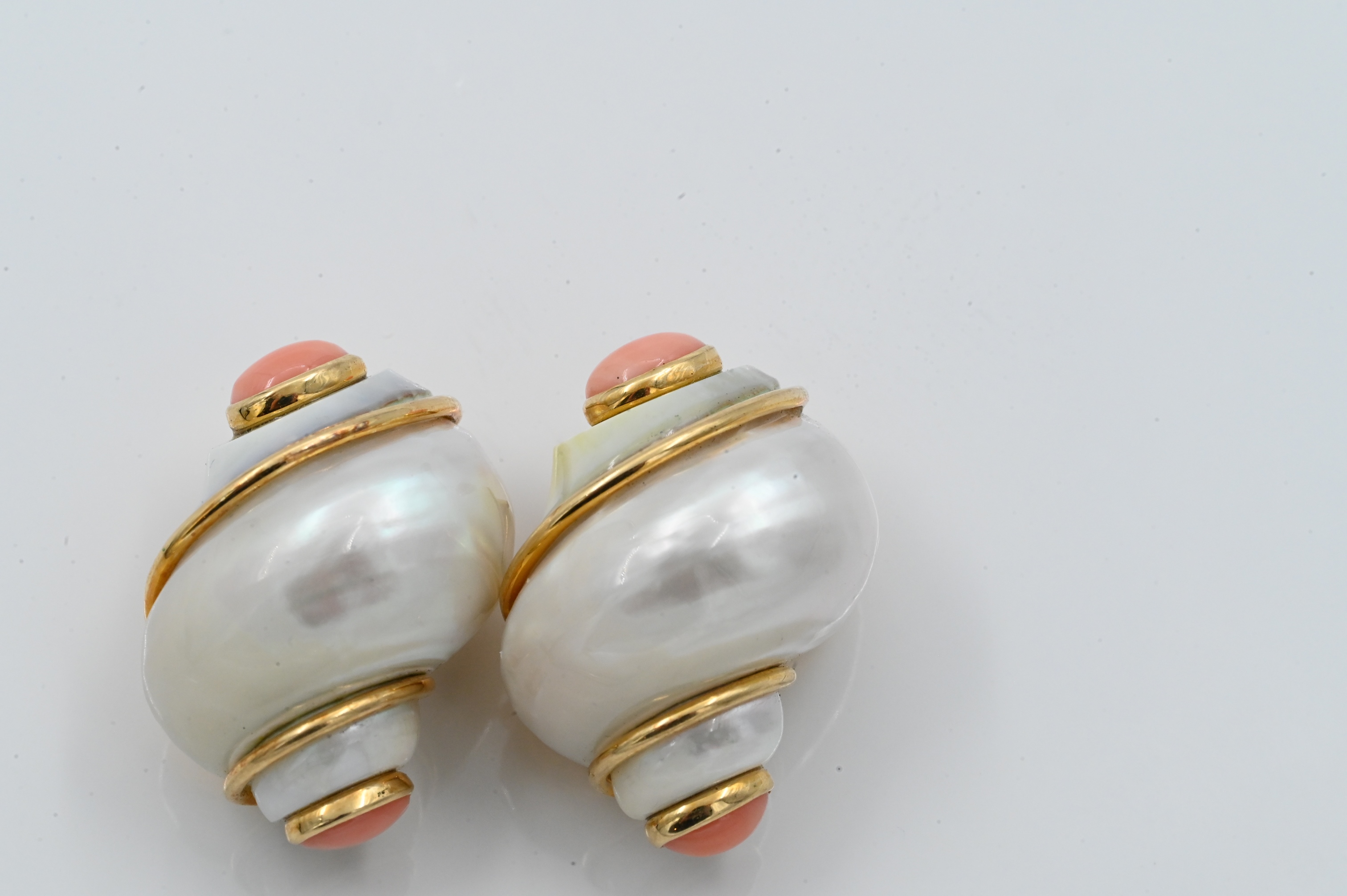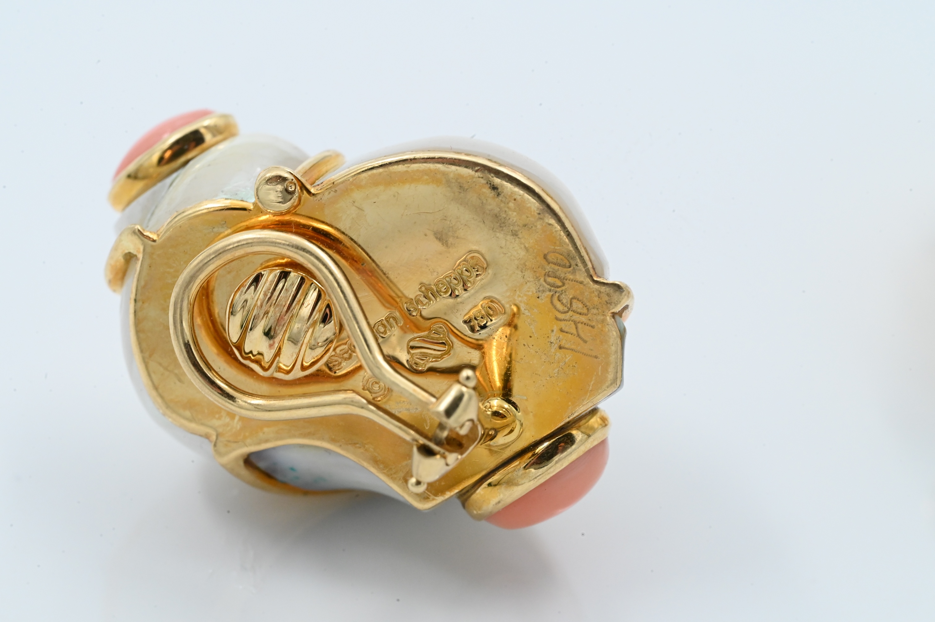 made of shell decorated with cabochon coral, marked Seaman Schepps 750, with original box