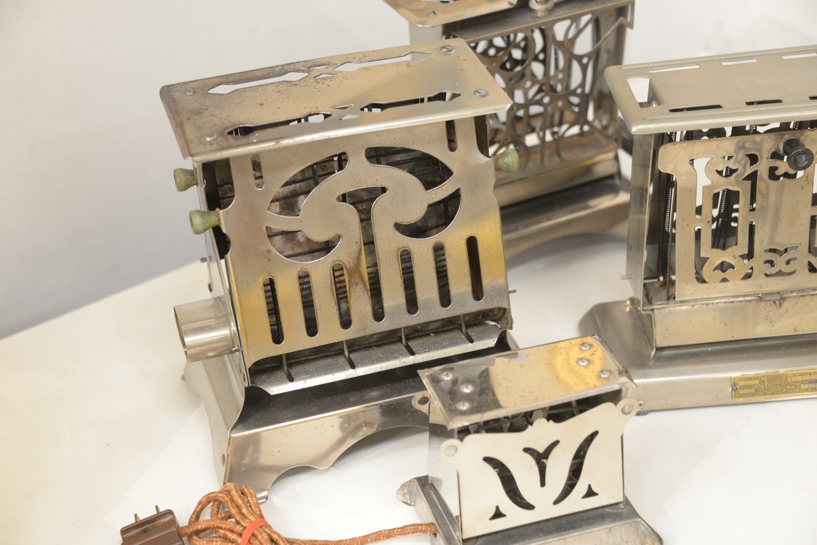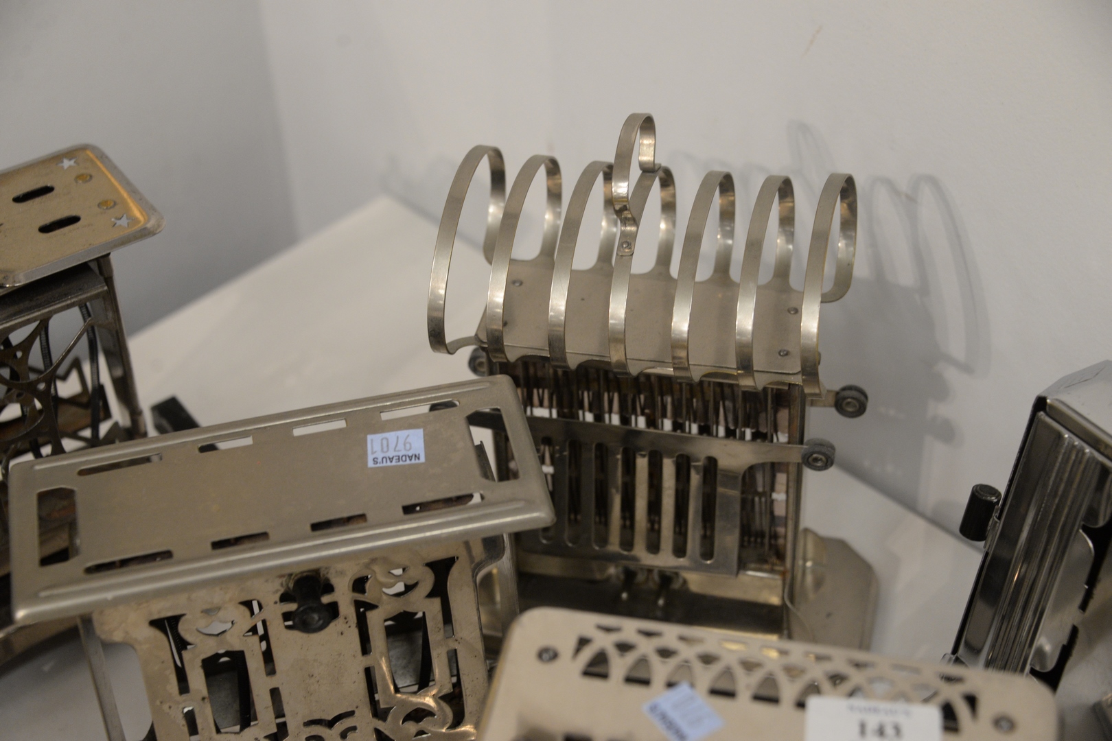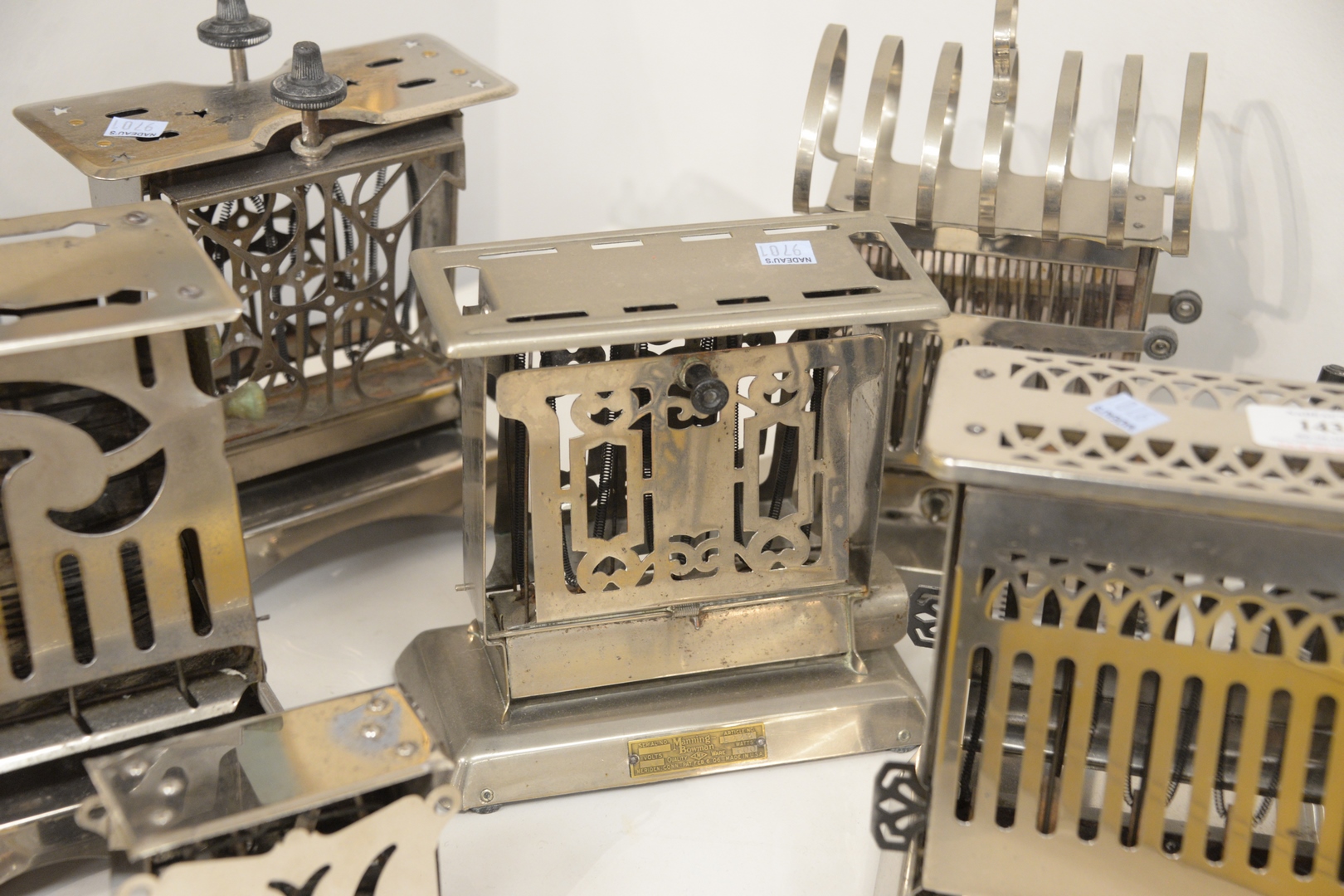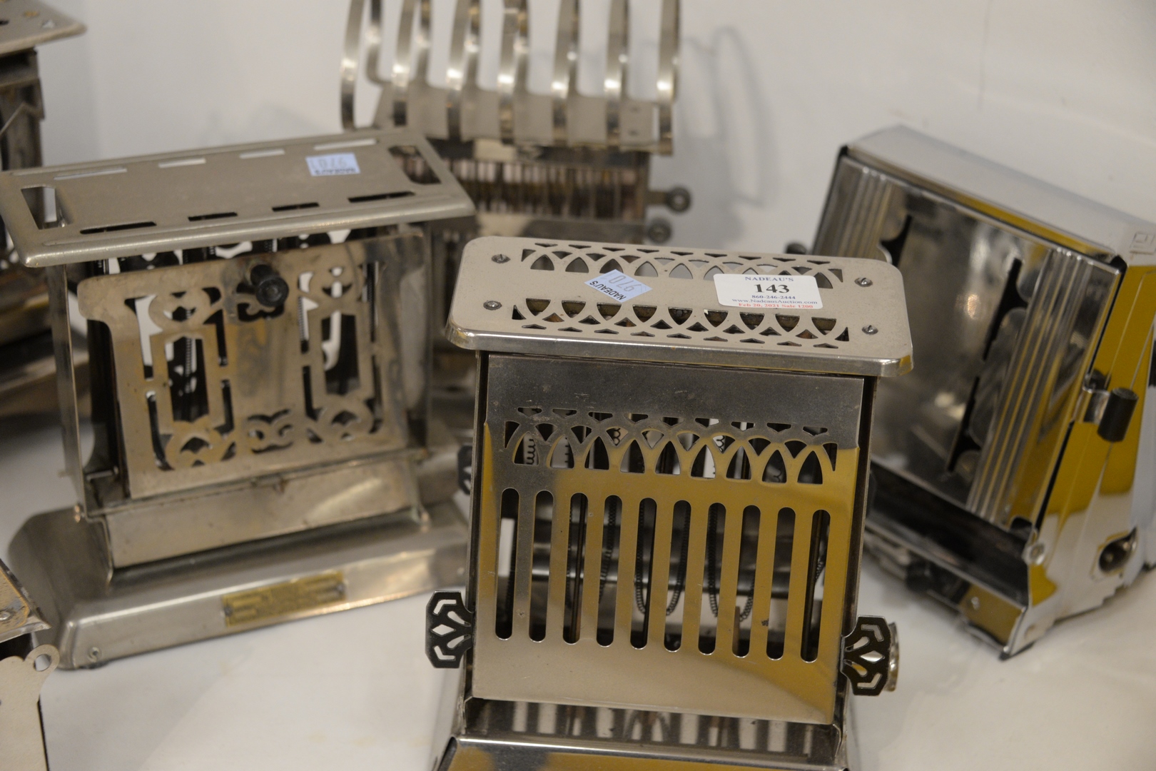Lot 143: A Group of Seven Vintage Toasters, to include an Electric Excel Toaster Toy; a Nimso-Tee Ten-Toaster; a Star Electric Toaster; Royal Rochester; along with others.