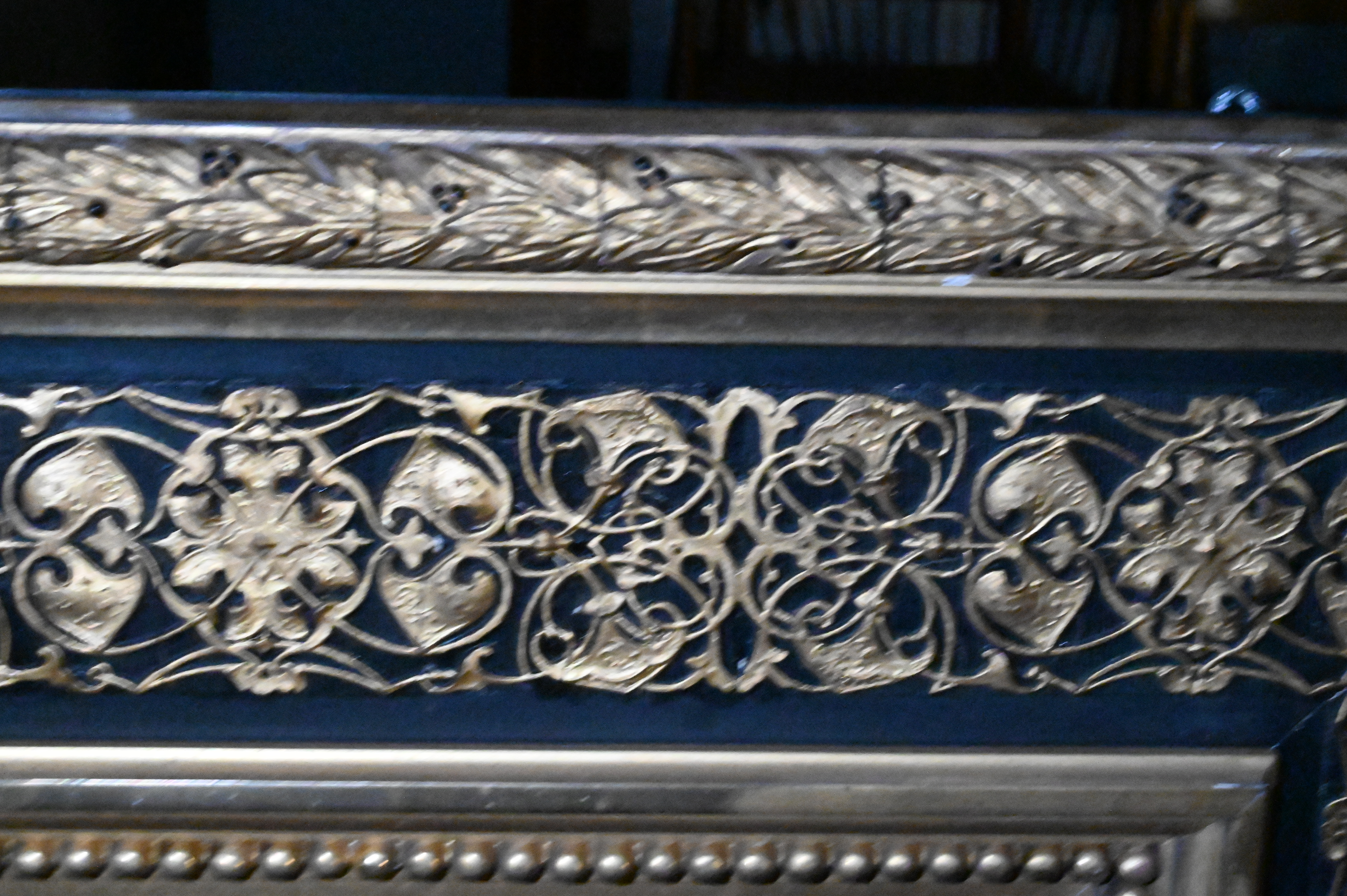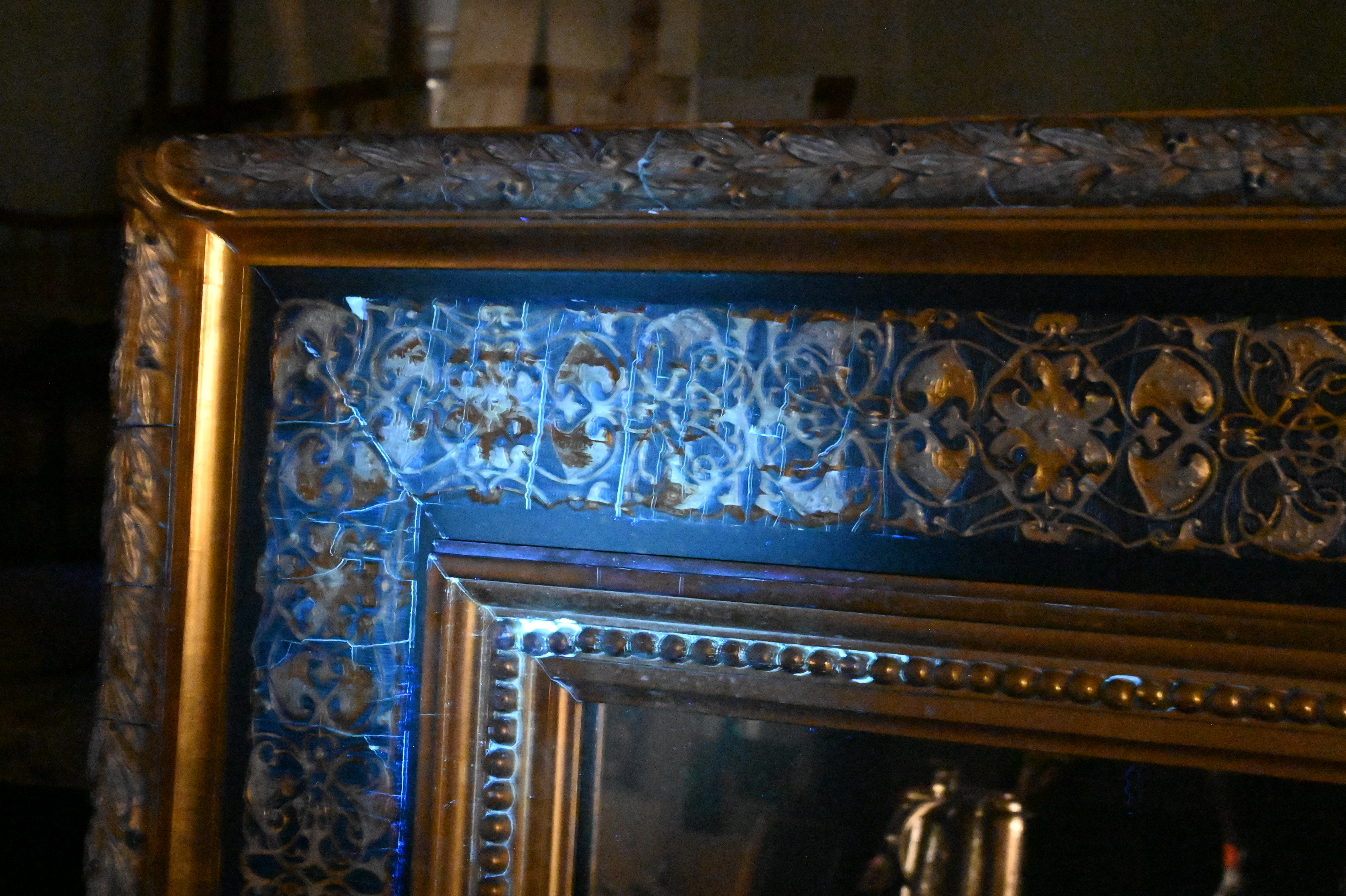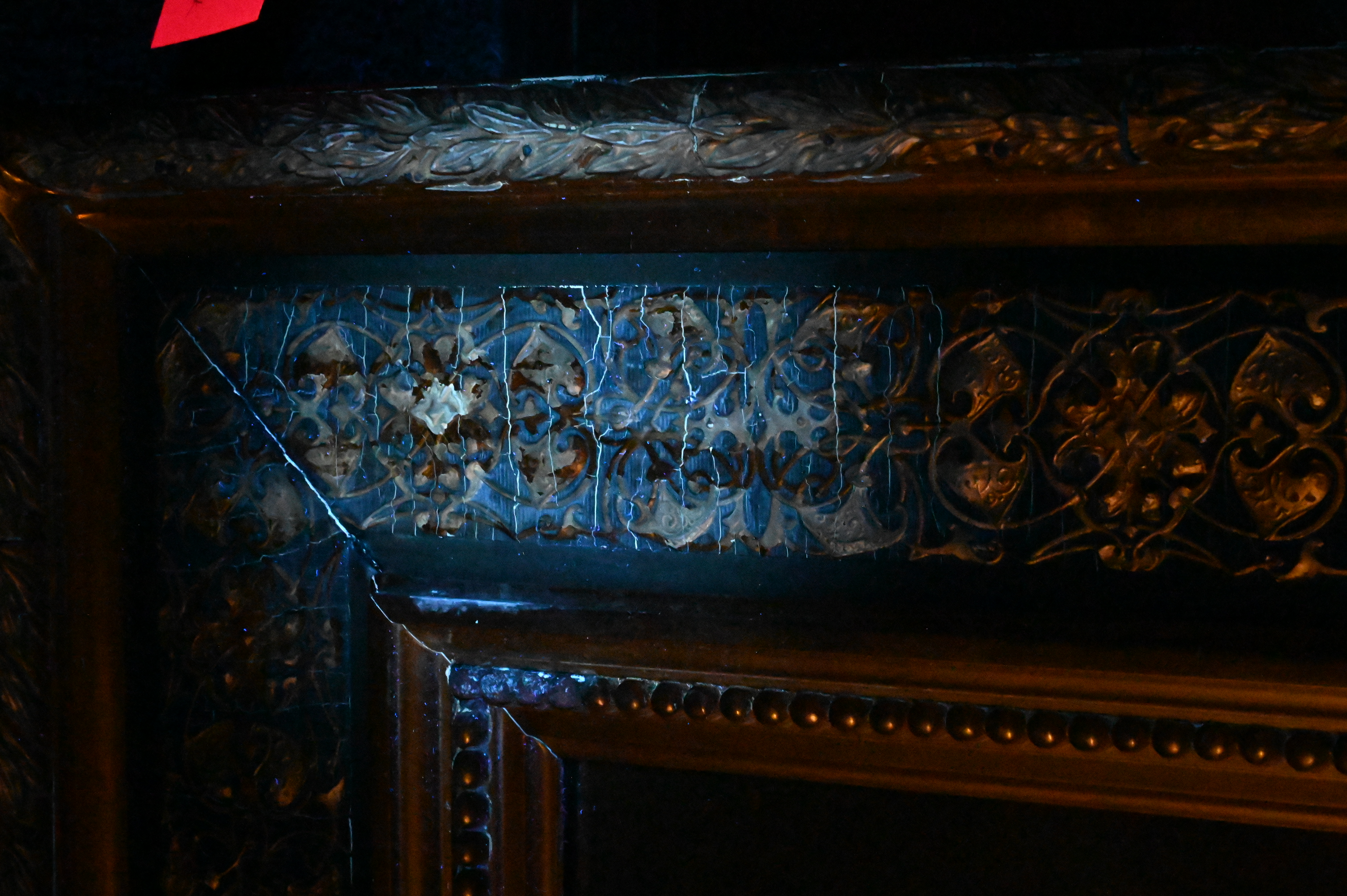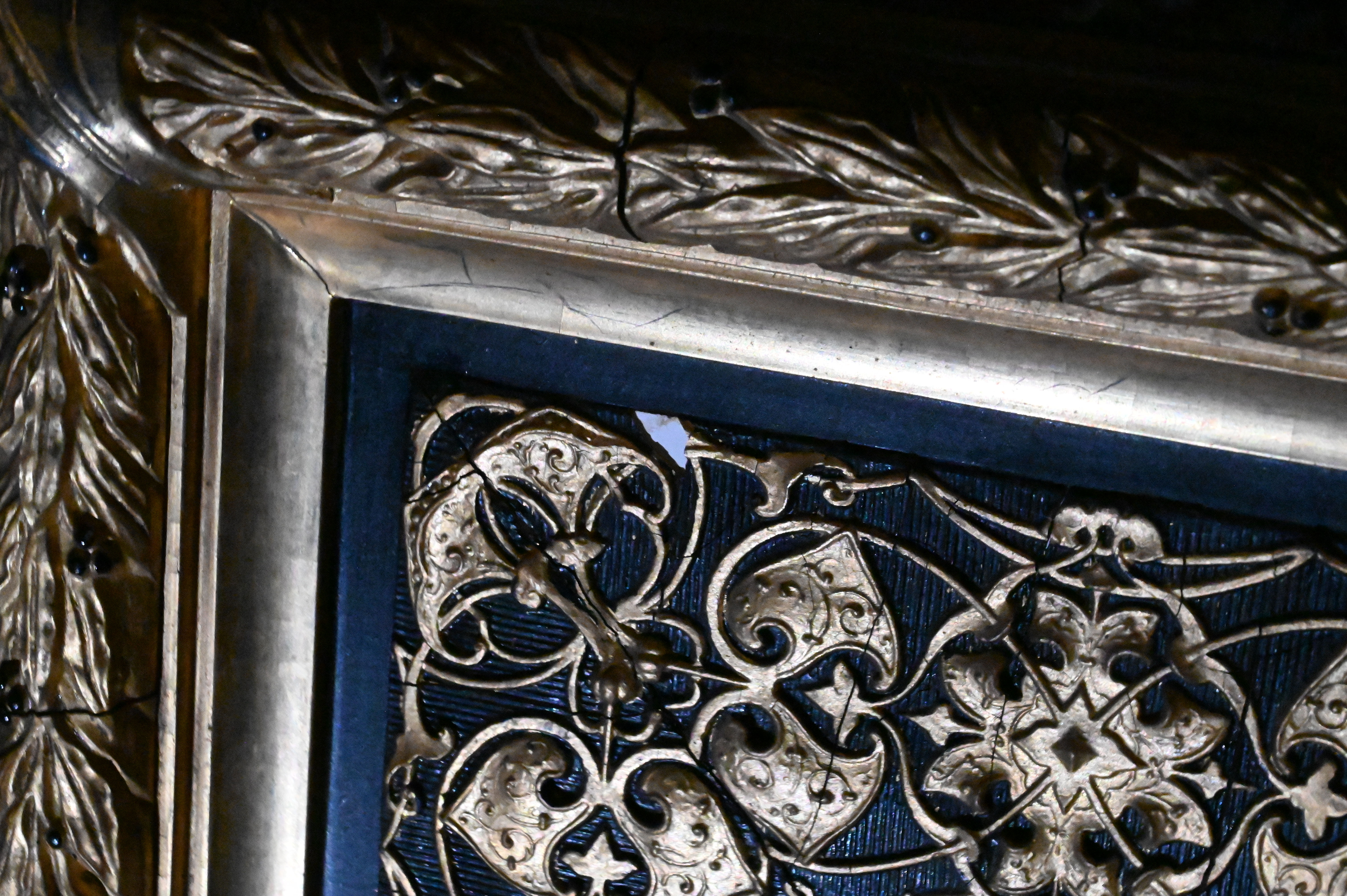 a large and finely crafted late 19th-century mirror frame by the Boston firm Doll & Richards, executed in the neo-Renaissance style, frame featuring a continuous Orientalist motif in hand-tooled gold leaf and painted faux enamel panels, with ebonized moldings and rich surface detailing throughout; an impressive and decorative statement piece reflecting the refined craftsmanship and eclectic design sensibilities of Gilded Age Boston interiors, Boston circa 1890