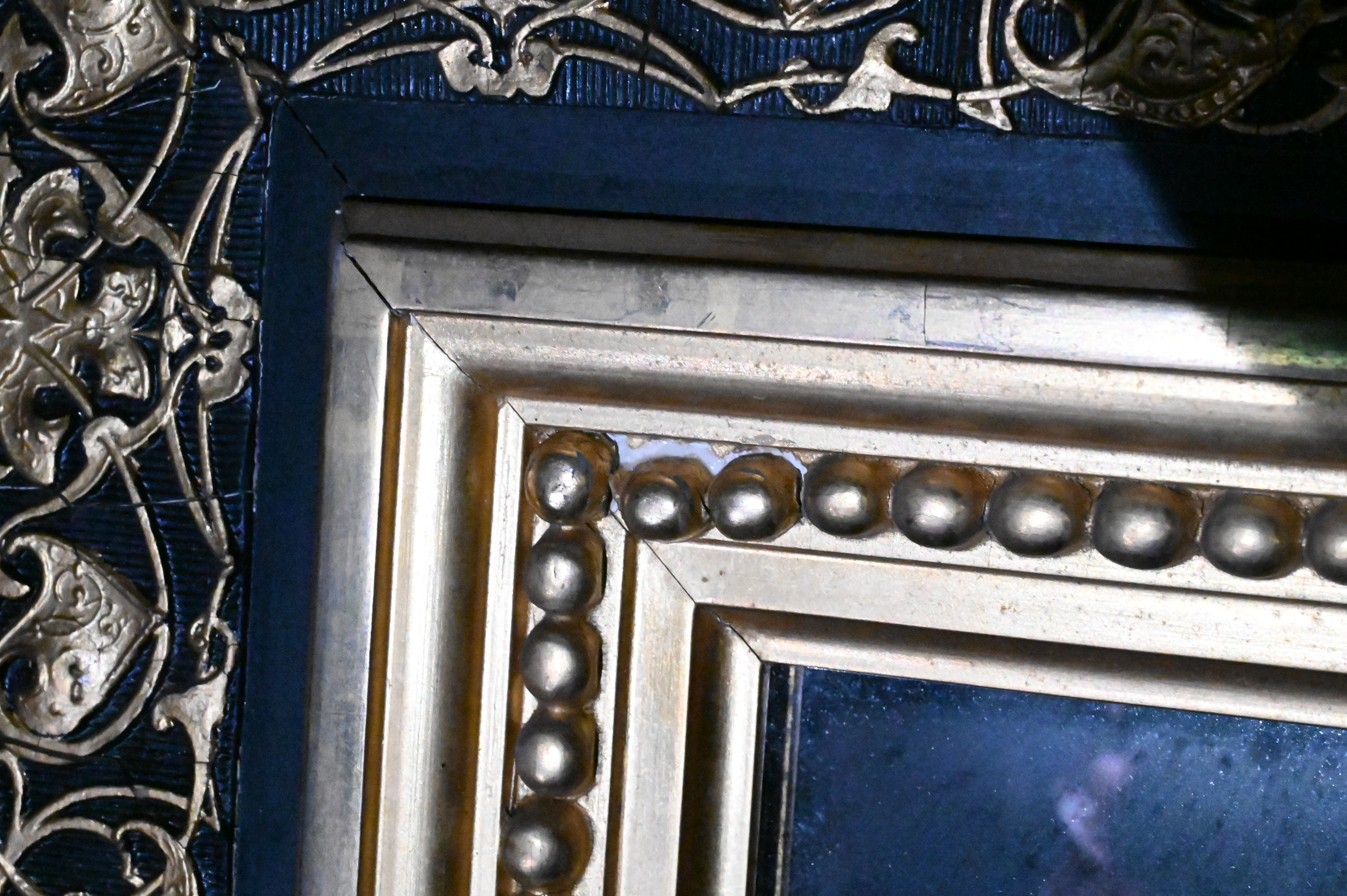 Very good condition, minor loss to black surround, age cracks to frame, slight silvery loss to glass