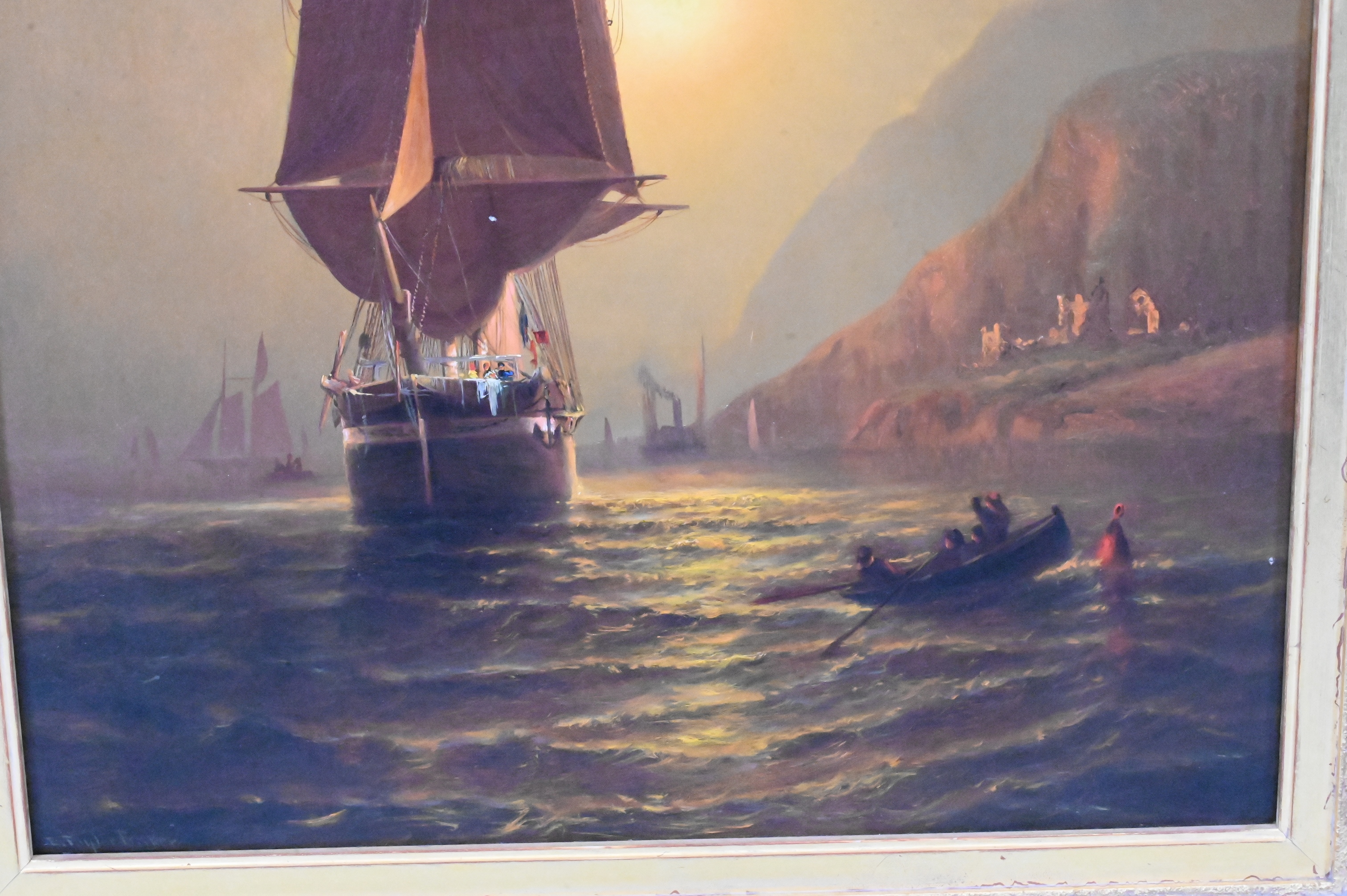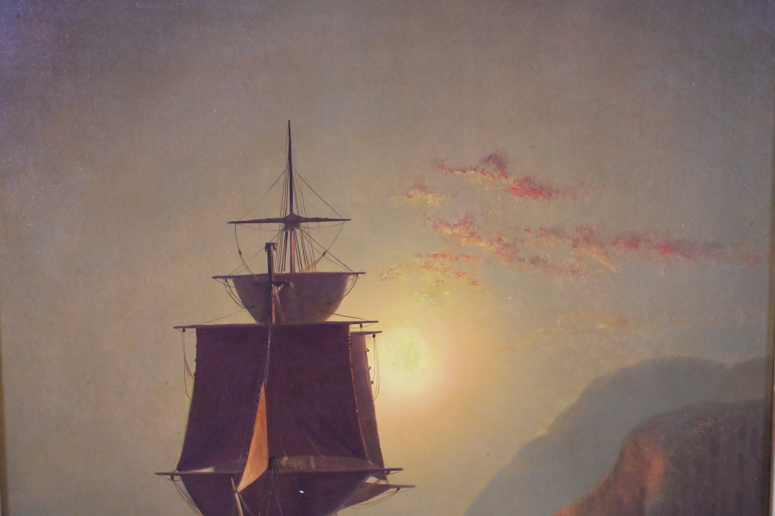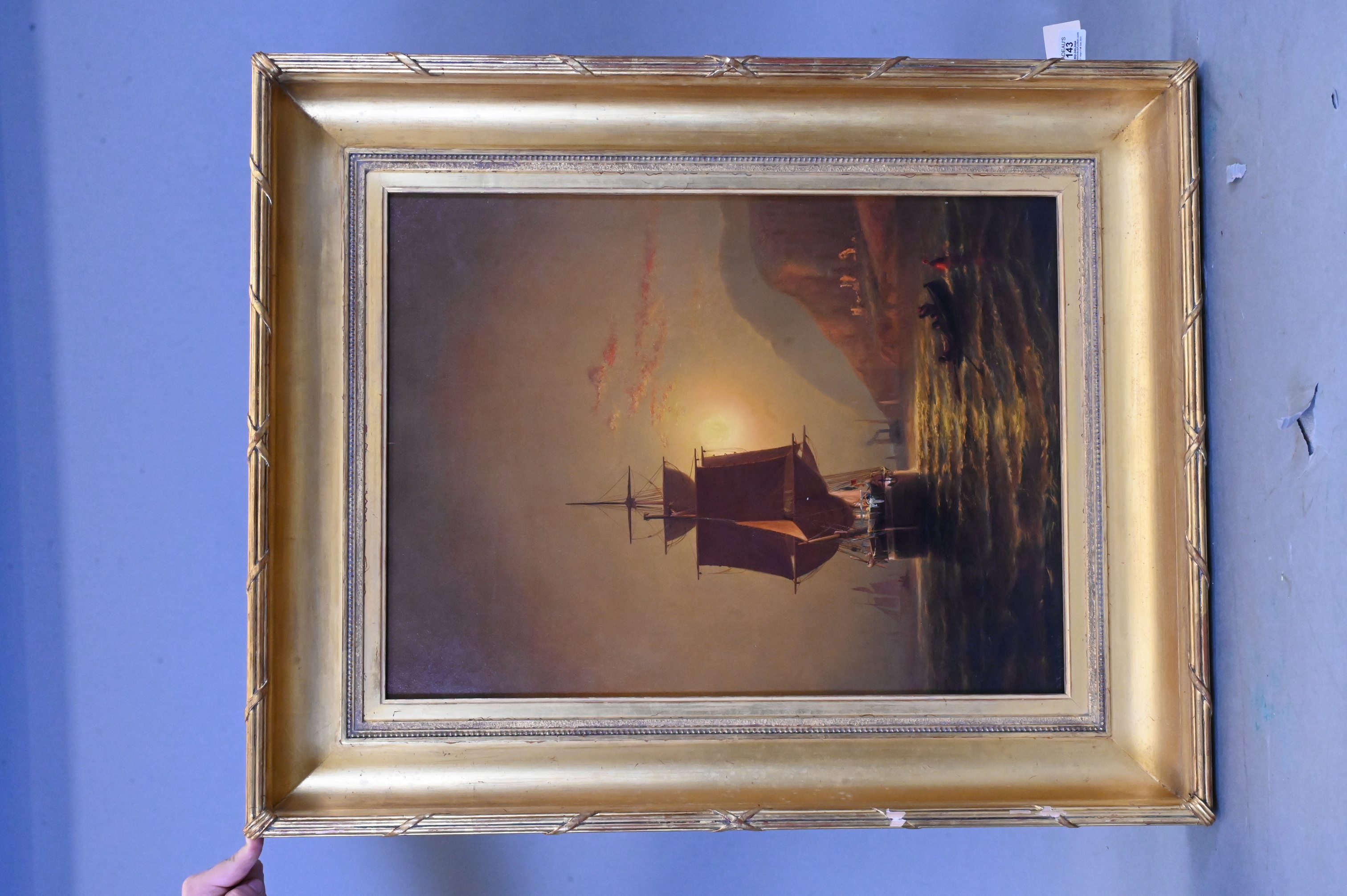 depicting a large sailing vessel with red-brown sails catching the evening light as it approaches shore, smaller boats in the foreground and figures gathered along the rocky coastline, all under a dramatic golden sky.