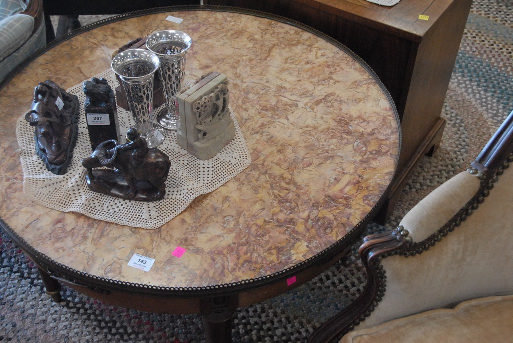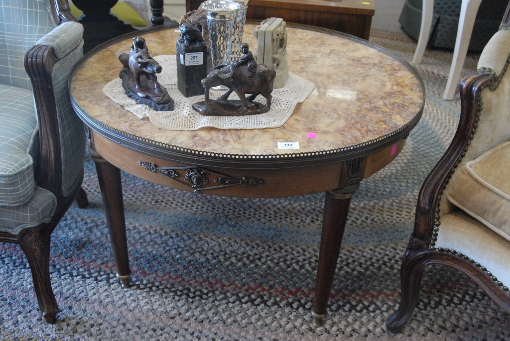 French style marble top coffee table with brass trim, dia. 31 1/2.
