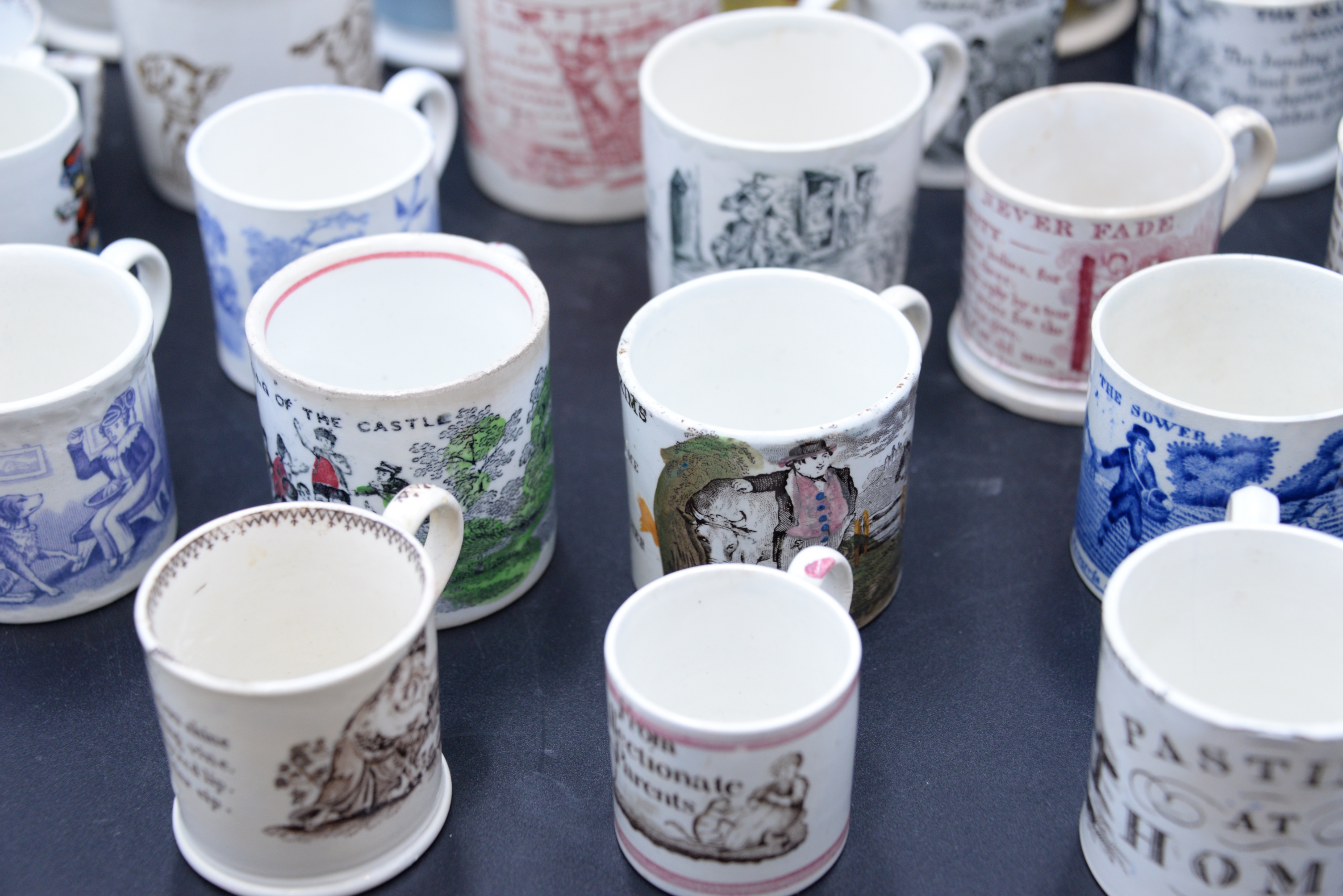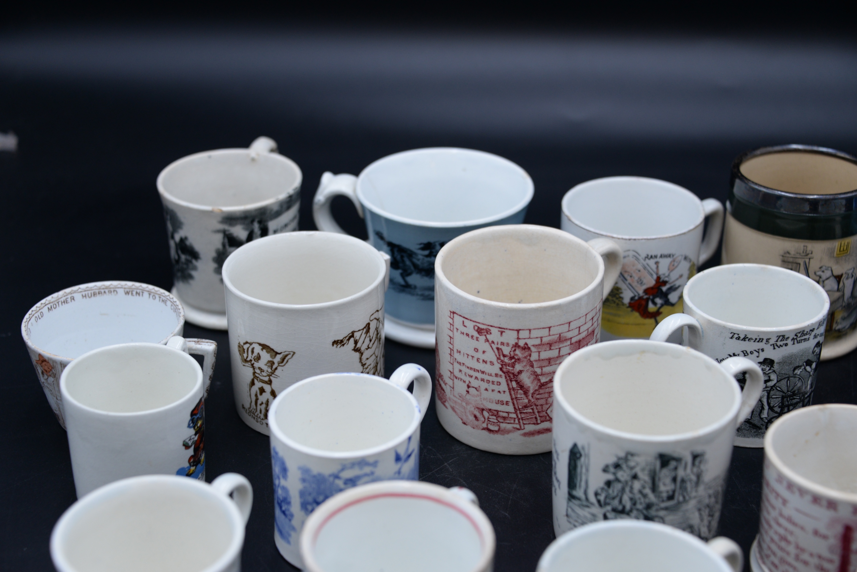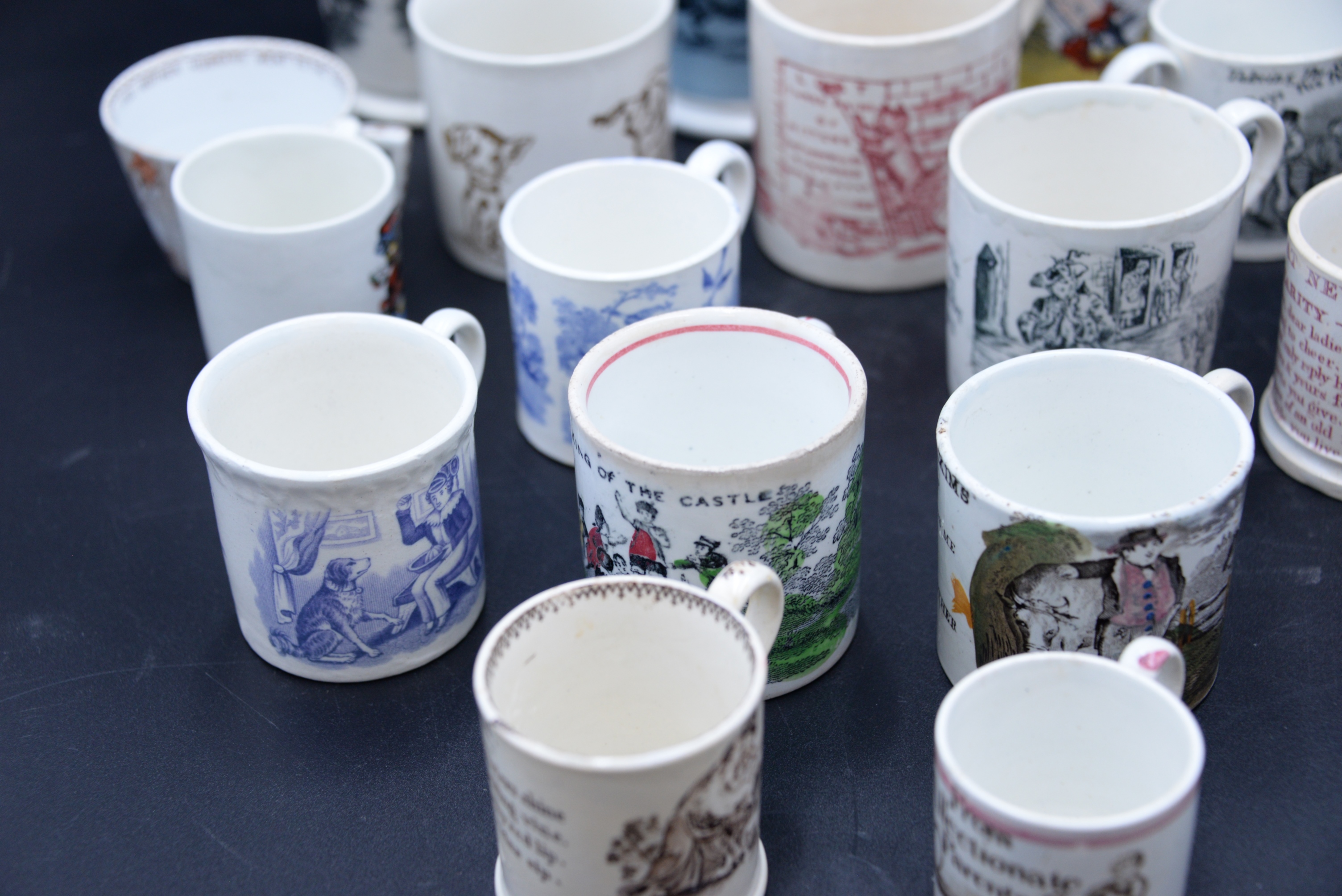 Group of 25 Staffordshire Nursery Rhyme and Month Mugs, heights 2 – 3 1/2 inches.