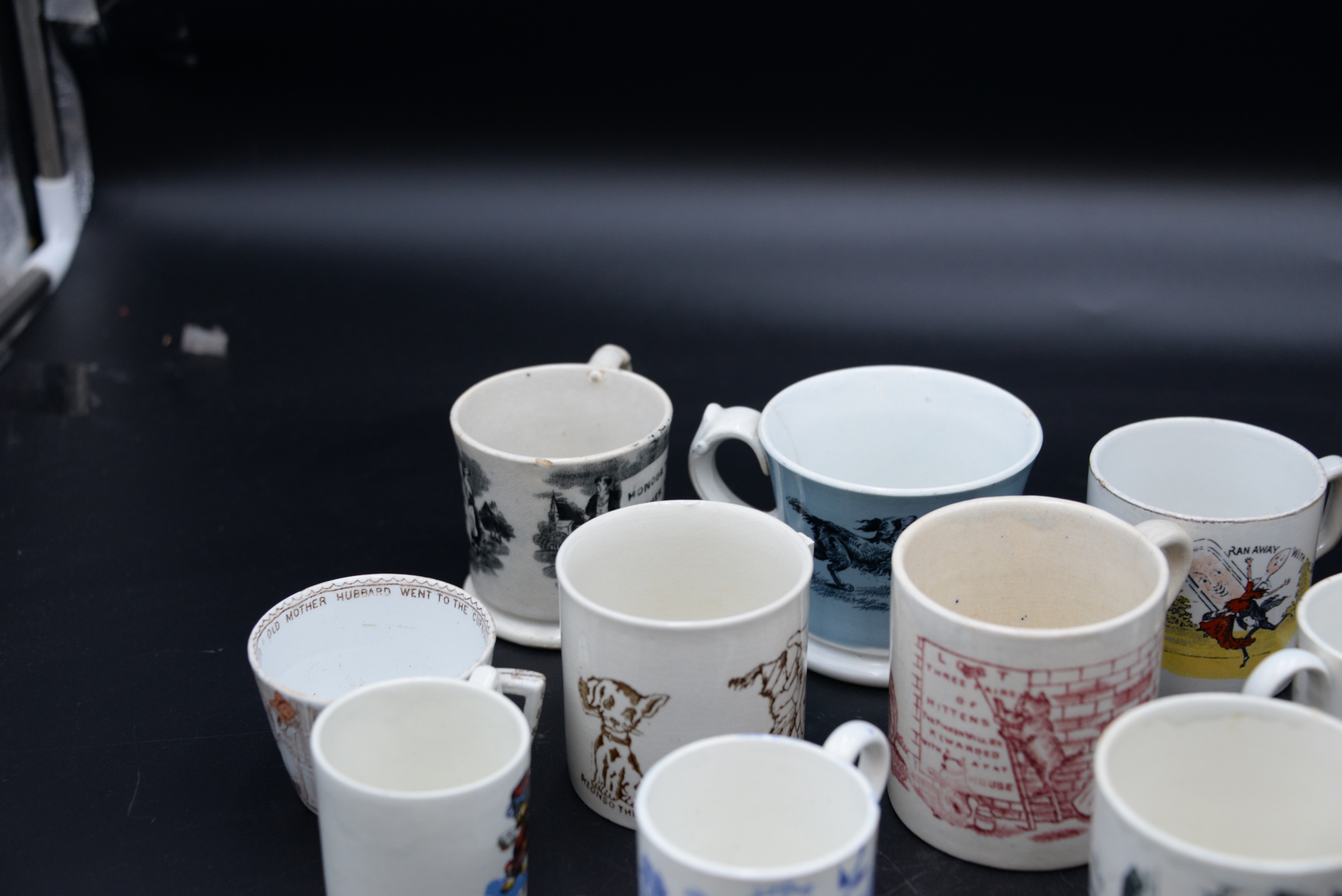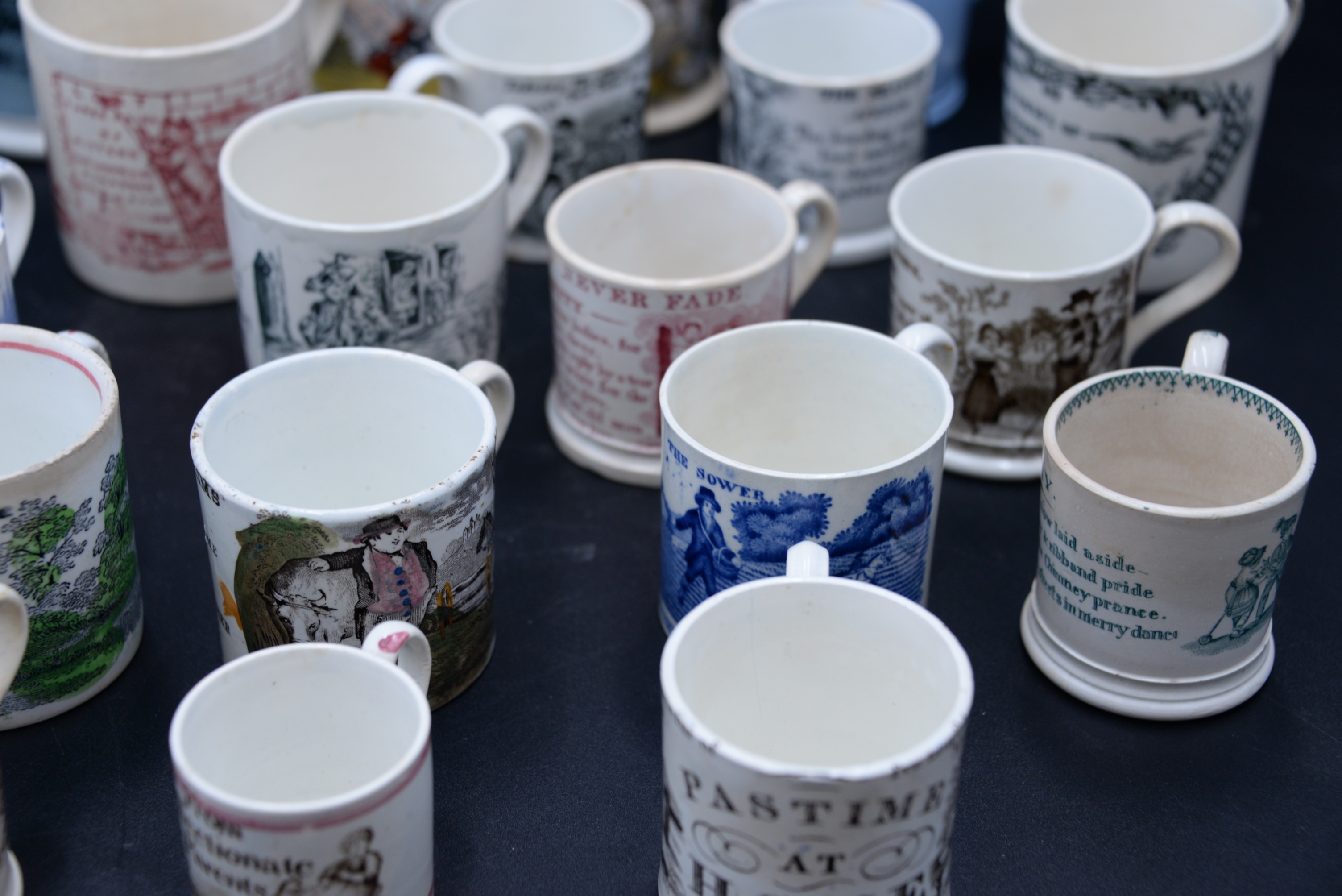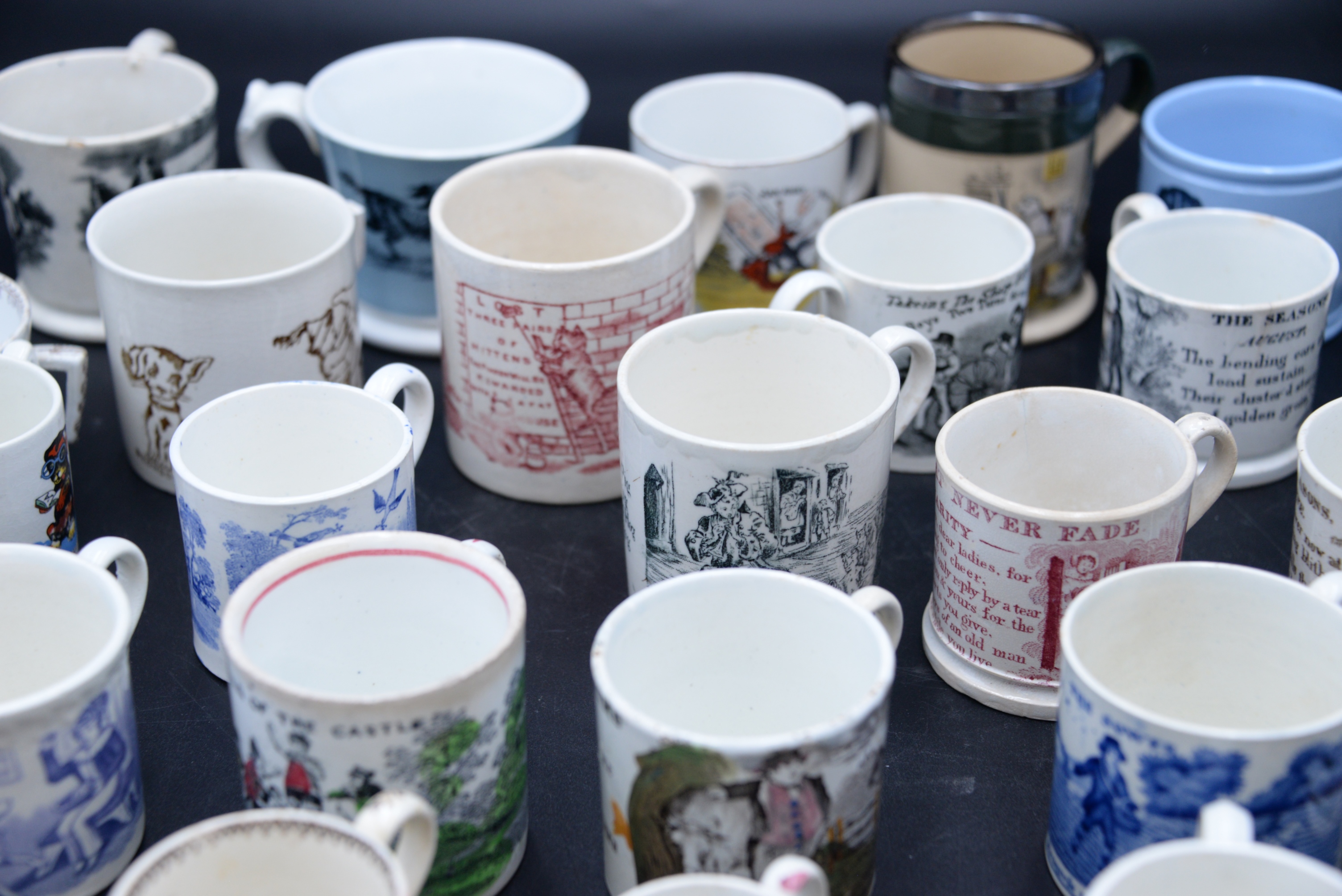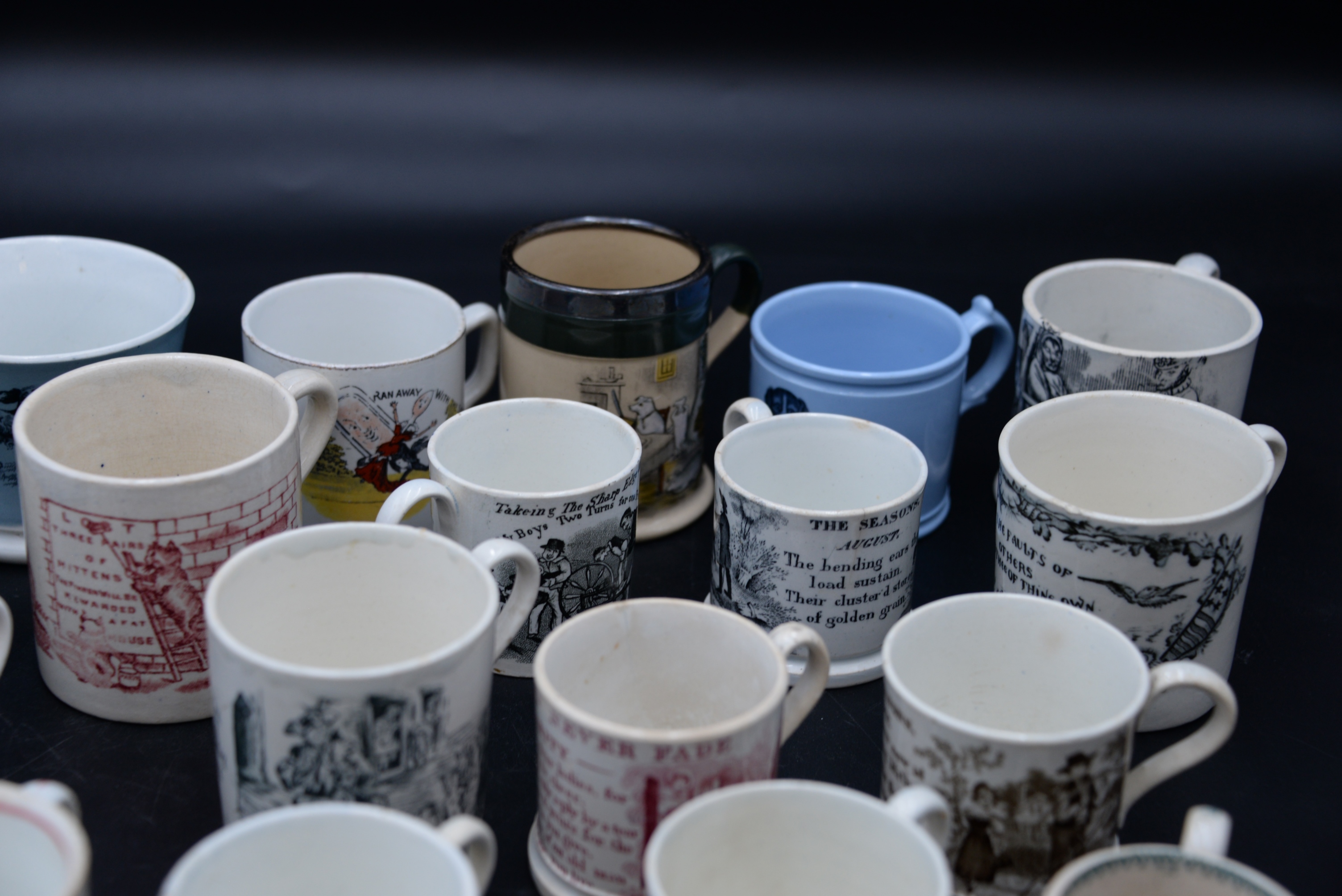 Group of 25 Staffordshire Nursery Rhyme and Month Mugs, heights 2 – 3 1/2 inches.