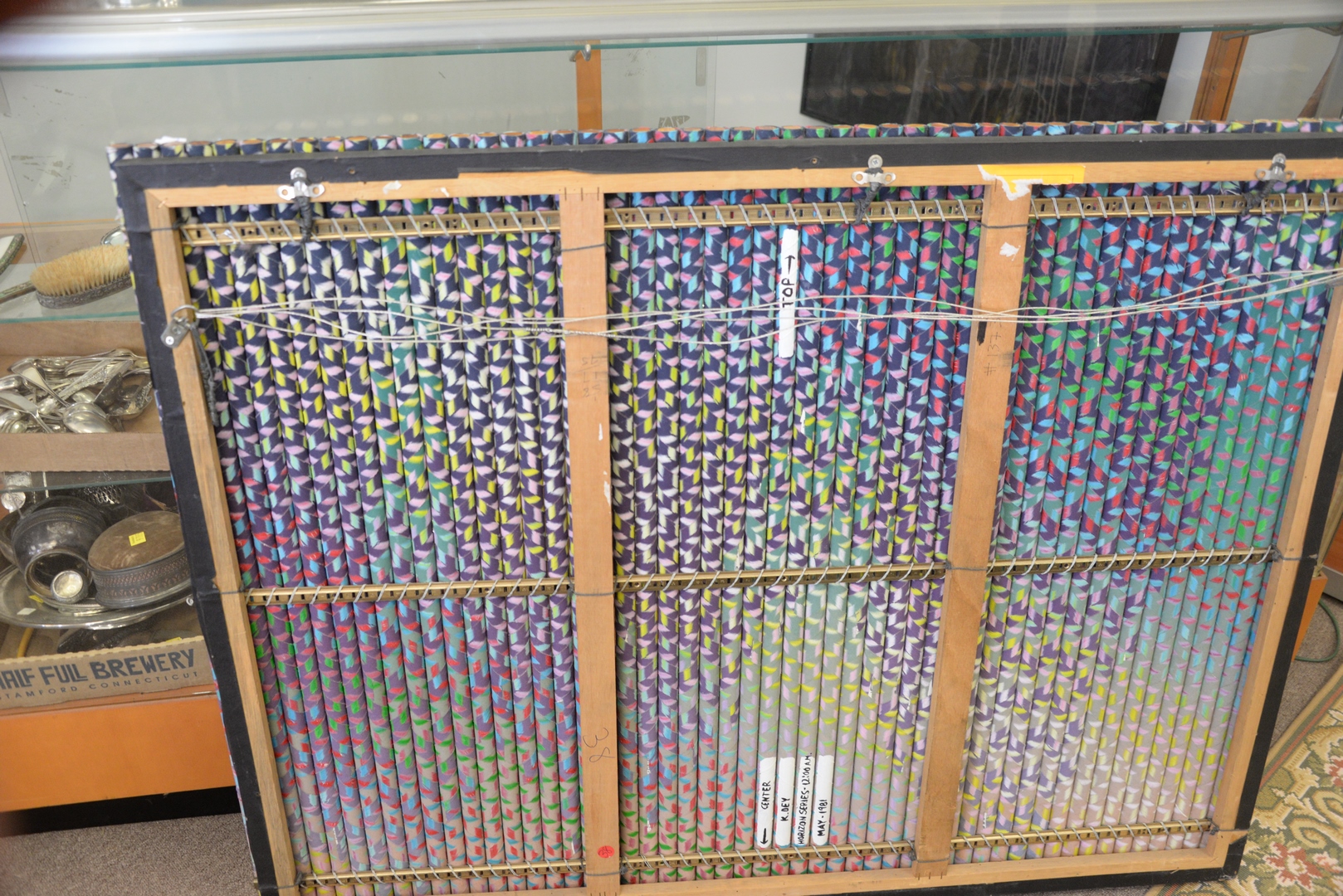 Lot 143: Kris Dey (American, b. 1949), Horizon Series: 12 AM Midnight, 1981, polychrome fabric on dowels; signed and dated lower right “Dey 81″, titled and inscribed on the reverse, overall: 36″ x 48”.