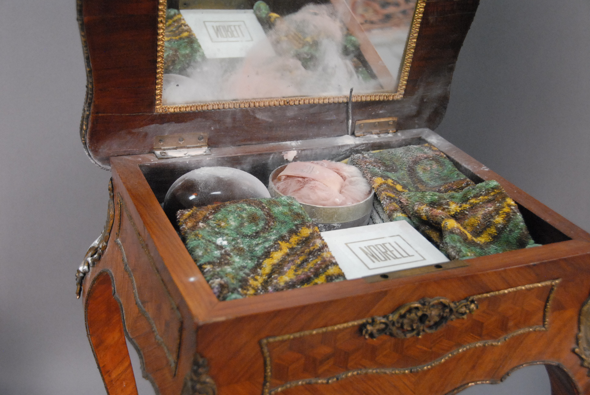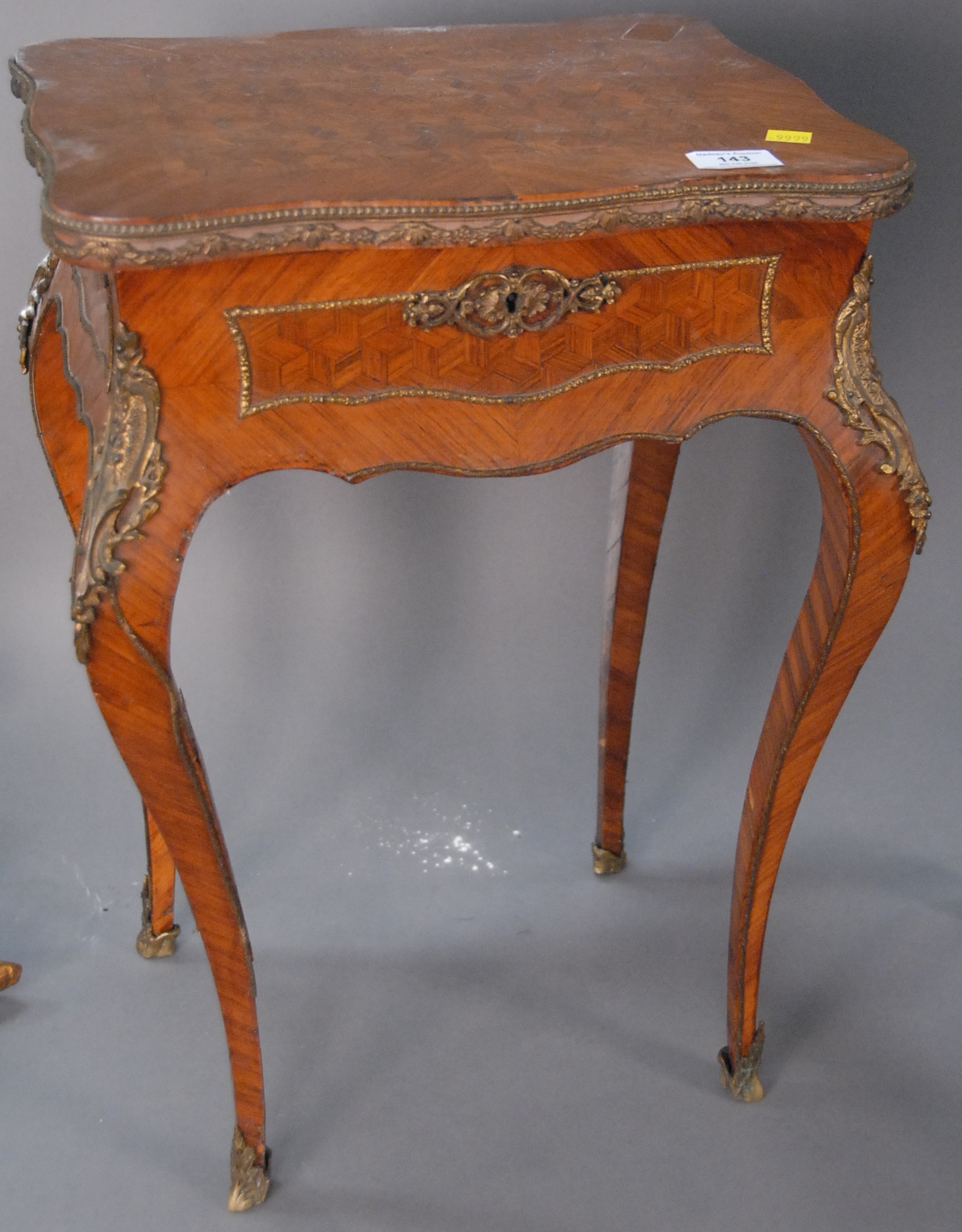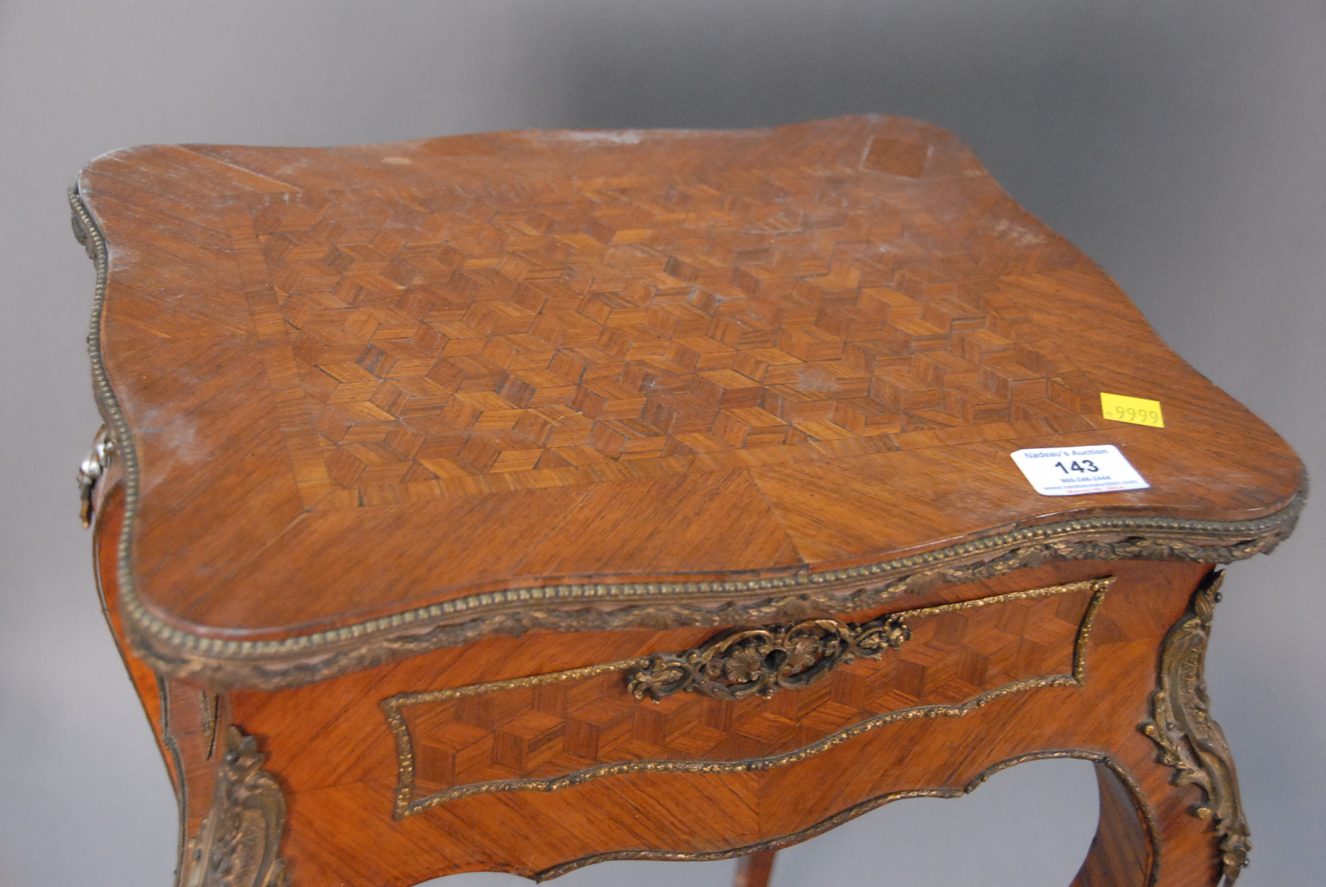 Lot 143: Louis XV style gilt bronze mounted parquetry diminutive jewelry cabinet with lift top, early 20th century missing some elements. ht. 22 1/2in. wd. 15in. dp. 12 1/4in.