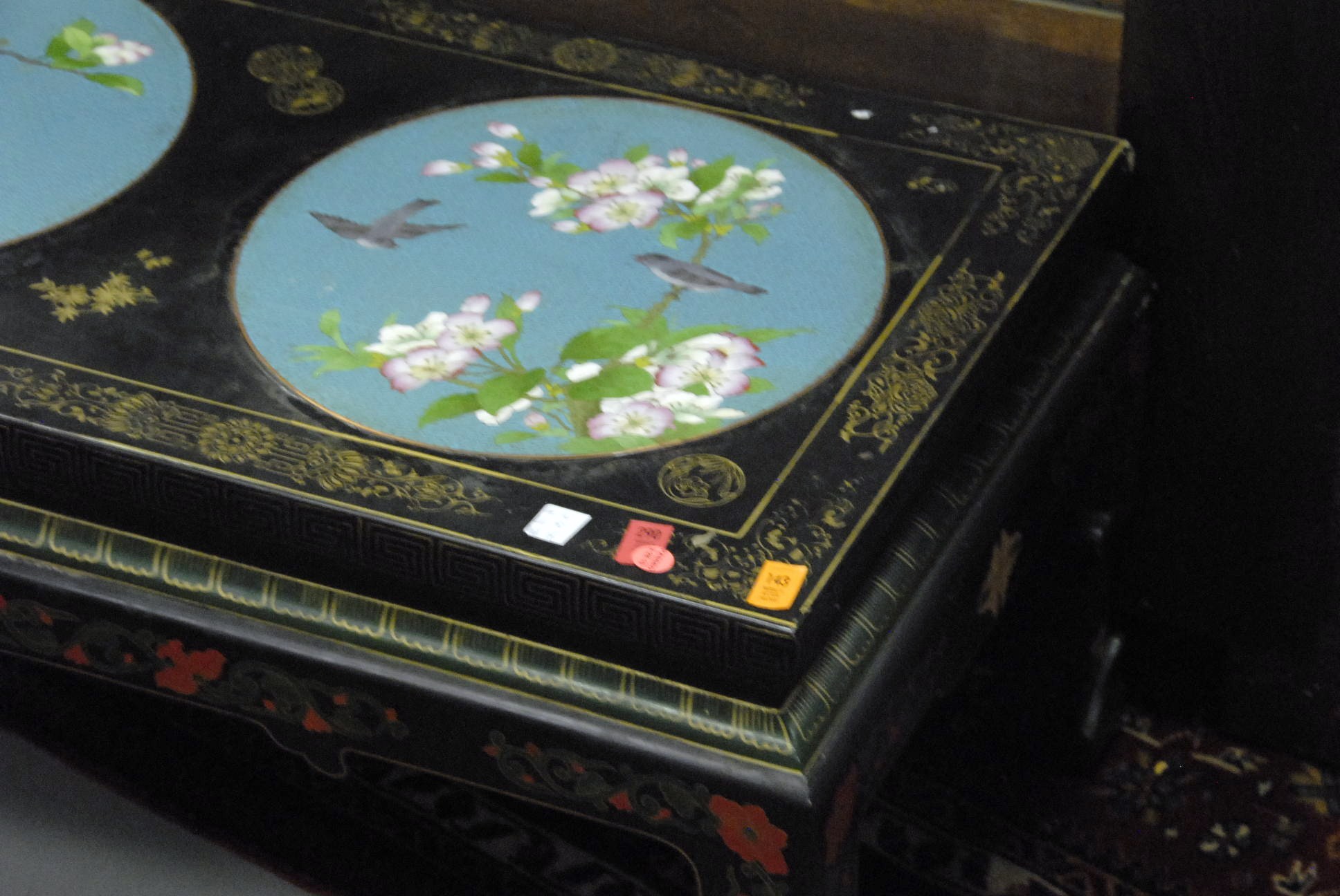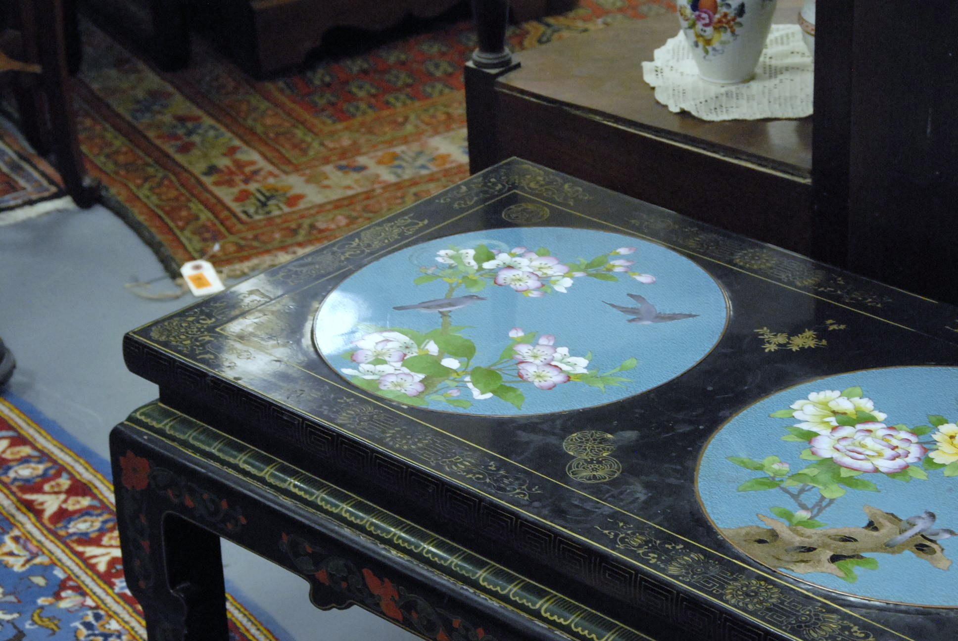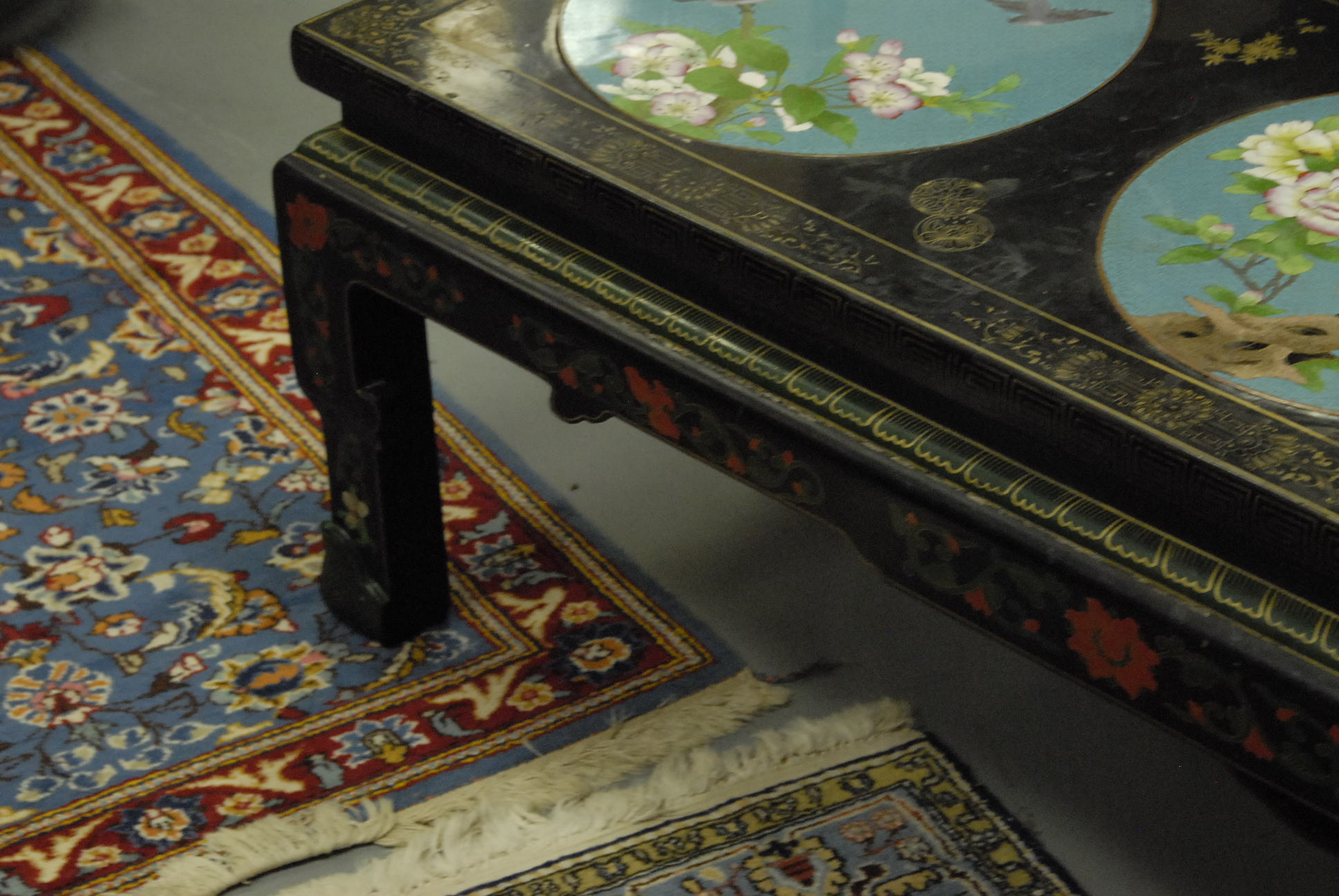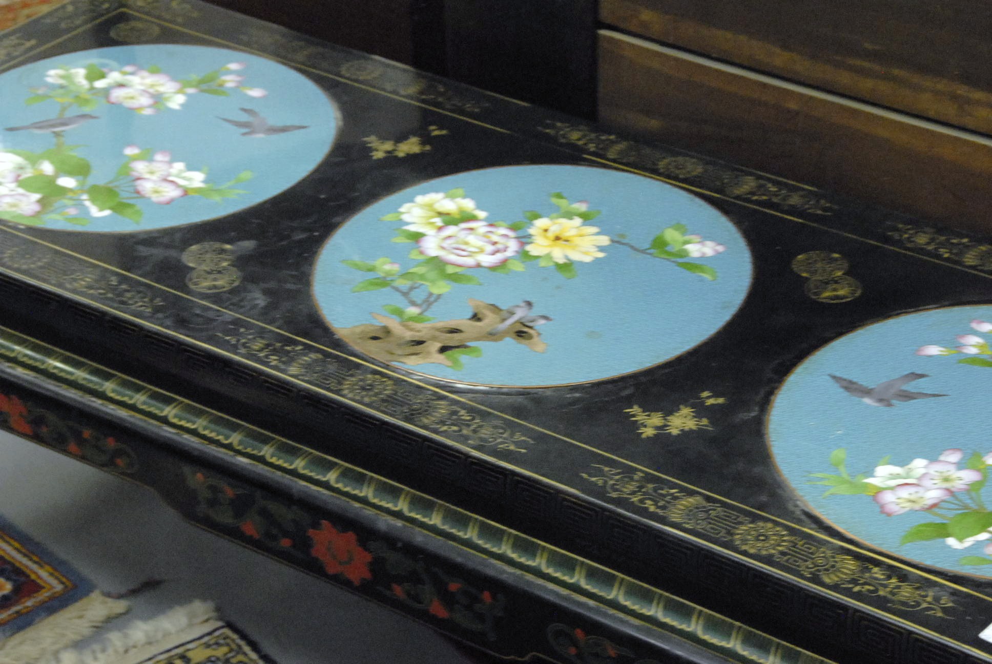 Oriental style coffee table with three cloisonn circular panels